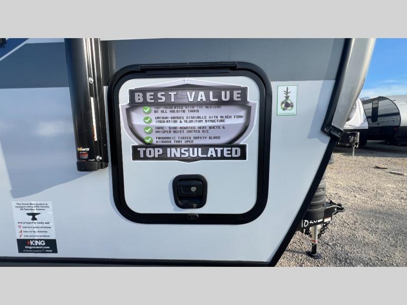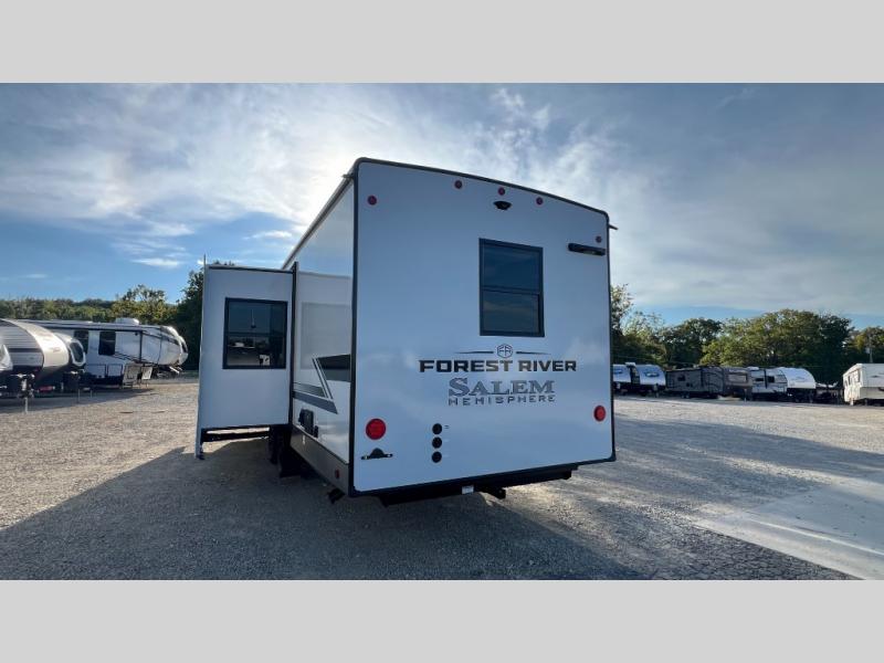 Each Forest River Salem Hemisphere fifth wheel and travel trailer has vacuum bonded "Aluma frame" sidewalls and floors, heated and enclosed dump valves and underbelly for four season-use, and an Ivory performance-colored exterior fiberglass with Smoked Quartz Metallic accents. Other features include a 7-way "rain defense" plug holder in the front frame, extra large pass-through storage, Hudson Wood agreeable grain cabinetry, and designer's choice Herringbone Shaw flooring!