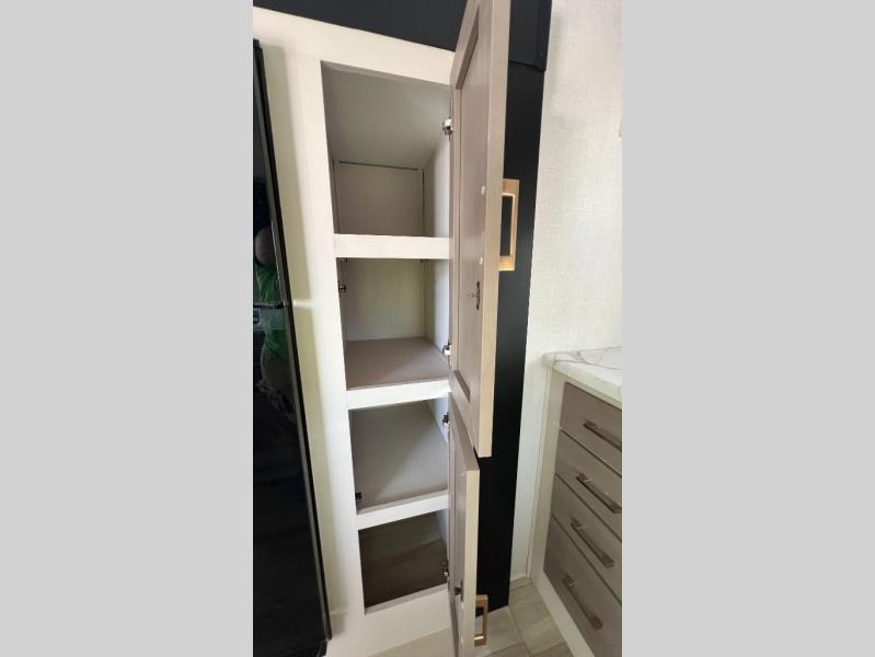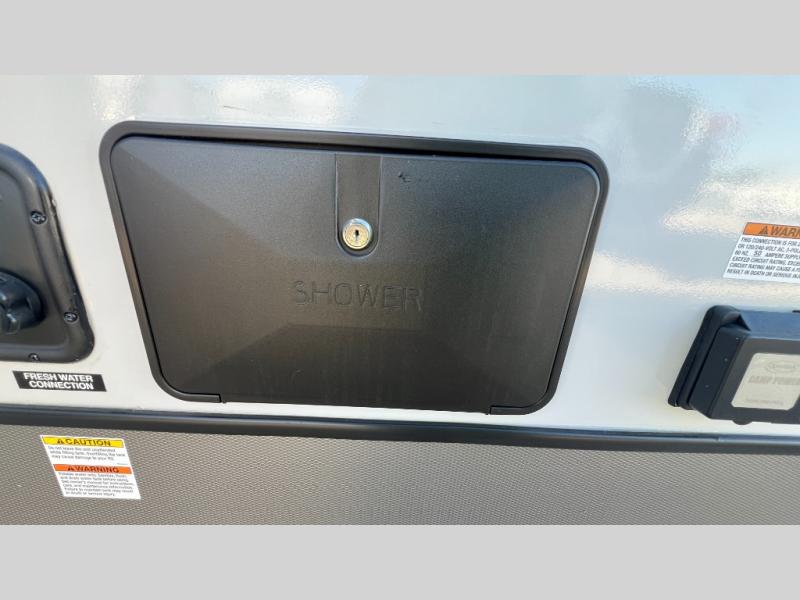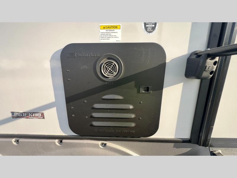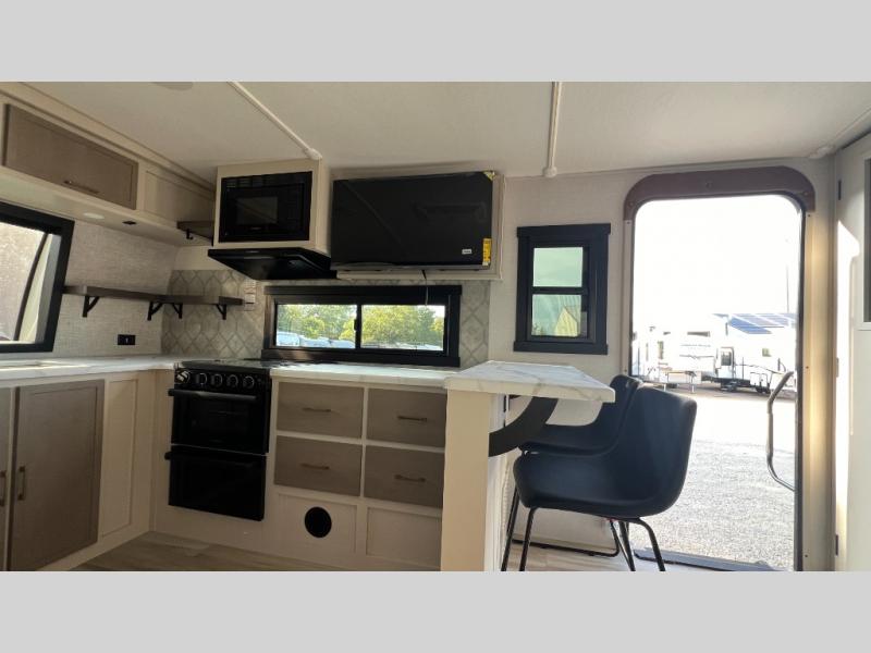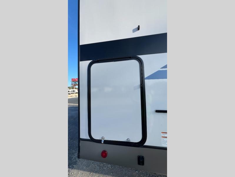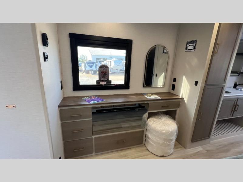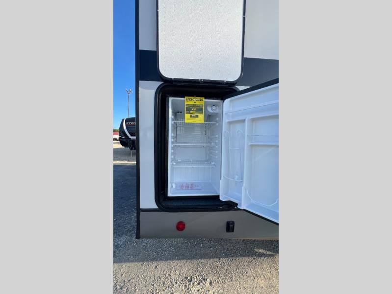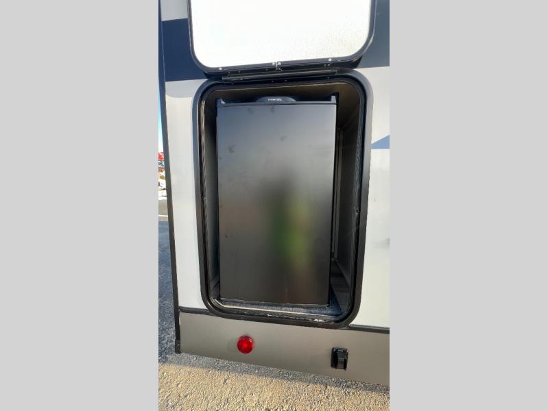 The Salem Hemisphere 261FKRB travel trailer has the perfect floorplan for your next camping adventure! The spacious front kitchen features a panoramic window for enjoying the view, a three-burner cooktop with oven, microwave, 10 cu. ft. 12V refrigerator, walk-in pantry, breakfast bar with seating, and ample counter space for food prep. The living area includes theater seating and a TV. The bedroom has a Versa-Tilt custom king bed, dresser, fireplace, and a vanity area with a seat. The rear full bath includes a walk-in shower with a skylight, large closet with washer/dryer connections, porcelain toilet, and large vanity with two sinks! Enjoy the outdoors with the 22' power awning and outdoor kitchen!