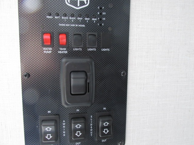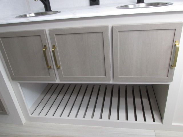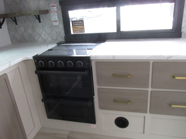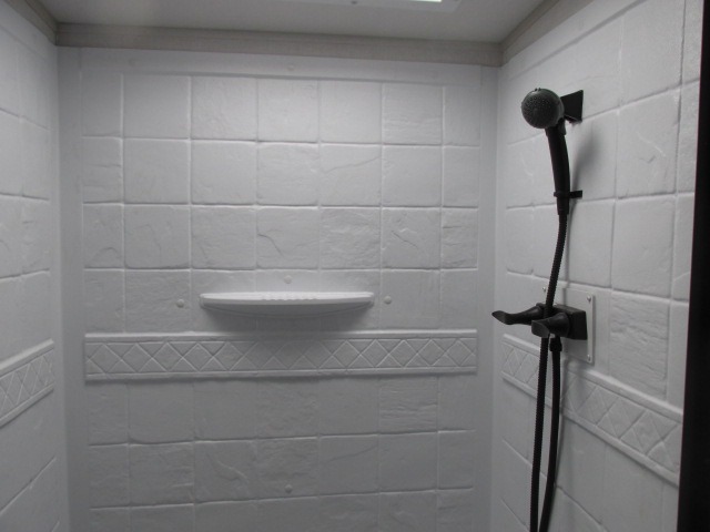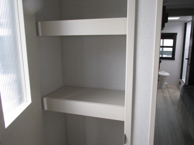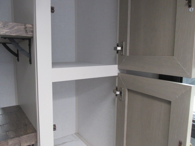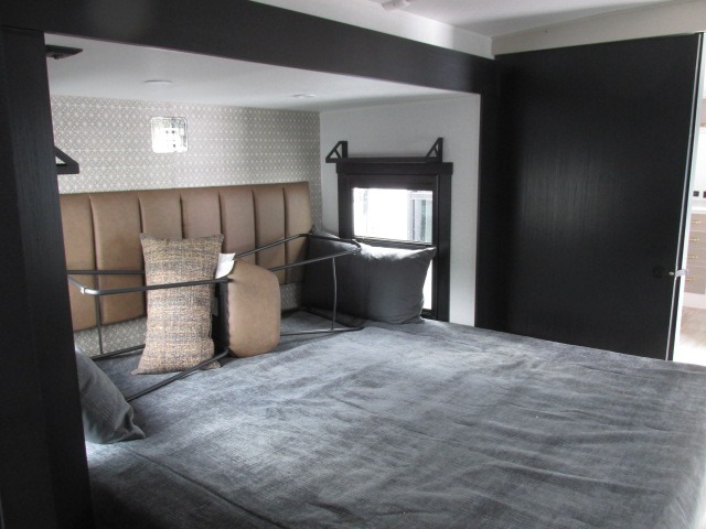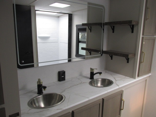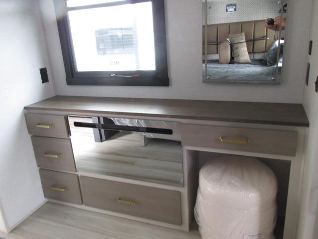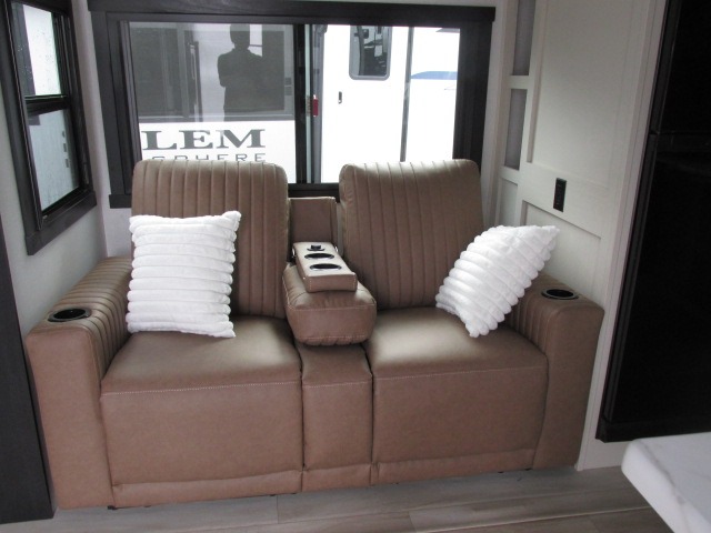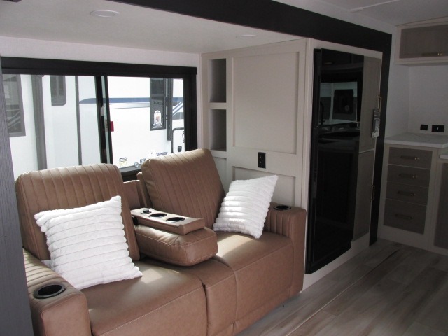 This is the perfect couple's trailer for weekend trips to the campground. The front kitchen includes ample counter space, including a bar top with two stools. You can relax on the theater seat within the slide out here, and the pantry and 12V refrigerator is close by so you can grab a snack. A master bedroom includes a custom king bed slide out, a panoramic window, an ottoman, plus a dresser with a fireplace to make your space cozy. The full rear bath includes dual bath sinks, a walk-in shower with a skylight, plus washer and dryer connections if you want to add those appliances.