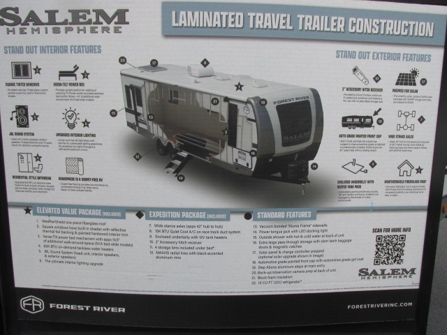 The Salem Hemisphere fifth wheels and travel trailers by Forest River are packed with features, while still being value-minded! Each model is constructed with laminated "Aluma Frame" sidewalls and floor with block foam insulation plus full length barreled ceilings for added head space. There are LED awning, marker and tail lights outside, along with an extra large pass-thru storage with slam latch baggage doors, plus solar prep and Lippert On-The-Go ladder prep. The 60K on-demand tankless water heater will provide endless hot showers, and the JBL sound system includes a head unit plus interior and exterior speakers to keep the party going. There are also many interior comforts found throughout that will make you feel right at home!