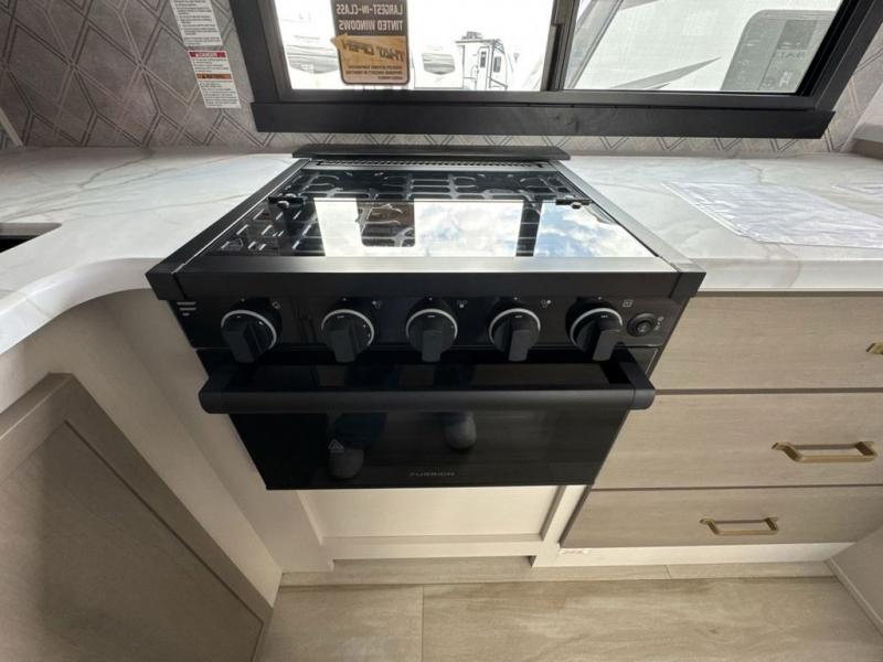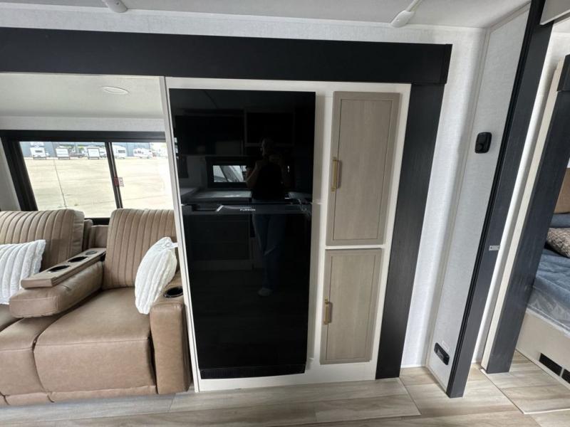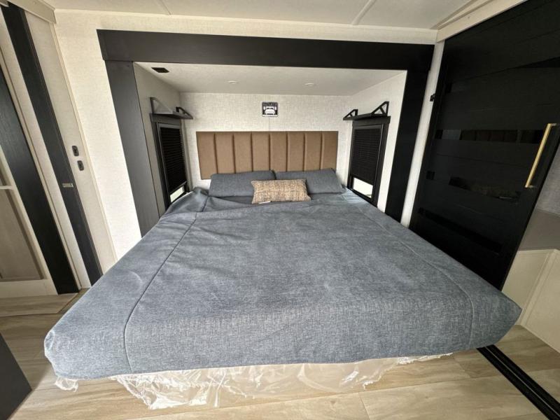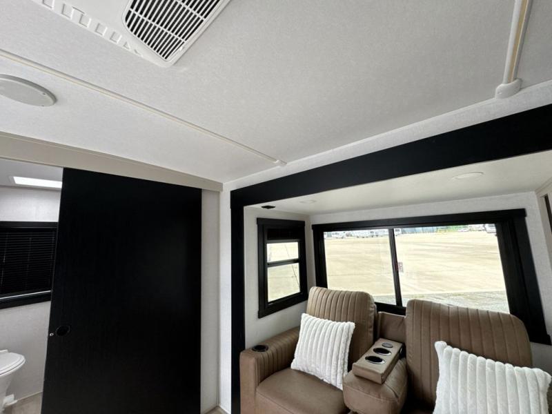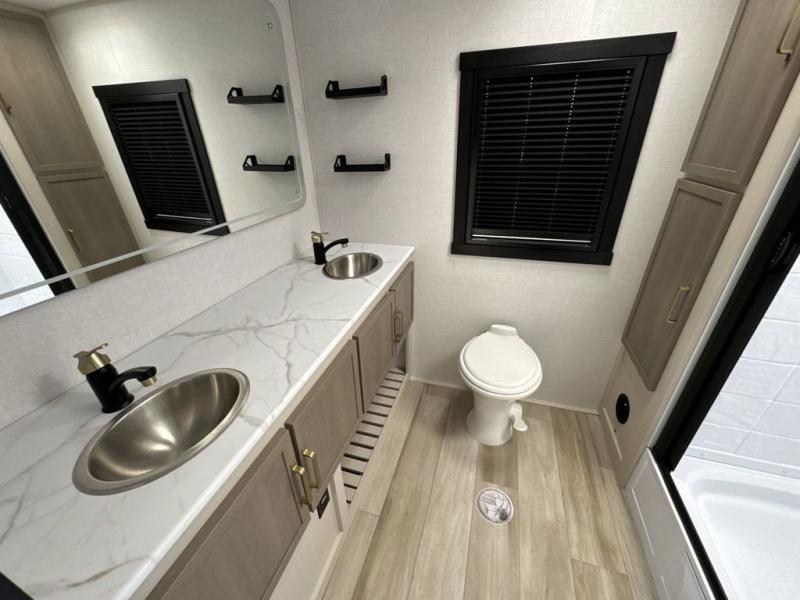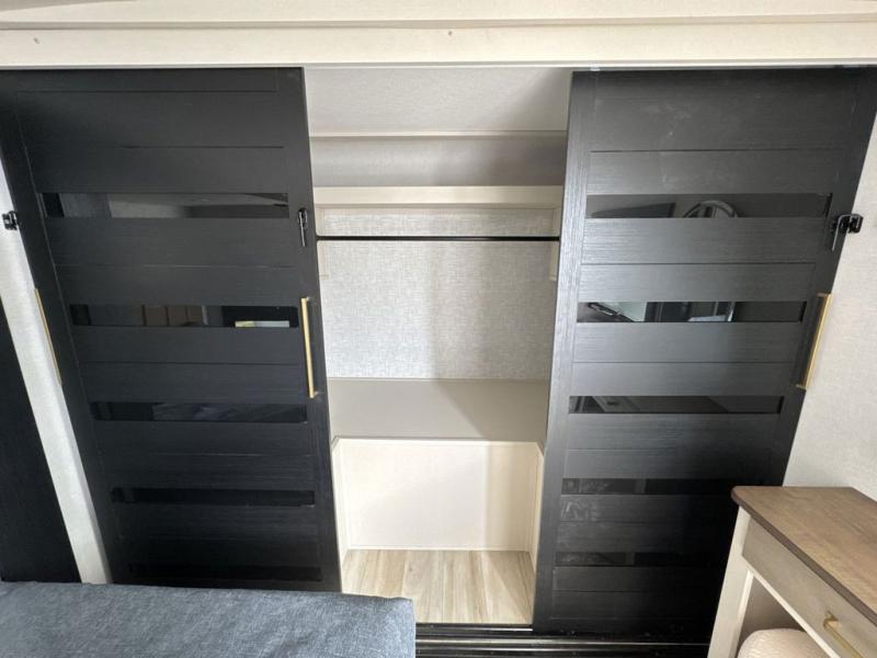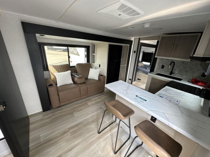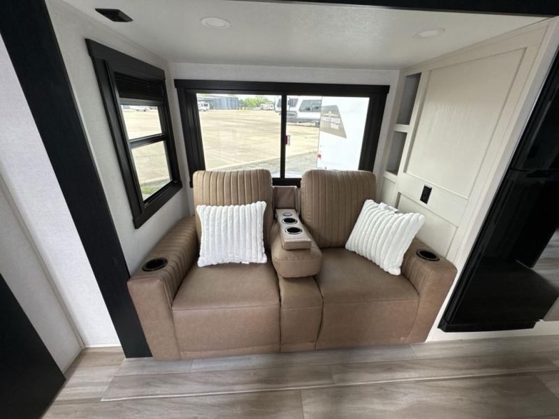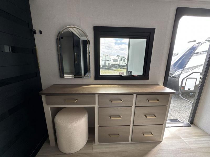 This is the perfect couple's trailer for weekend trips to the campground. The middle kitchen includes ample counter space with two stools where you can enjoy your breakfast at. You can relax on the theater seat within the slide out here, and the pantry and 12V refrigerator is close by so you can grab a snack. A front private bedroom includes a king bed slide out, a large front wardrobe with washer and dryer prep, a dresser, and a vanity with an ottoman. The full rear bath includes dual bath sinks, a walk-in shower with a skylights, and a linen closet to keep towels close by.
