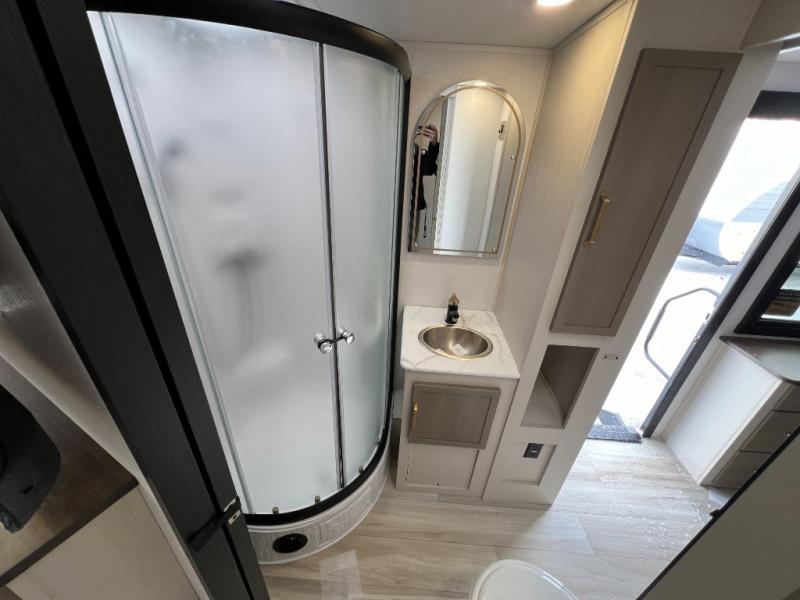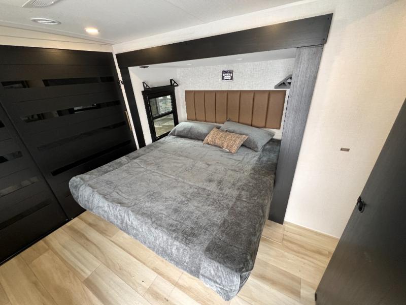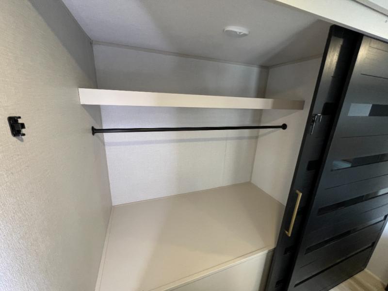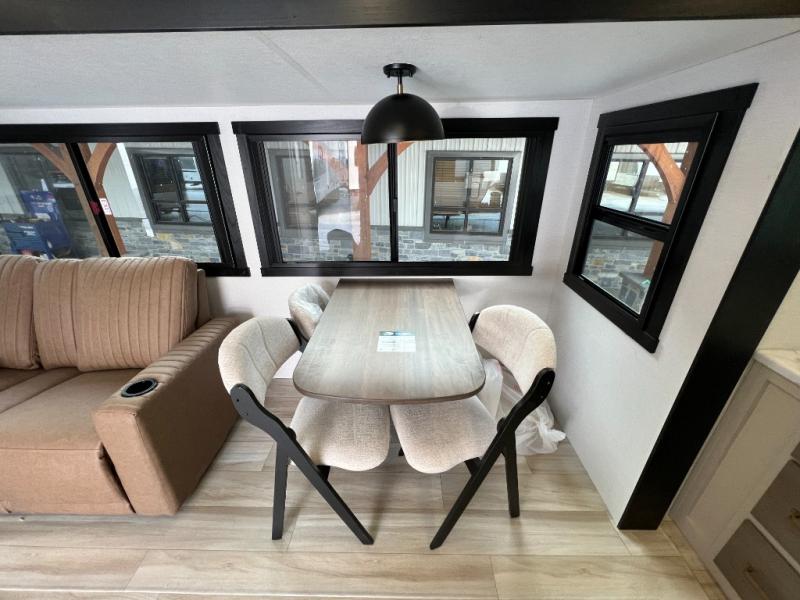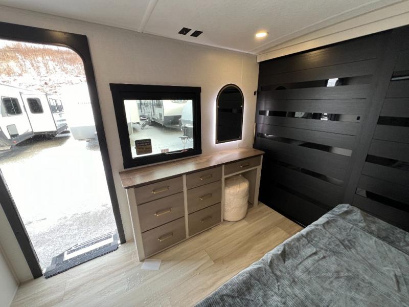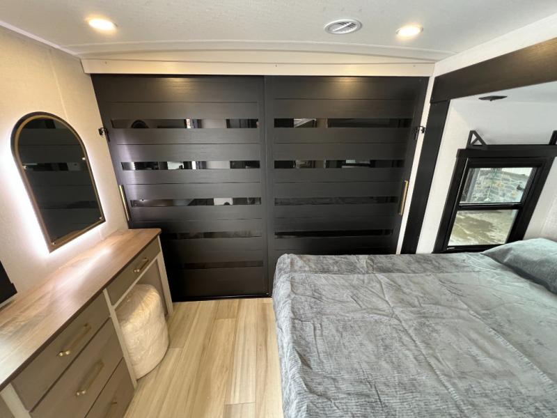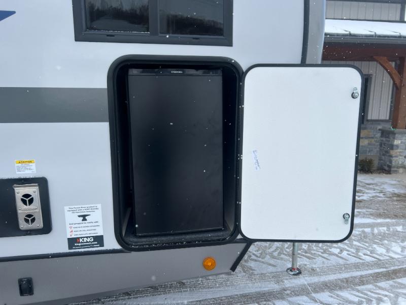 Once you step inside this dual entry travel trailer, you won't want to camp any other way! The rear private bedroom will have you feeling right at home with the custom king bed across from a dresser with a TV hookup, a large bedroom wardrobe, and there is even a closet with washer/dryer prep. The dual entry bath makes it easy for everyone to access and it has a radius shower with a skylight above for added natural lighting as you get ready each morning. Both the theater seating and the booth dinette have a panoramic window for you to look out at your beautiful scenery. The chef of the group will love cooking in the front kitchen with all of the extra countertop space, as well as outdoors with the outside kitchen!