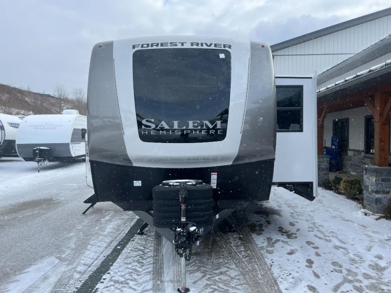 The Salem Hemisphere fifth wheels and travel trailers by Forest River are packed with features, while still being value-minded! Each model is constructed with laminated "Aluma Frame" sidewalls and floor with block foam insulation plus full length barreled ceilings for added head space. There are LED awning, marker and tail lights outside, along with an extra large pass-thru storage with slam latch baggage doors, plus solar prep and Lippert On-The-Go ladder prep. The 60K on-demand tankless water heater will provide endless hot showers, and the JBL sound system includes a head unit plus interior and exterior speakers to keep the party going. There are also many interior comforts found throughout that will make you feel right at home!