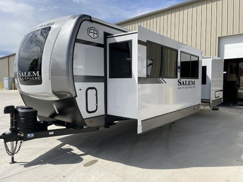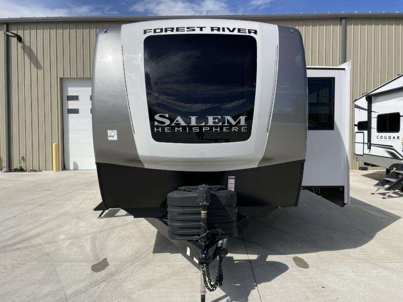 The Salem Hemisphere fifth wheels and travel trailers by Forest River are packed with features, while still being value-minded! Each model is constructed with laminated "Aluma Frame" sidewalls and floor with block foam insulation plus full length barreled ceilings for added head space. There are LED awning, marker and tail lights outside, along with an extra large pass-thru storage with slam latch baggage doors, plus solar prep and Lippert On-The-Go ladder prep. The 60K on-demand tankless water heater will provide endless hot showers, and the JBL sound system includes a head unit plus interior and exterior speakers to keep the party going. There are also many interior comforts found throughout that will make you feel right at home!