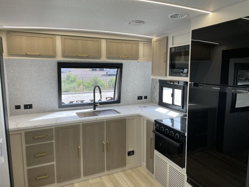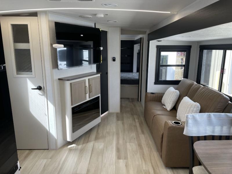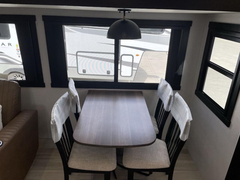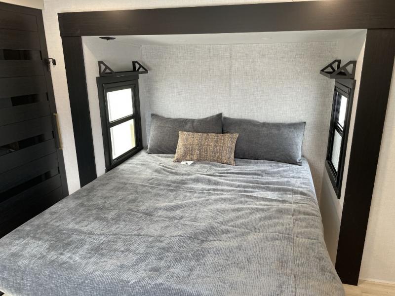 Once you step inside this dual entry travel trailer, you won't want to camp any other way! The rear private bedroom will have you feeling right at home with the custom king bed across from a dresser with a TV hookup, a large bedroom wardrobe, and there is even a closet with washer/dryer prep. The dual entry bath makes it easy for everyone to access and it has a radius shower with a skylight above for added natural lighting as you get ready each morning. Both the theater seating and the booth dinette have a panoramic window for you to look out at your beautiful scenery. The chef of the group will love cooking in the front kitchen with all of the extra countertop space, as well as outdoors with the outside kitchen!