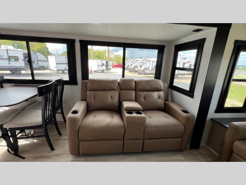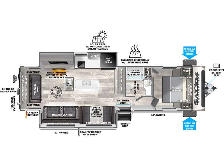 Each Forest River Salem Hemisphere fifth wheel and travel trailer has vacuum bonded "Aluma frame" sidewalls and floors, heated and enclosed dump valves and underbelly for four season-use, and an Ivory performance-colored exterior fiberglass with Smoked Quartz Metallic accents. Other features include a 7-way "rain defense" plug holder in the front frame, extra large pass-through storage, Hudson Wood agreeable grain cabinetry, and designer's choice Herringbone Shaw flooring!