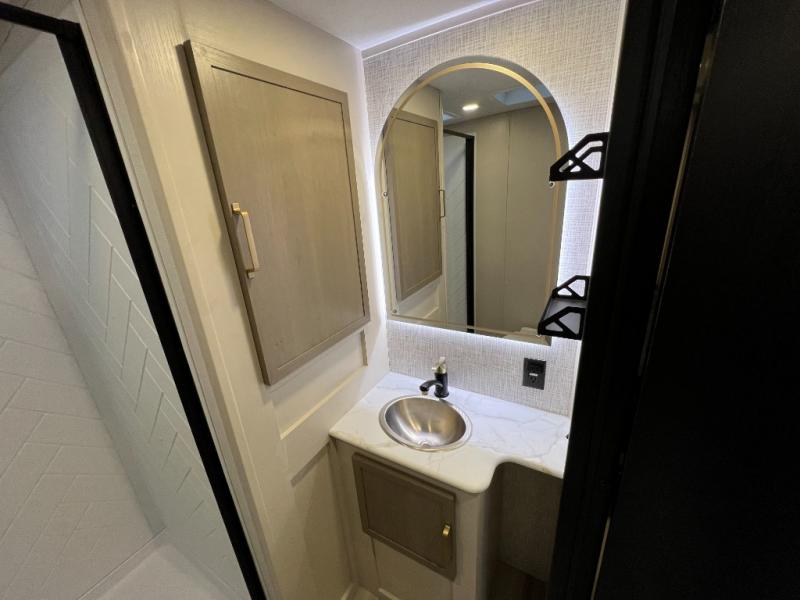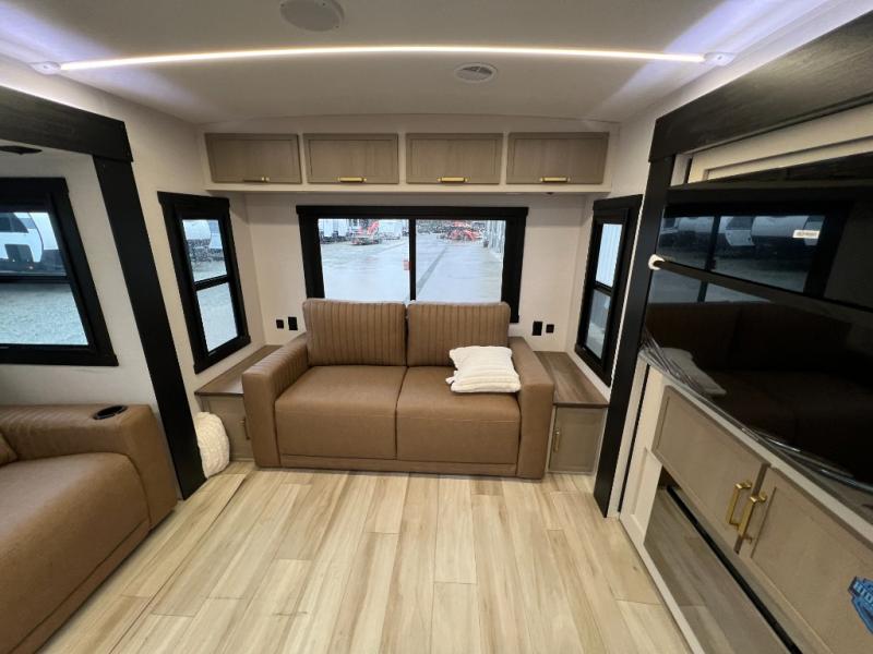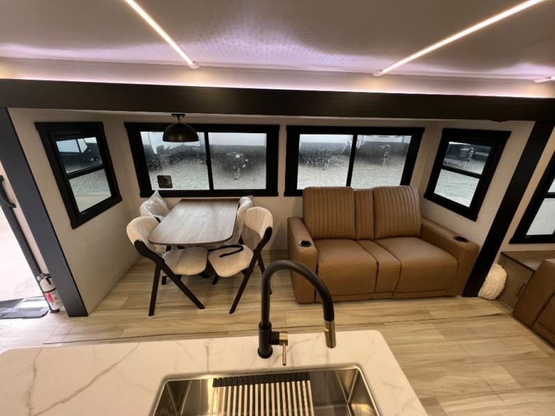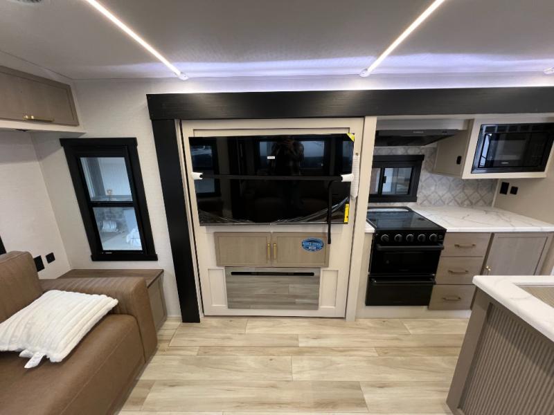 Step inside this luxurious travel trailer and see all that it has to offer! You will enjoy a good night's rest each night on the queen bed with Versa Tilt with wardrobes on either side to keep your clothes wrinkle free, and if you have a couple of guests then you can convert the rear tri-fold sofa or the booth dinette into a sleeping space. The 30" x 36" walk-in shower with a skylight above invites you to take a hot, steamy shower after a fun-filled day outdoors. Once you're cleaned up, you can grab some leftovers from the 10 cu. ft. 12V black refrigerator and warm it up in the microwave. There is also theatre seating across from the 50" LED TV with a fireplace below!