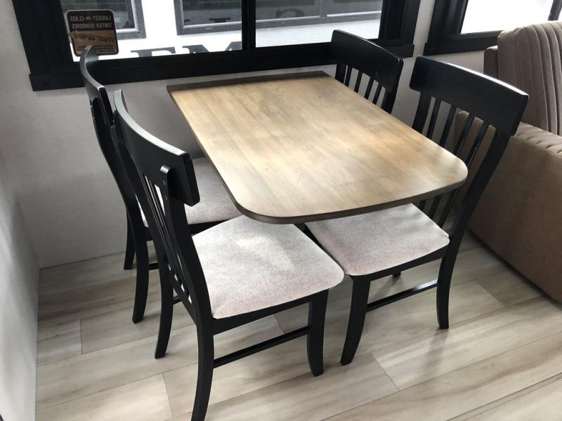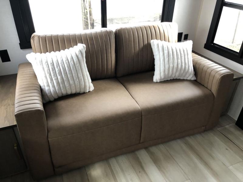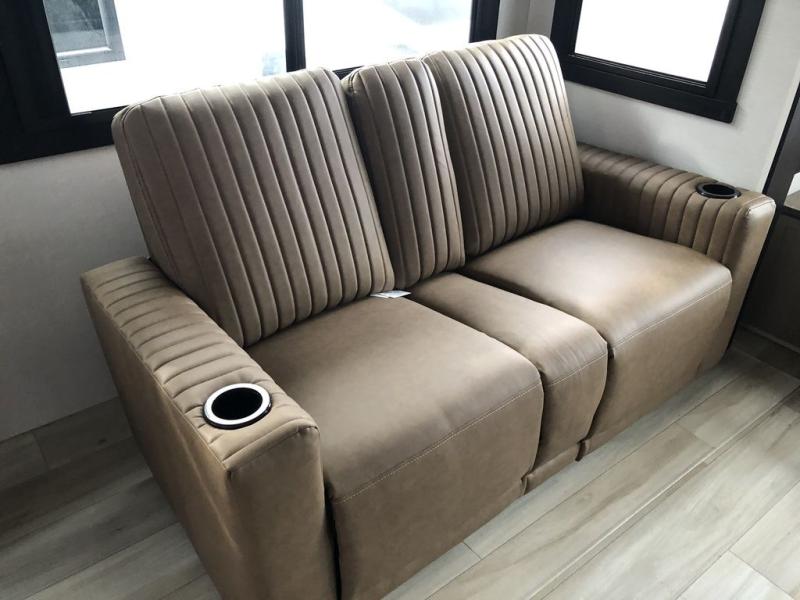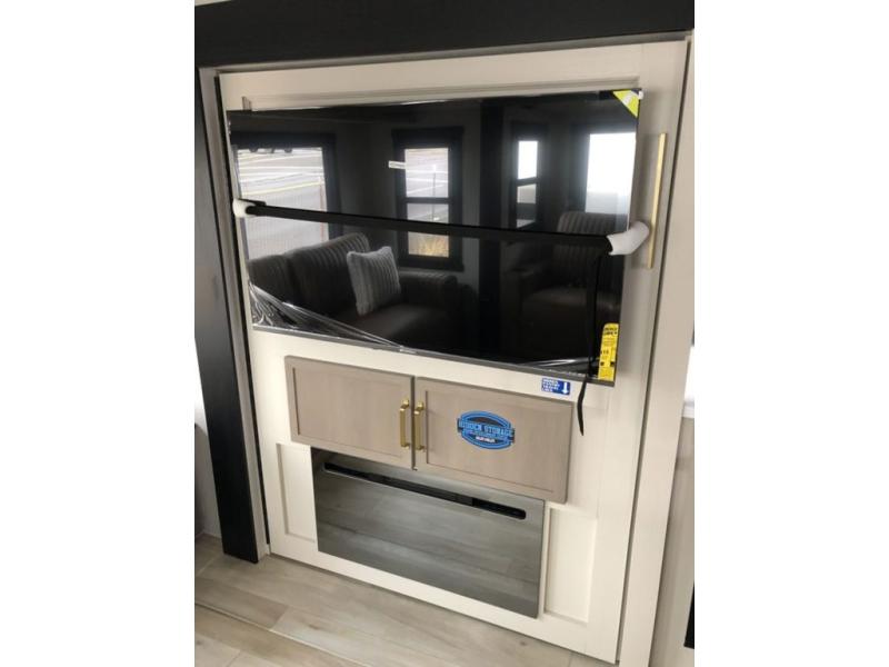 Step inside this luxurious travel trailer and see all that it has to offer! You will enjoy a good night's rest each night on the queen bed with Versa Tilt with wardrobes on either side to keep your clothes wrinkle free, and if you have a couple of guests then you can convert the rear tri-fold sofa or the booth dinette into a sleeping space. The 30" x 36" walk-in shower with a skylight above invites you to take a hot, steamy shower after a fun-filled day outdoors. Once you're cleaned up, you can grab some leftovers from the 10 cu. ft. 12V black refrigerator and warm it up in the microwave. There is also theatre seating across from the 50" LED TV with a fireplace below!