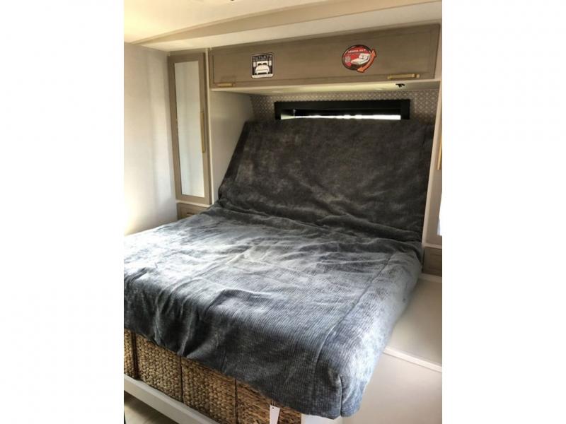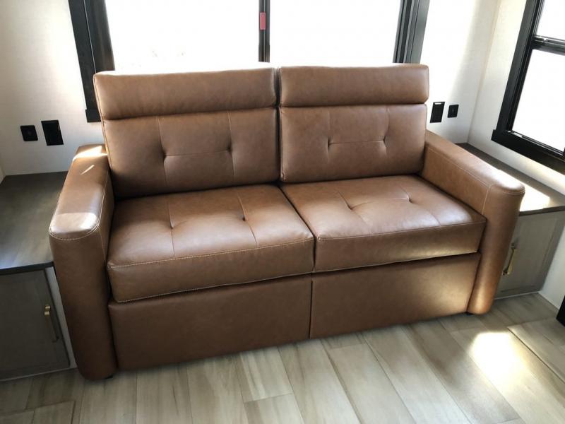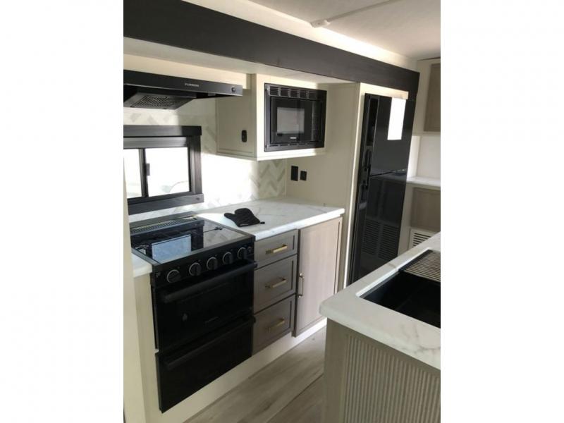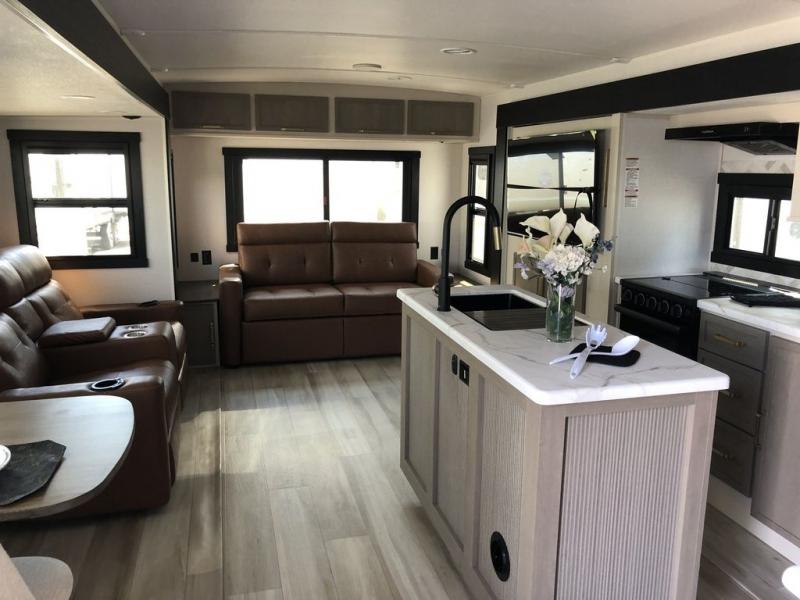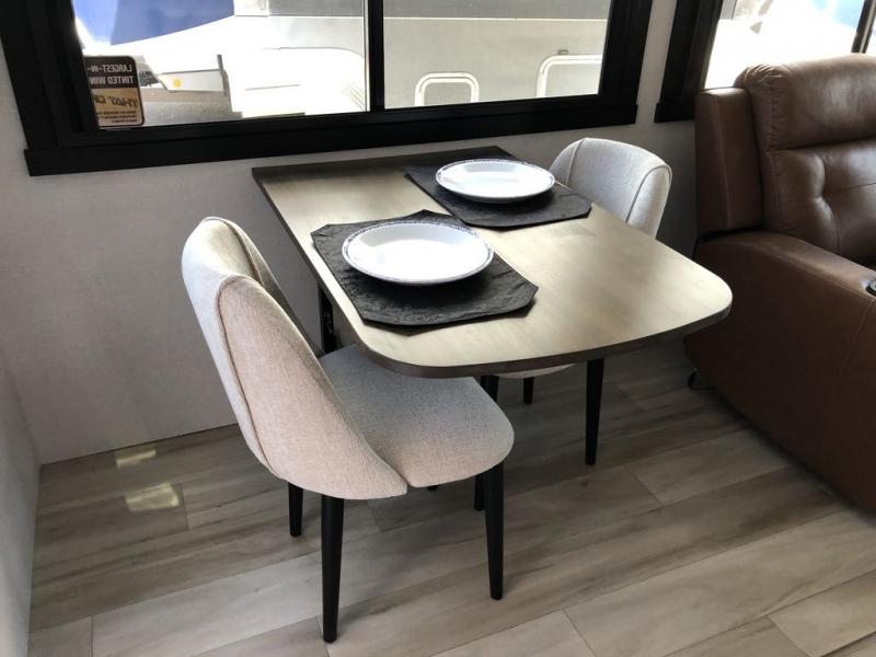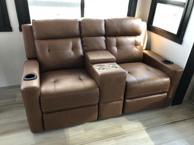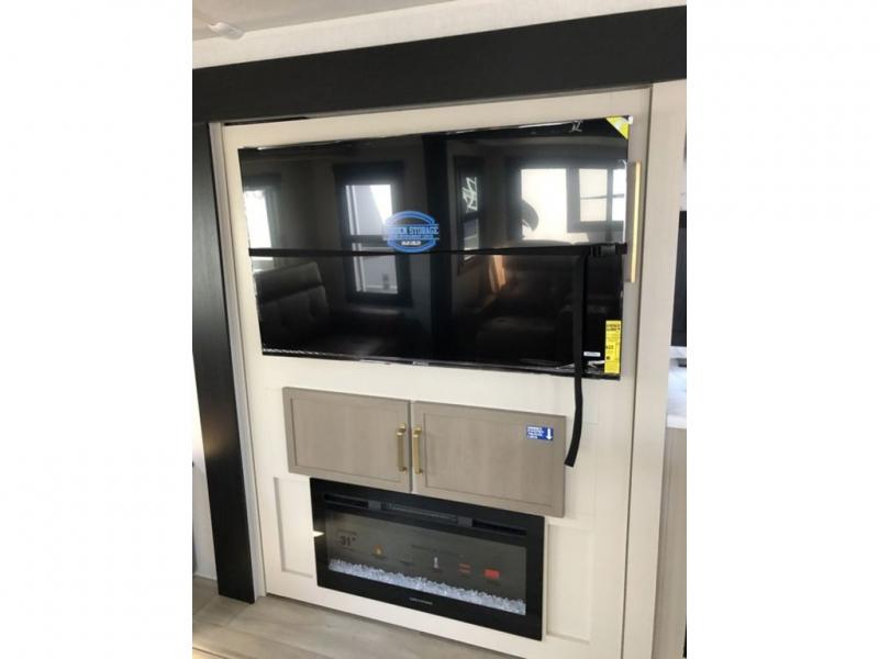 Step inside this luxurious travel trailer and see all that it has to offer! You will enjoy a good night's rest each night on the queen bed with Versa Tilt with wardrobes on either side to keep your clothes wrinkle free, and if you have a couple of guests then you can convert the rear tri-fold sofa or the booth dinette into a sleeping space. The 30" x 36" walk-in shower with a skylight above invites you to take a hot, steamy shower after a fun-filled day outdoors. Once you're cleaned up, you can grab some leftovers from the 10 cu. ft. 12V black refrigerator and warm it up in the microwave. There is also theatre seating across from the 50" LED TV with a fireplace below!
