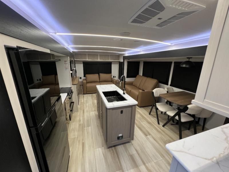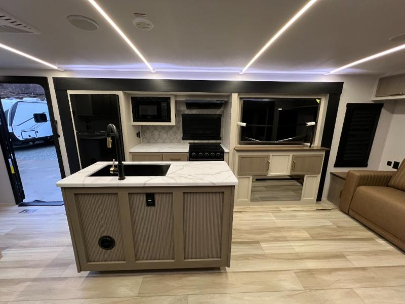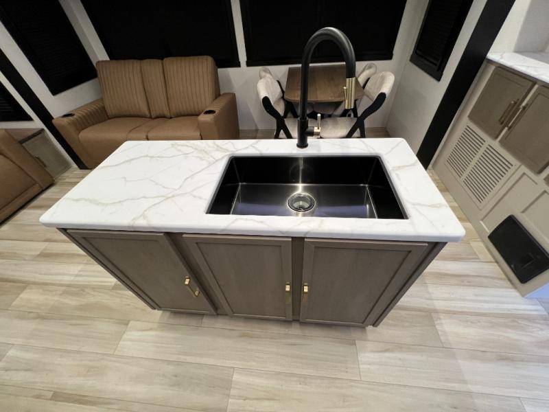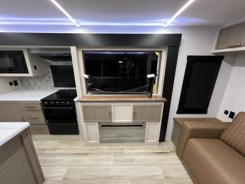 Once you step foot in this travel trailer, you won't want to camp any other way! There is plenty of entertainment and seating for everyone in the rear living area with the tri-fold sofa, the theatre seating with cupholders, and the 50" LED TV with a fireplace. You can cook your meals either indoors with the kitchen island or enjoy some fresh air at the outside kitchen/bar then head indoors and eat it comfortably at the booth dinette. There are plenty other convenient features like the hutch for your dishes, the 30" x 36" walk-in shower, and the Texas-sized exterior pass-through storage area!