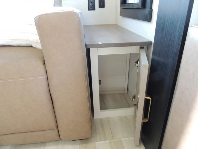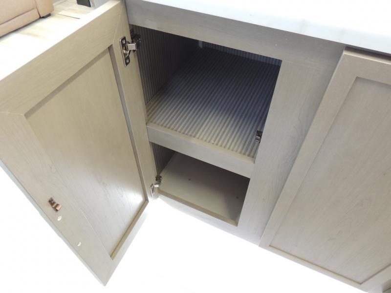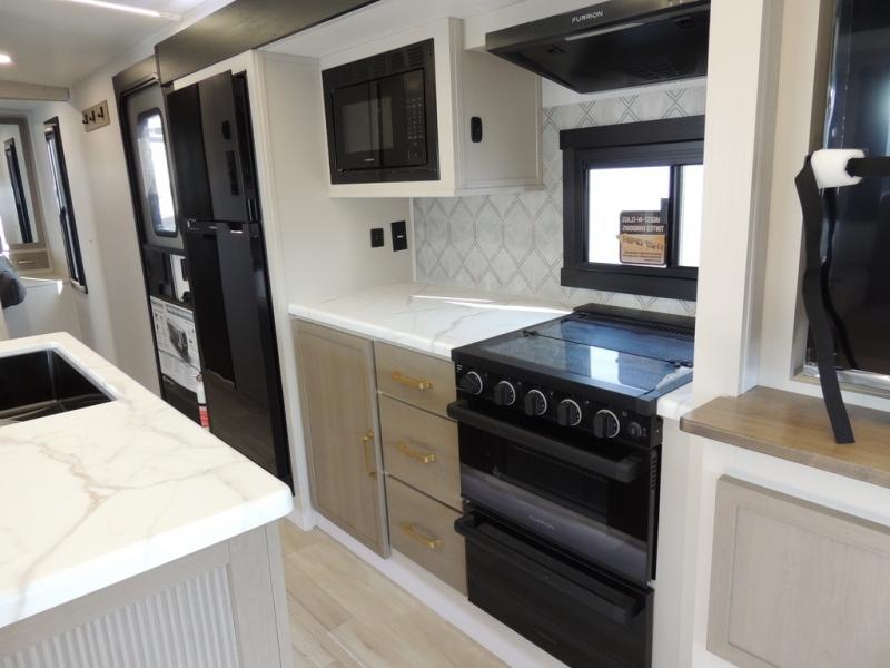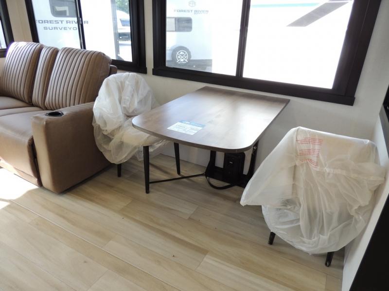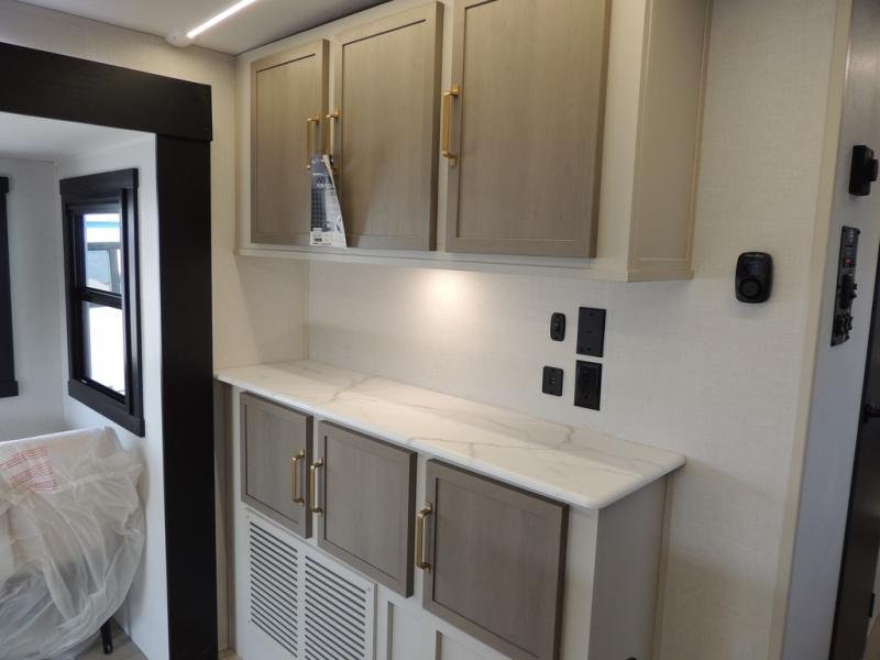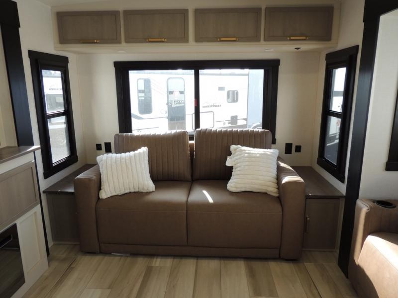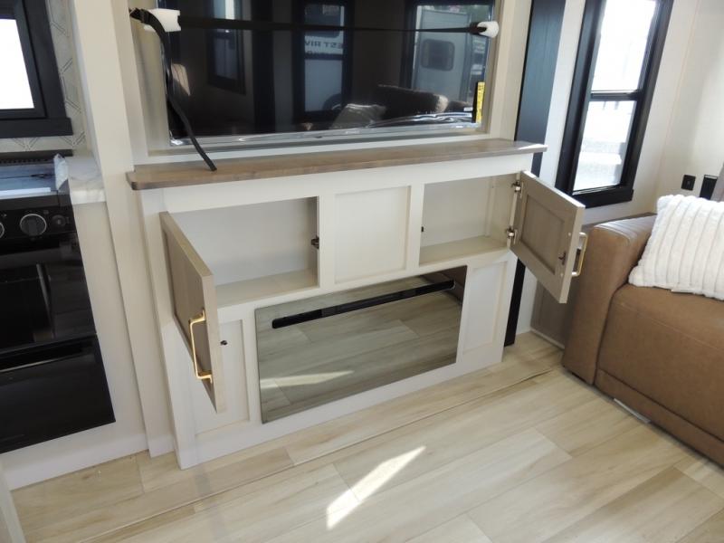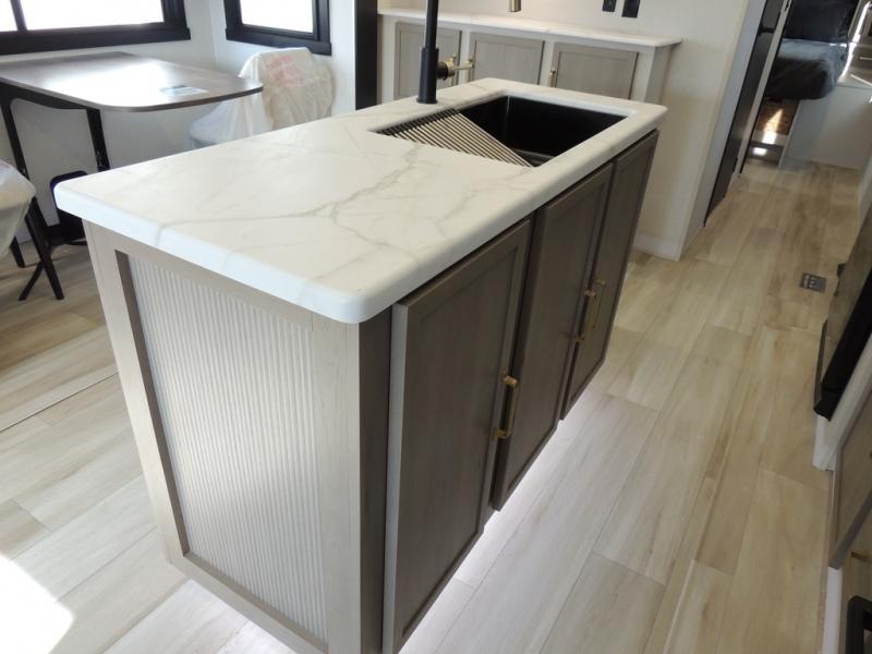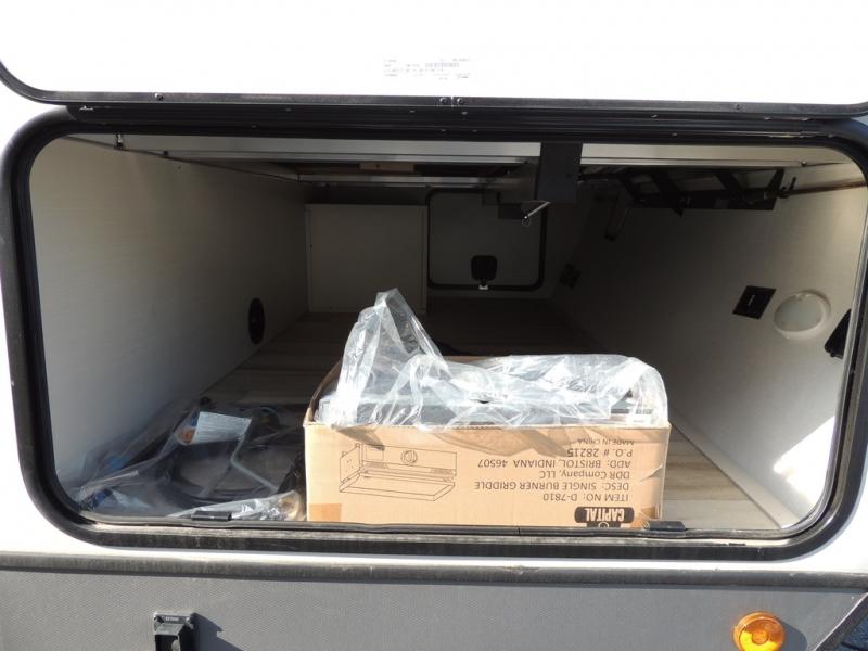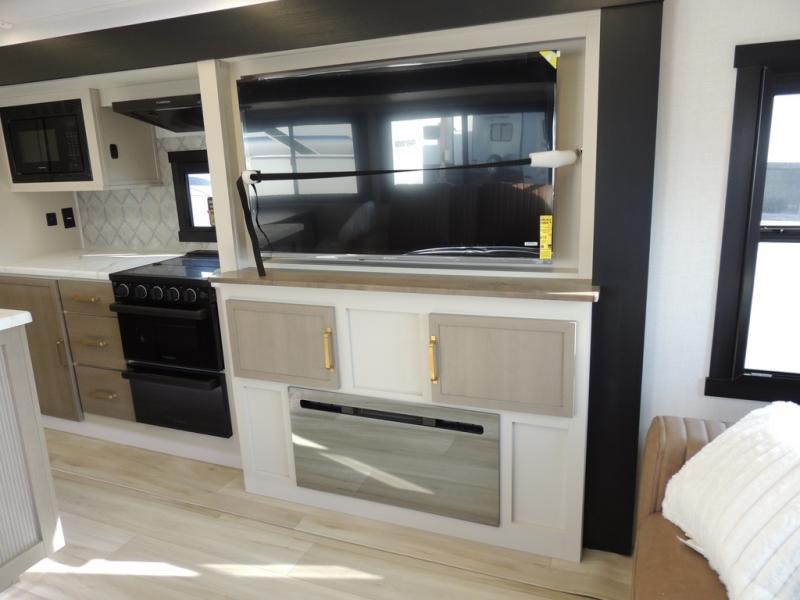 Once you step foot in this travel trailer, you won't want to camp any other way! There is plenty of entertainment and seating for everyone in the rear living area with the tri-fold sofa, the theatre seating with cupholders, and the 50" LED TV with a fireplace. You can cook your meals either indoors with the kitchen island or enjoy some fresh air at the outside kitchen/bar then head indoors and eat it comfortably at the booth dinette. There are plenty other convenient features like the hutch for your dishes, the 30" x 36" walk-in shower, and the Texas-sized exterior pass-through storage area!