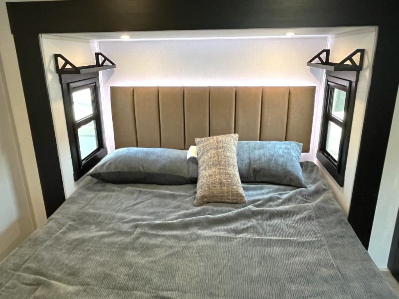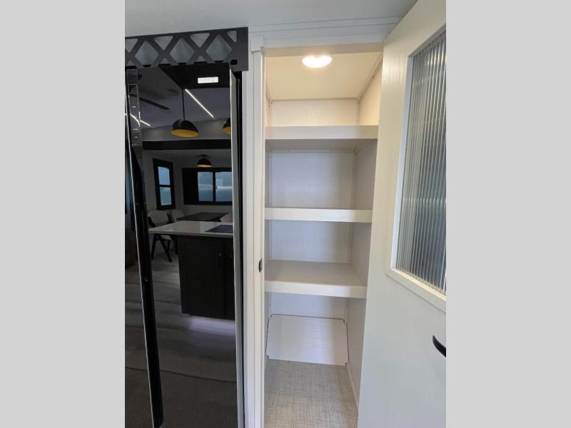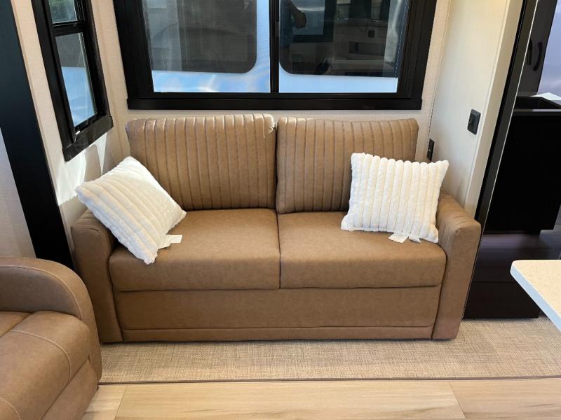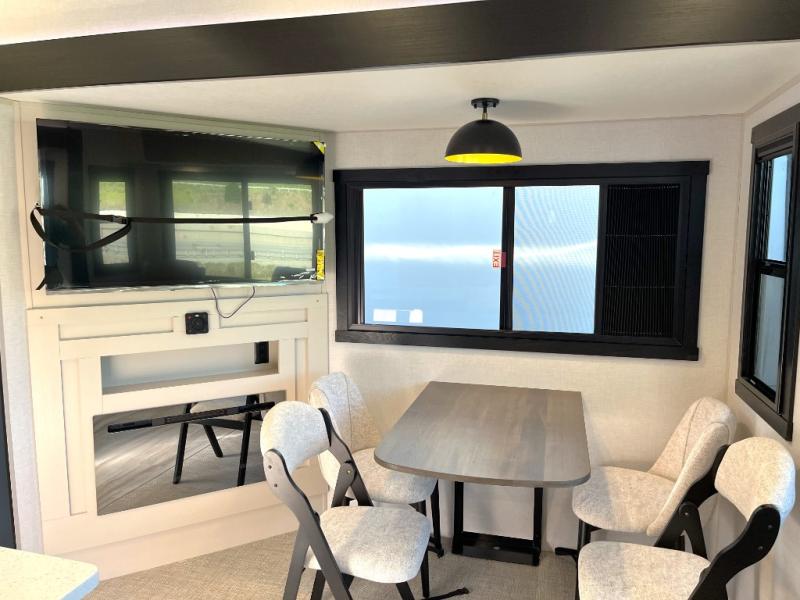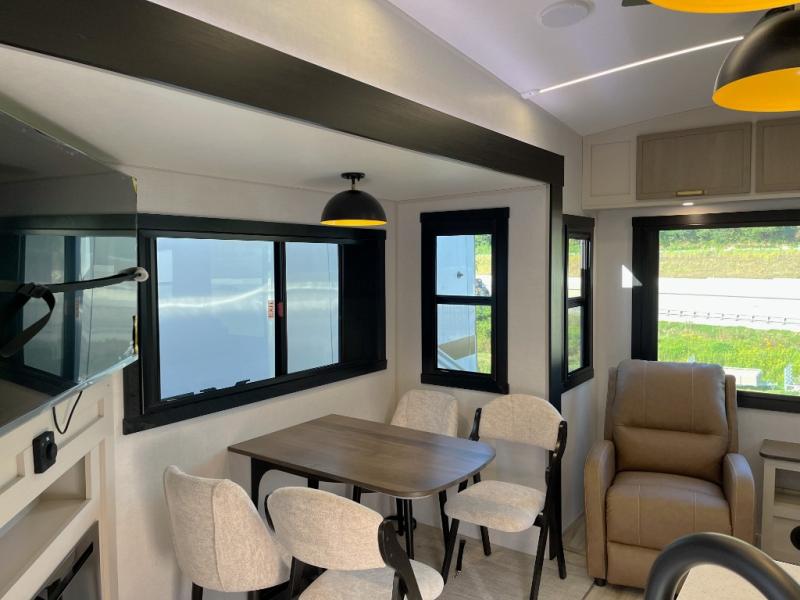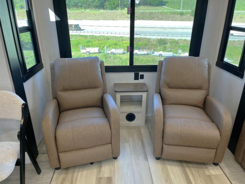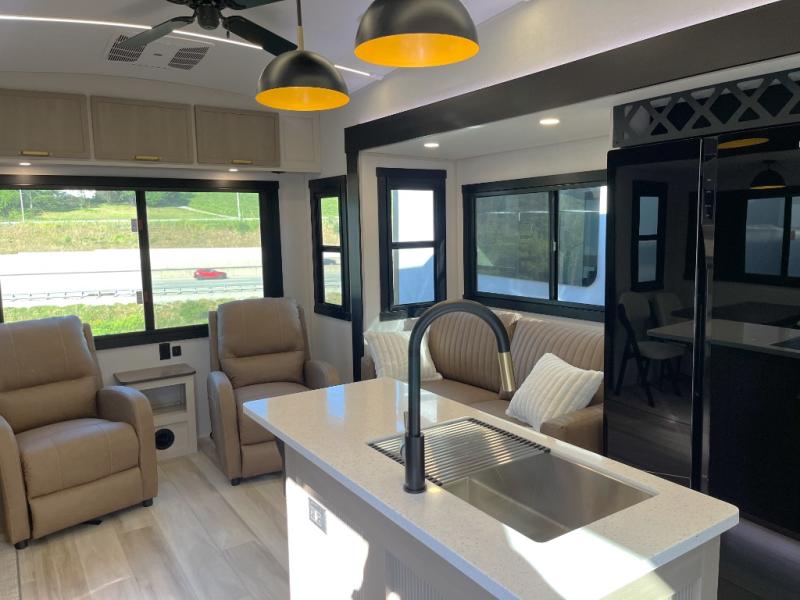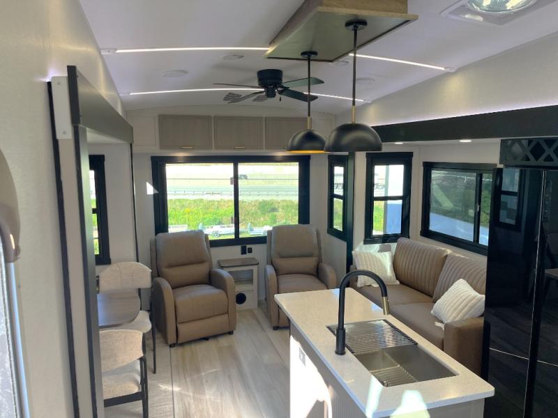 Enjoy the sunshine with panoramic windows throughout this fifth wheel! The rear living area is perfect for relaxing in at night on one of the two chairs or the tri-fold sofa. There is also a table with four chairs, a 50" LED TV, and a fireplace to make this area feel more like home. The kitchen has an island with a large sink to make clean up easier and a pantry big enough to store everyone's favorite snacks. The full bathroom has a residential walk-in shower with a skylight above for natural lighting as you get ready. When you're ready to hit the sack, head to the front private bedroom and enjoy a good night's rest on the custom king bed!