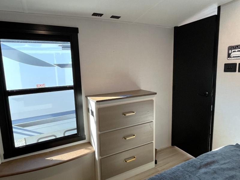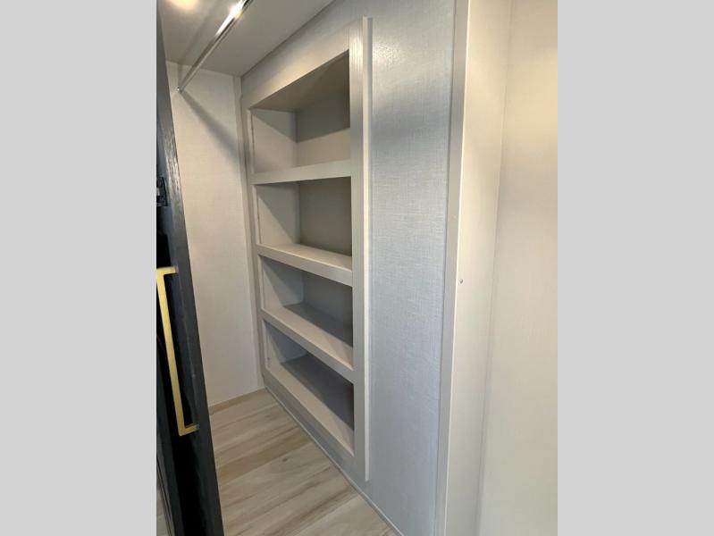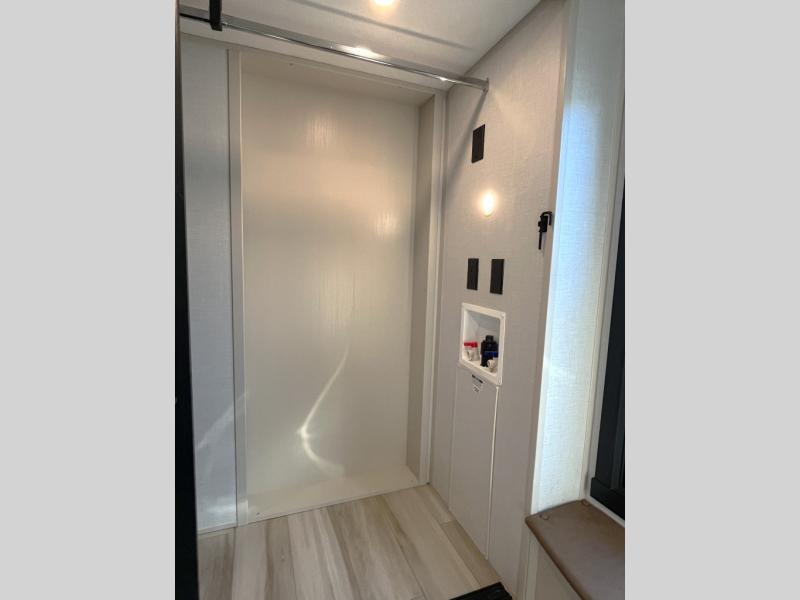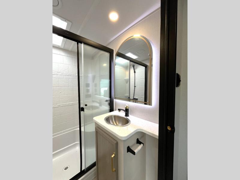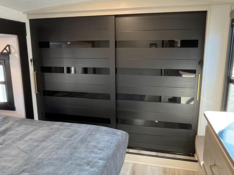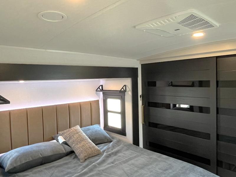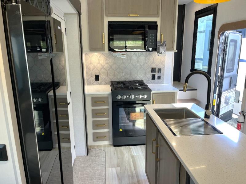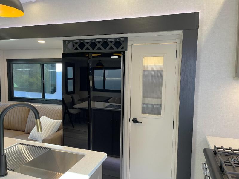 Enjoy the sunshine with panoramic windows throughout this fifth wheel! The rear living area is perfect for relaxing in at night on one of the two chairs or the tri-fold sofa. There is also a table with four chairs, a 50" LED TV, and a fireplace to make this area feel more like home. The kitchen has an island with a large sink to make clean up easier and a pantry big enough to store everyone's favorite snacks. The full bathroom has a residential walk-in shower with a skylight above for natural lighting as you get ready. When you're ready to hit the sack, head to the front private bedroom and enjoy a good night's rest on the custom king bed!