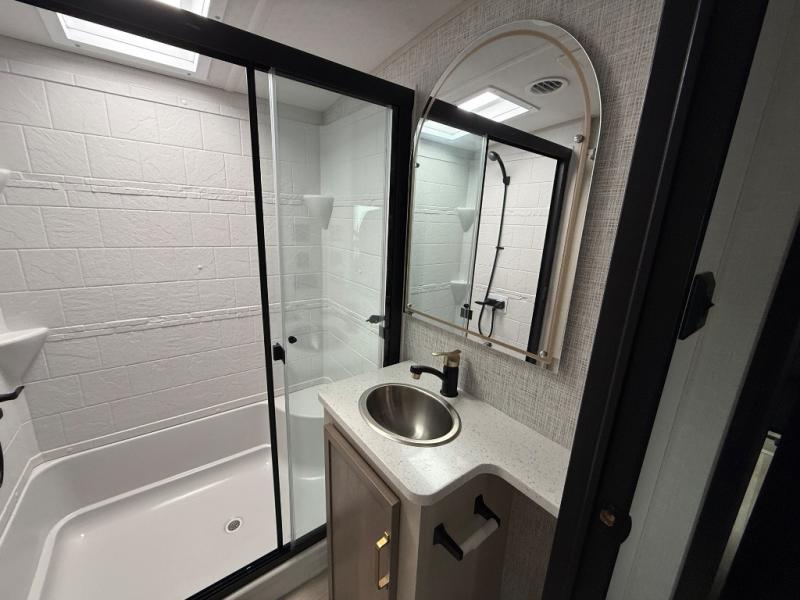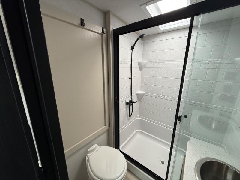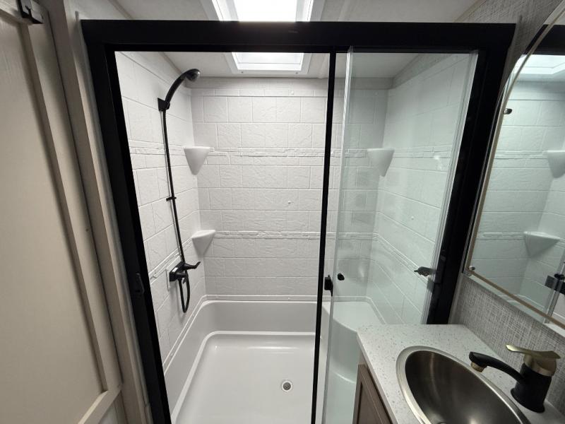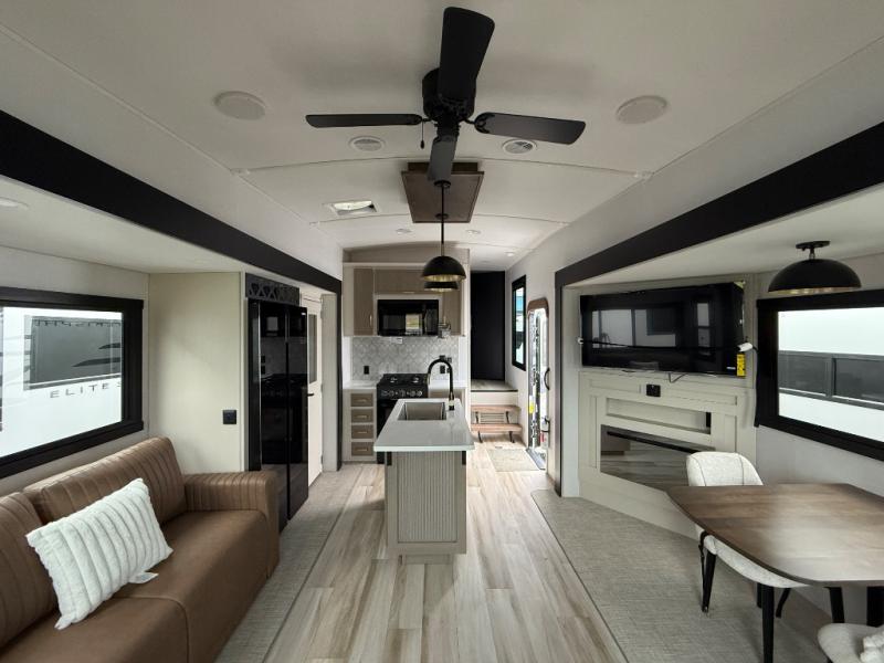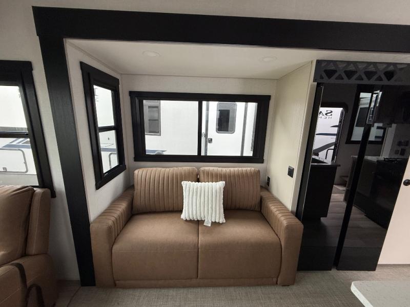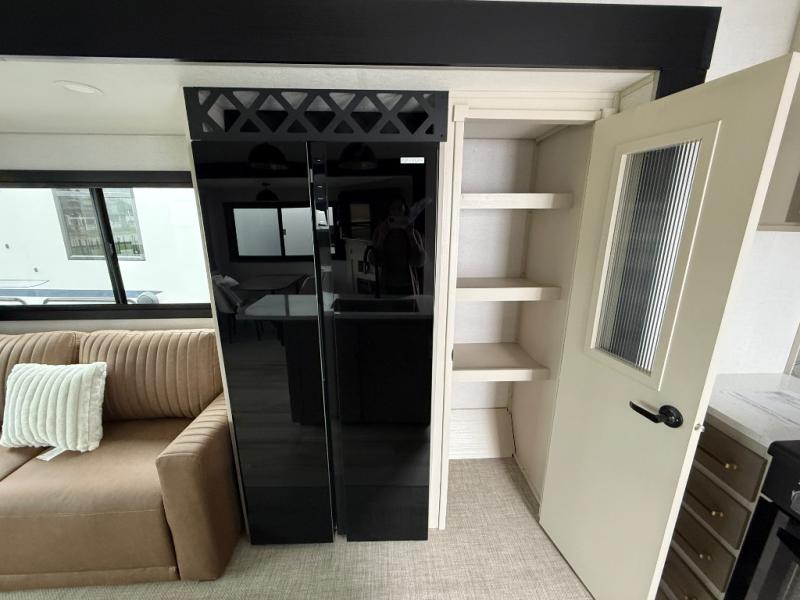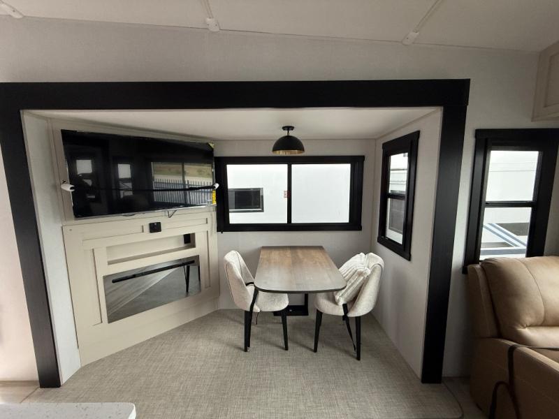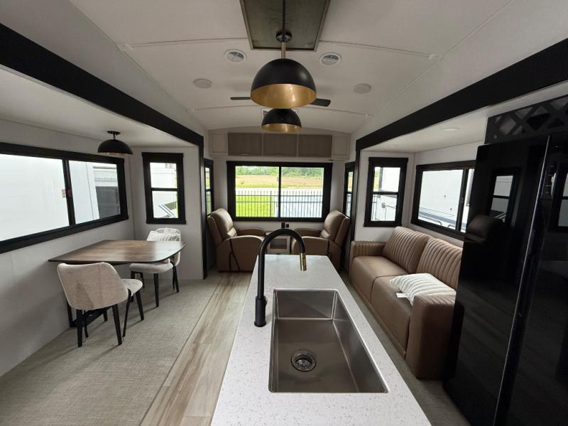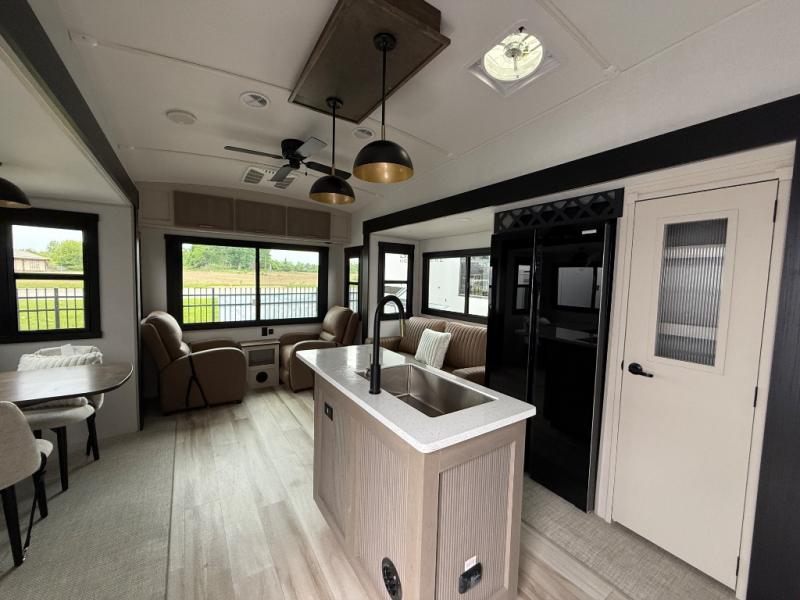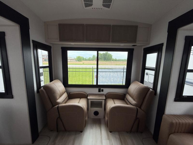 Enjoy the sunshine with panoramic windows throughout this fifth wheel! The rear living area is perfect for relaxing in at night on one of the two chairs or the tri-fold sofa. There is also a table with four chairs, a 50" LED TV, and a fireplace to make this area feel more like home. The kitchen has an island with a large sink to make clean up easier and a pantry big enough to store everyone's favorite snacks. The full bathroom has a residential walk-in shower with a skylight above for natural lighting as you get ready. When you're ready to hit the sack, head to the front private bedroom and enjoy a good night's rest on the custom king bed!