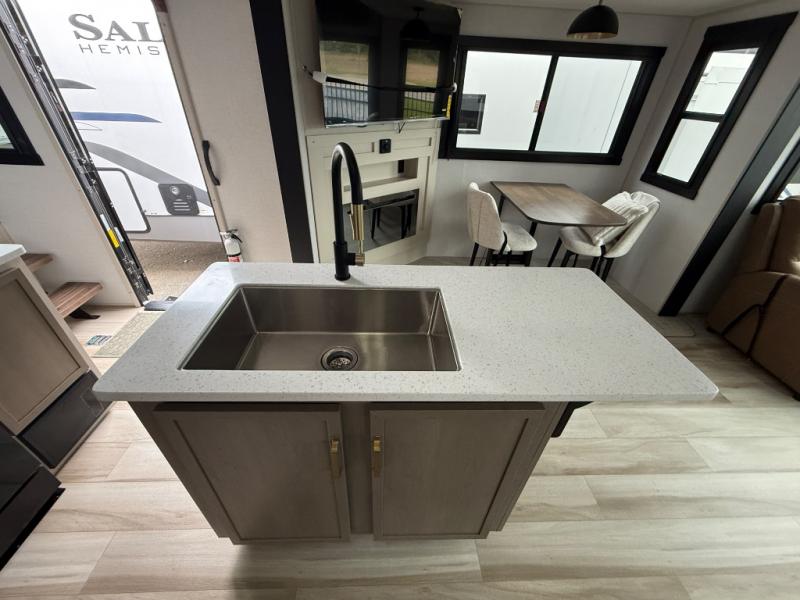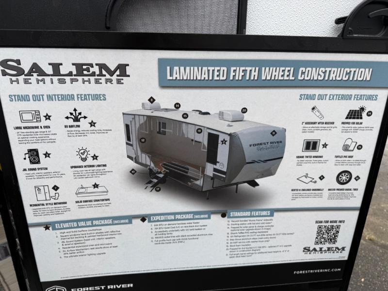The Salem Hemisphere fifth wheels and travel trailers by Forest River are packed with features, while still being value-minded! Each model is constructed with laminated "Aluma Frame" sidewalls and floor with block foam insulation plus full length barreled ceilings for added head space. There are LED awning, marker and tail lights outside, along with an extra large pass-thru storage with slam latch baggage doors, plus solar prep and Lippert On-The-Go ladder prep. The 60K on-demand tankless water heater will provide endless hot showers, and the JBL sound system includes a head unit plus interior and exterior speakers to keep the party going. There are also many interior comforts found throughout that will make you feel right at home!