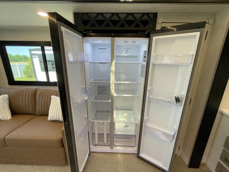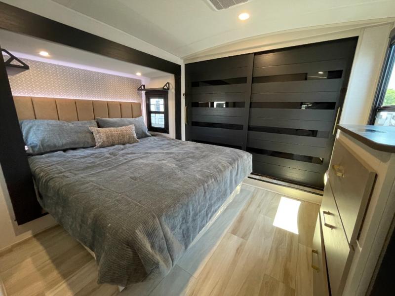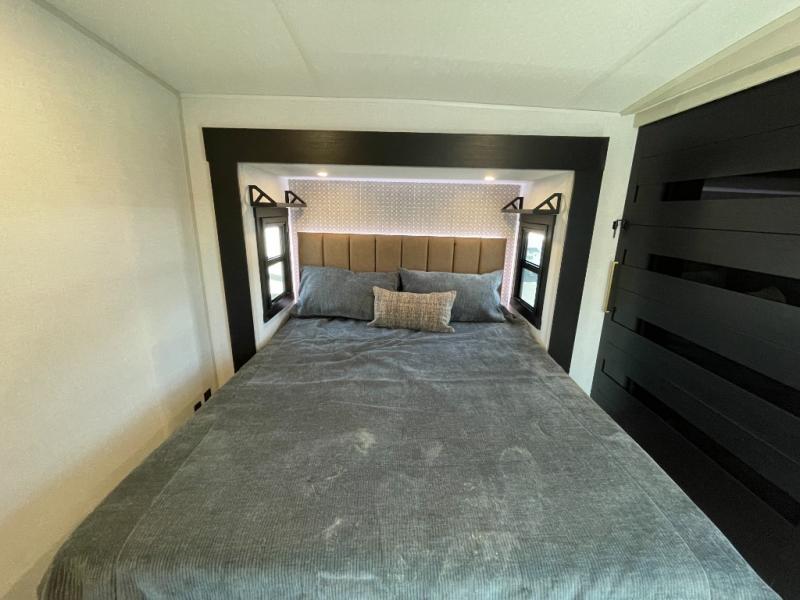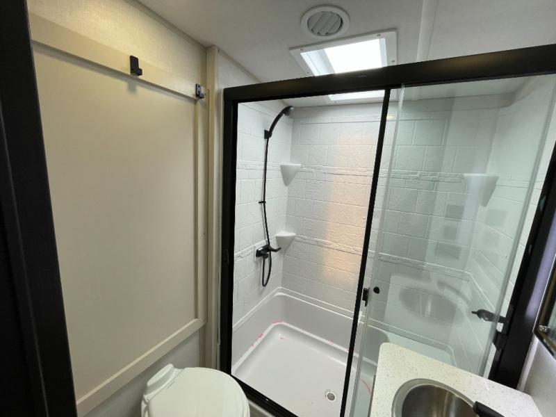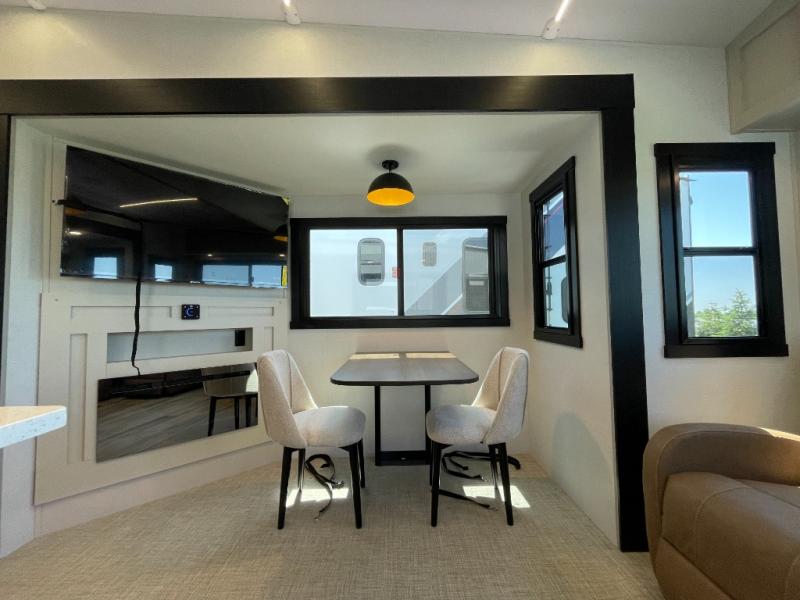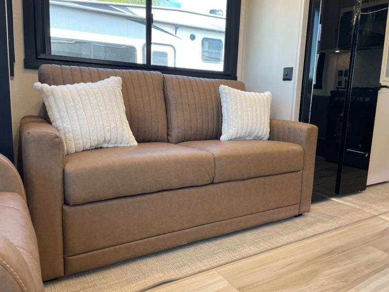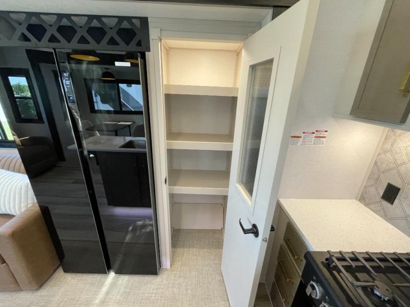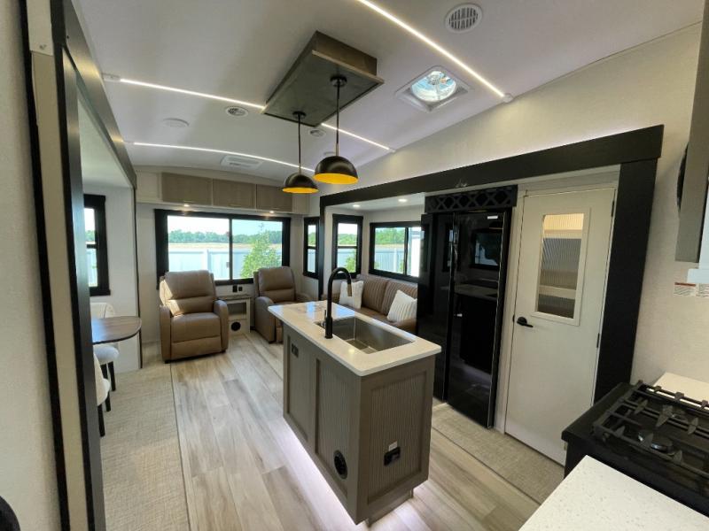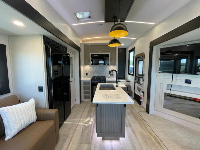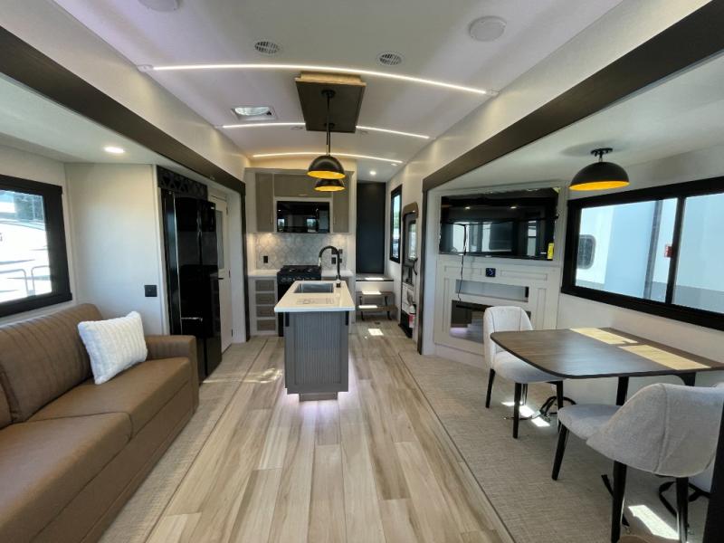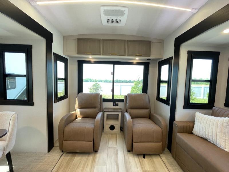 Enjoy the sunshine with panoramic windows throughout this fifth wheel! The rear living area is perfect for relaxing in at night on one of the two chairs or the tri-fold sofa. There is also a table with four chairs, a 50" LED TV, and a fireplace to make this area feel more like home. The kitchen has an island with a large sink to make clean up easier and a pantry big enough to store everyone's favorite snacks. The full bathroom has a residential walk-in shower with a skylight above for natural lighting as you get ready. When you're ready to hit the sack, head to the front private bedroom and enjoy a good night's rest on the custom king bed!