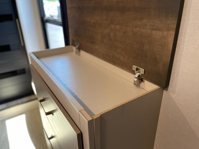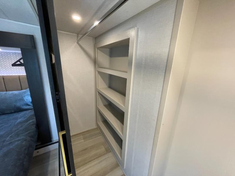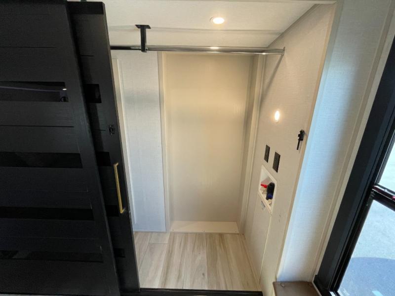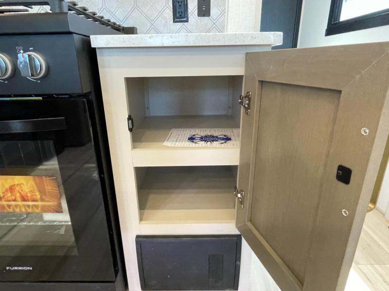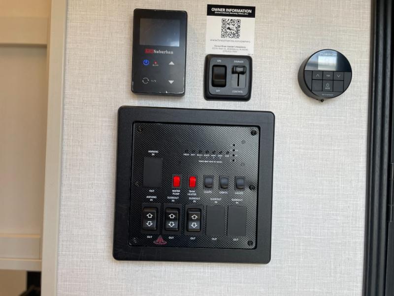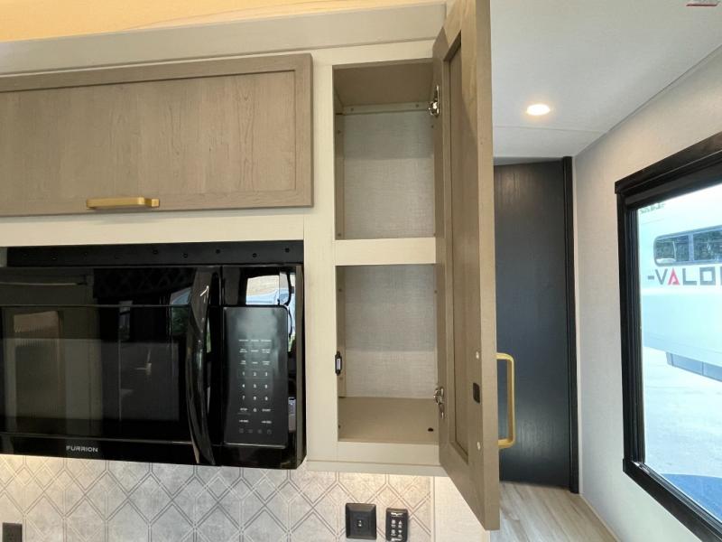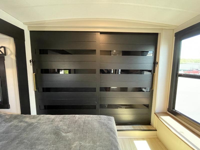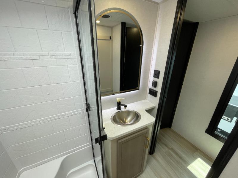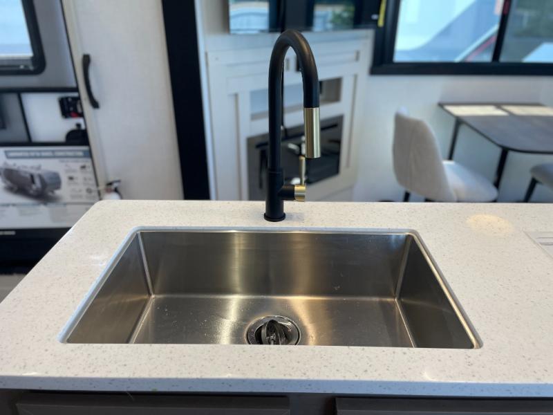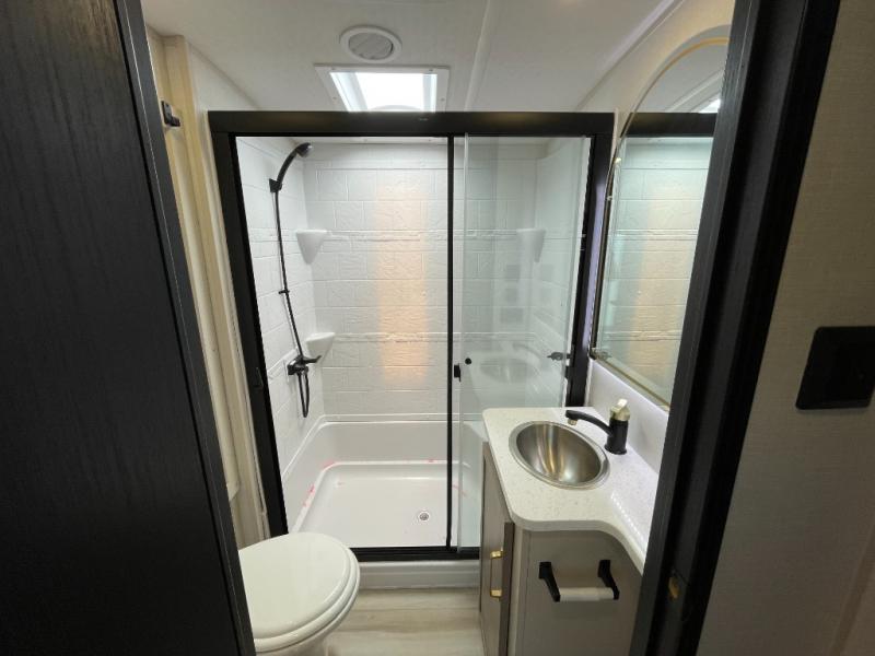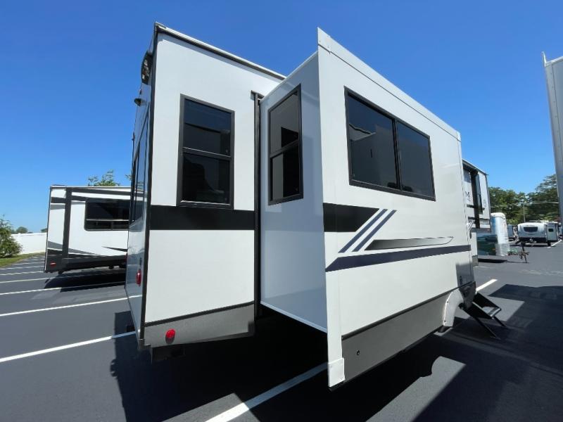 Enjoy the sunshine with panoramic windows throughout this fifth wheel! The rear living area is perfect for relaxing in at night on one of the two chairs or the tri-fold sofa. There is also a table with four chairs, a 50" LED TV, and a fireplace to make this area feel more like home. The kitchen has an island with a large sink to make clean up easier and a pantry big enough to store everyone's favorite snacks. The full bathroom has a residential walk-in shower with a skylight above for natural lighting as you get ready. When you're ready to hit the sack, head to the front private bedroom and enjoy a good night's rest on the custom king bed!