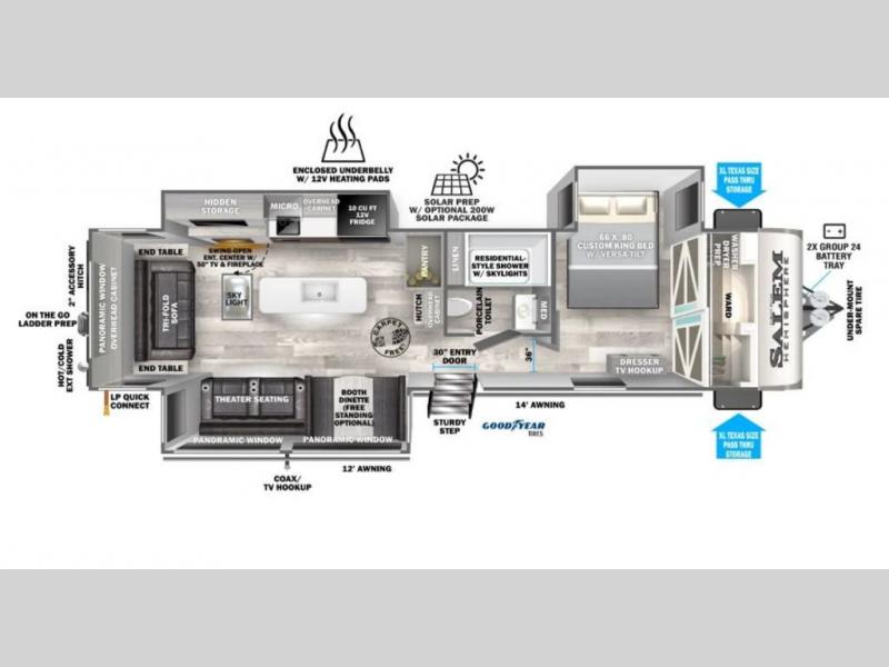 The Salem Hemisphere fifth wheels and travel trailers by Forest River are packed with features, while still being value-minded! Each model is constructed with laminated "Aluma Frame" sidewalls and floor with block foam insulation plus full length barreled ceilings for added head space. There are LED awning, marker and tail lights outside, along with an extra large pass-thru storage with slam latch baggage doors, plus solar prep and Lippert On-The-Go ladder prep. The 60K on-demand tankless water heater will provide endless hot showers, and the JBL sound system includes a head unit plus interior and exterior speakers to keep the party going. There are also many interior comforts found throughout that will make you feel right at home!