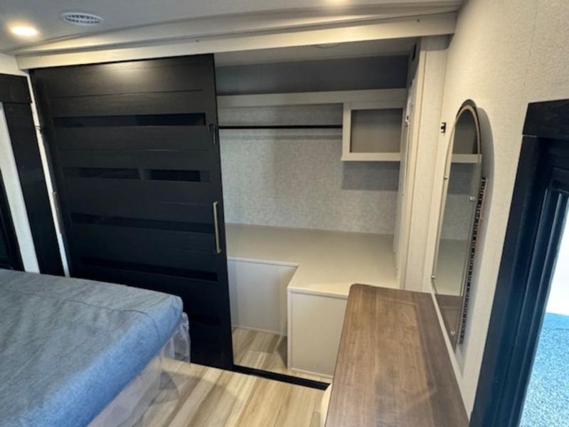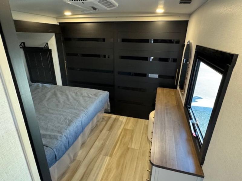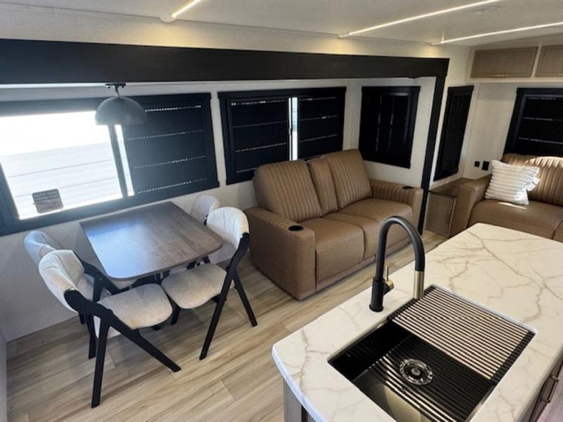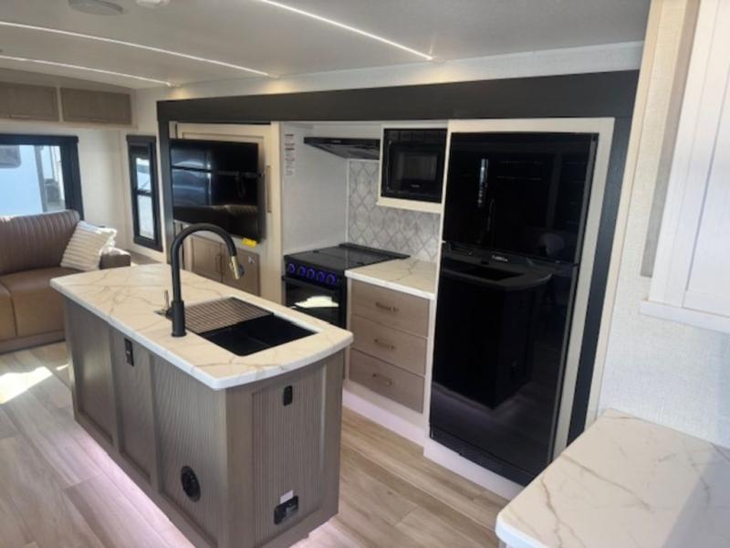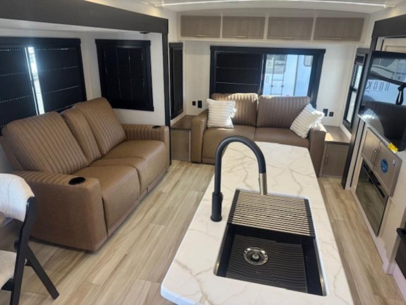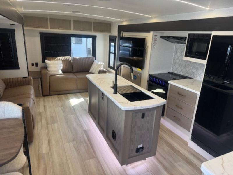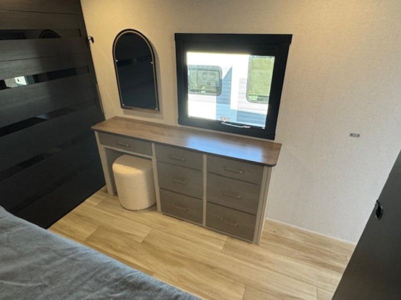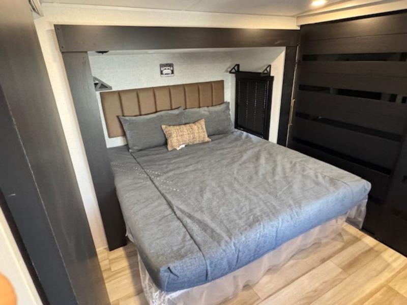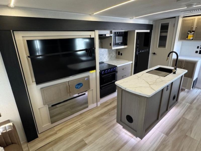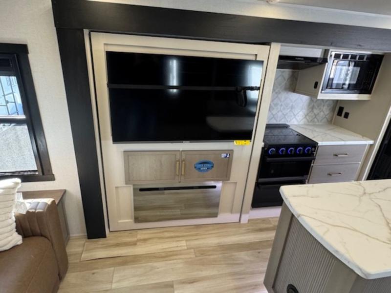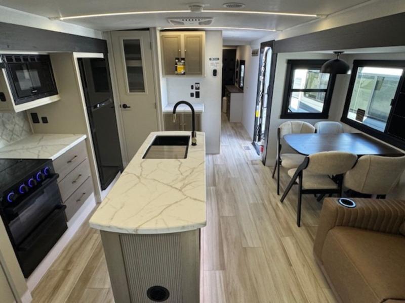 This travel trailer is decked out in features you will love like the front walk-in wardrobe with washer/dryer prep inside the front private bedroom! The full bathroom has everything you will need to get squeaky clean each morning including a residential walk-in shower with a skylight to let in some natural lighting. There is a hutch for you to store your dishes and a kitchen island to make meal prepping even easier. Once you have created a delicious meal, you can head to the booth dinette and enjoy eating it there comfortably while enjoying your view out of the panoramic window!