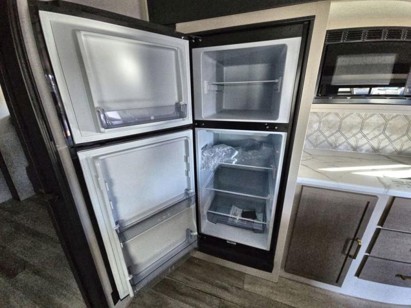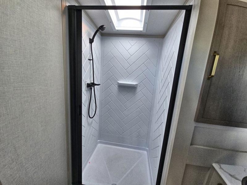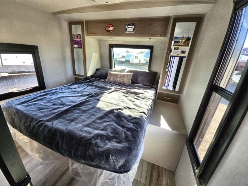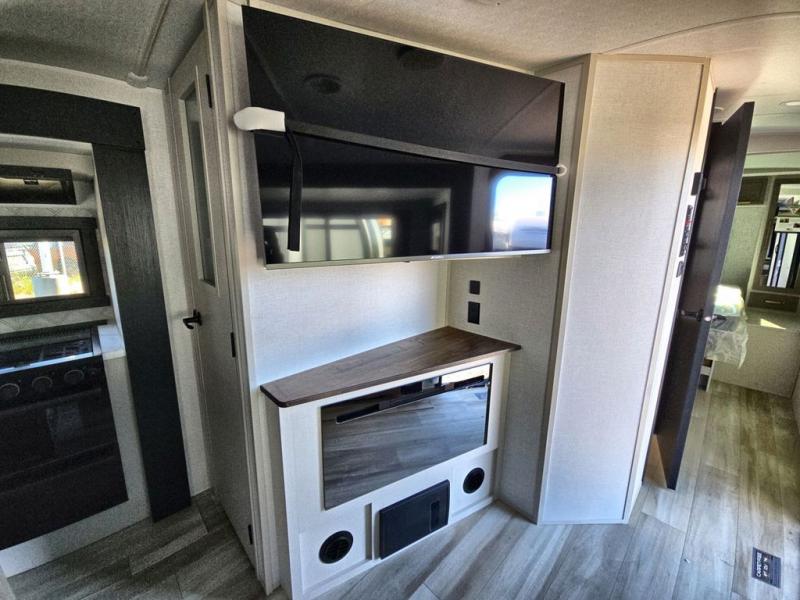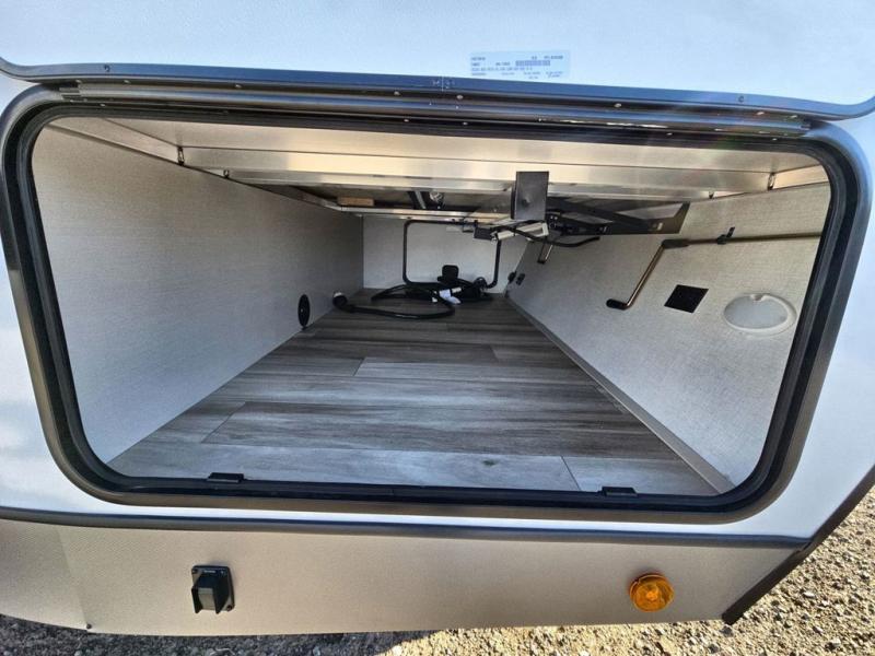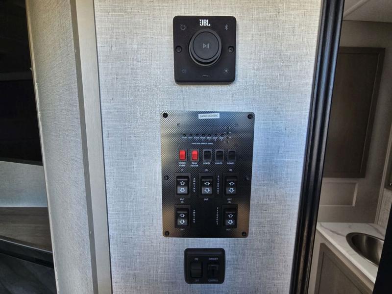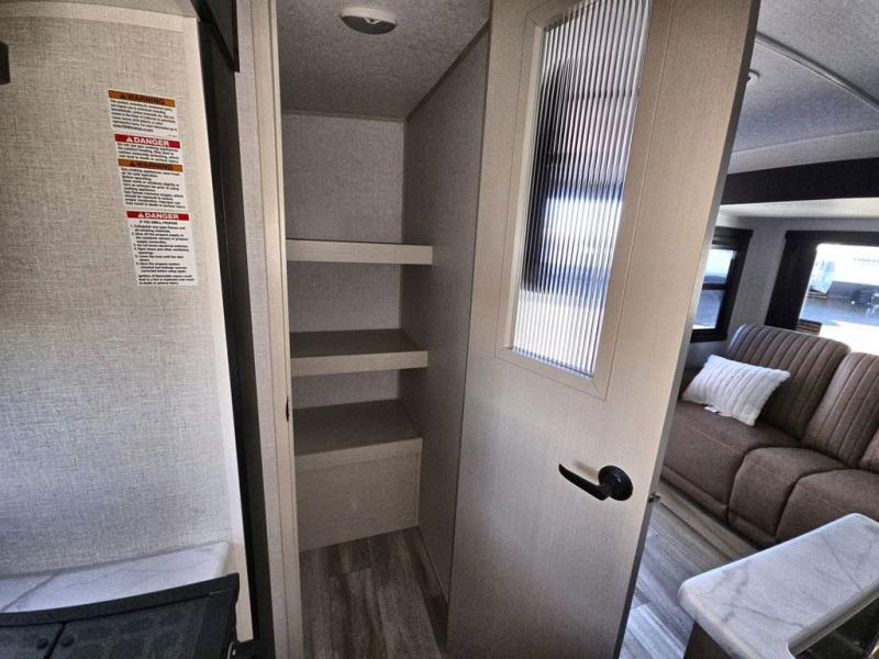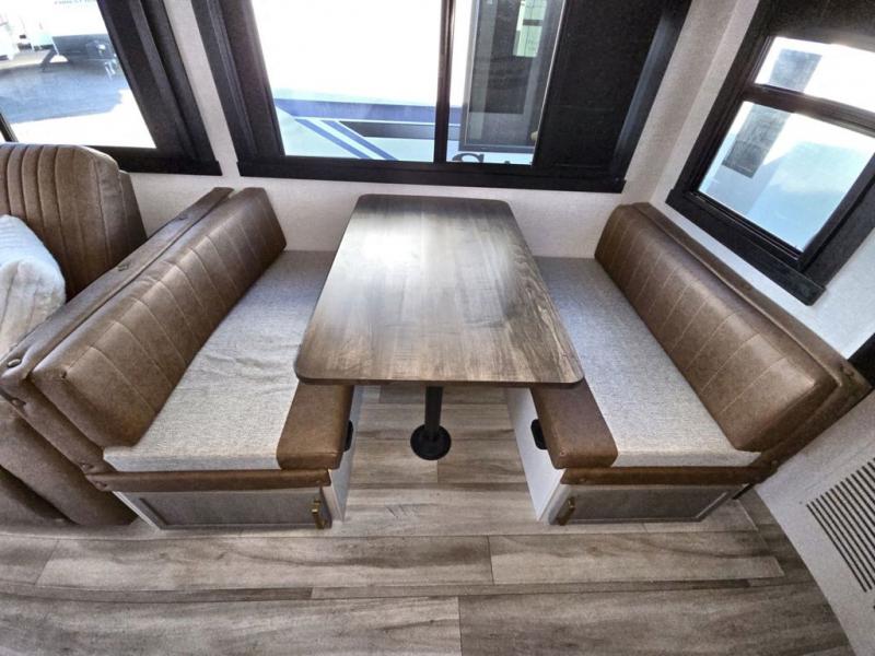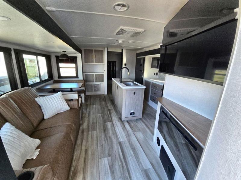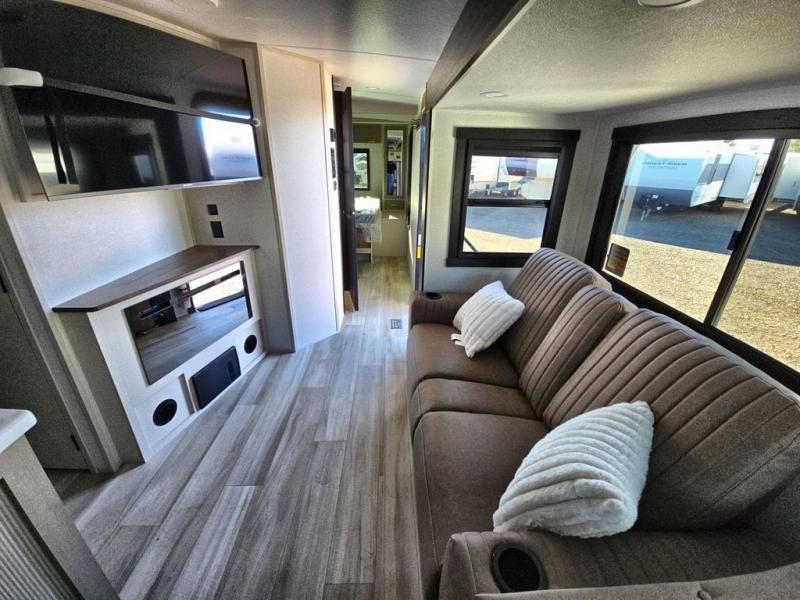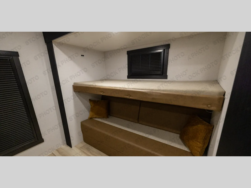 Your kids or friends are going to love camping in this travel trailer! It features a rear private bunkhouse with a bunk above a Versa queen convertible bed/sofa plus an additional bunk above an entertainment center with storage below. Just outside the bunkhouse is the kitchen with a 10 cu. ft. 12V black refrigerator, a microwave, a kitchen island, and a chef-sized walk-in pantry big enough to store everyone's favorite snacks. The booth dinette and the theatre seating are right next to panoramic windows so you can enjoy looking out at your beautiful scenery. You will also love taking a hot, steamy shower in the 30" x 36" shower with skylights and get a good night's rest on the queen bed with Versa Tilt in the front private bedroom!