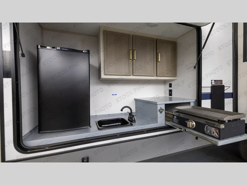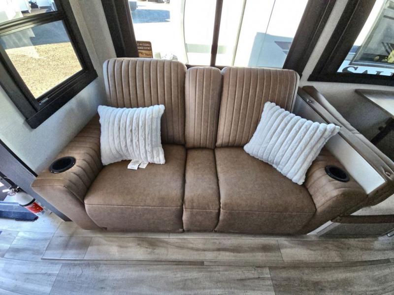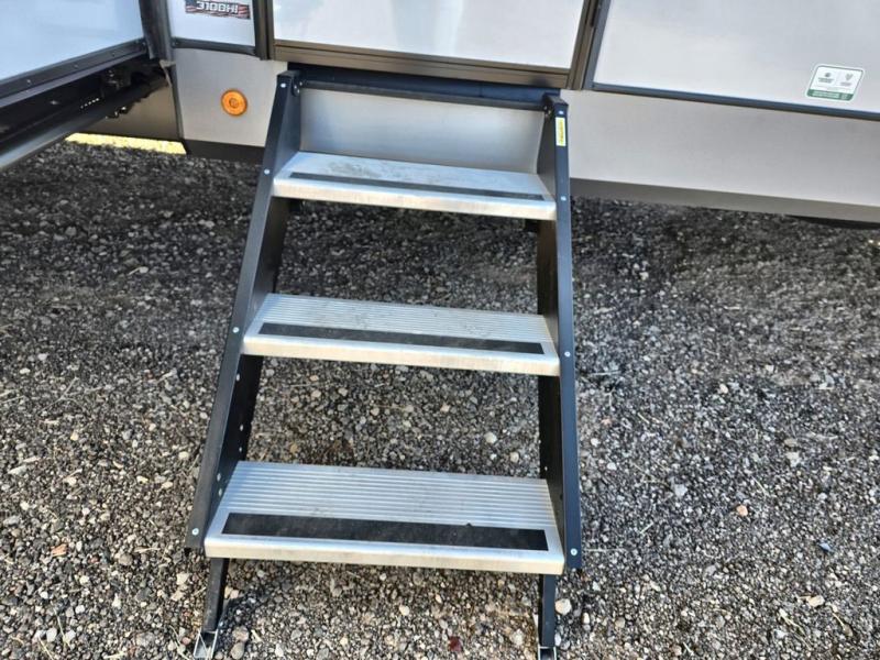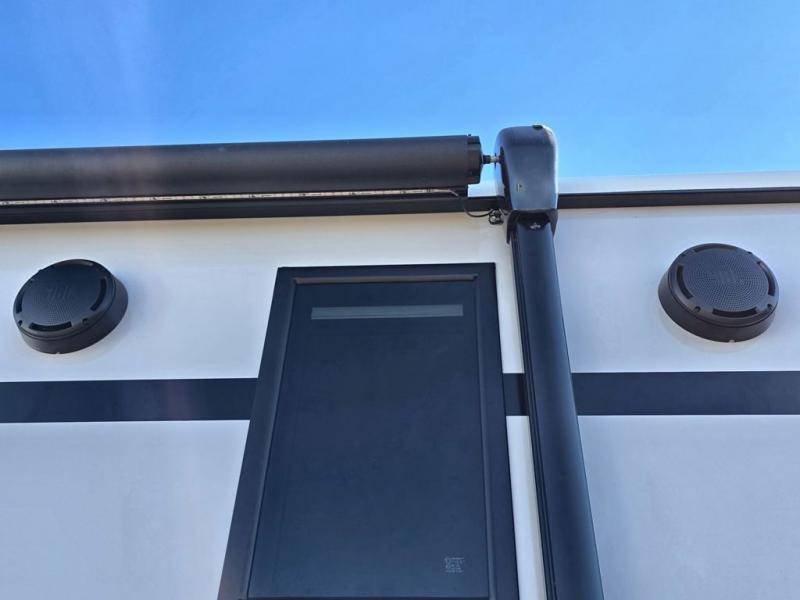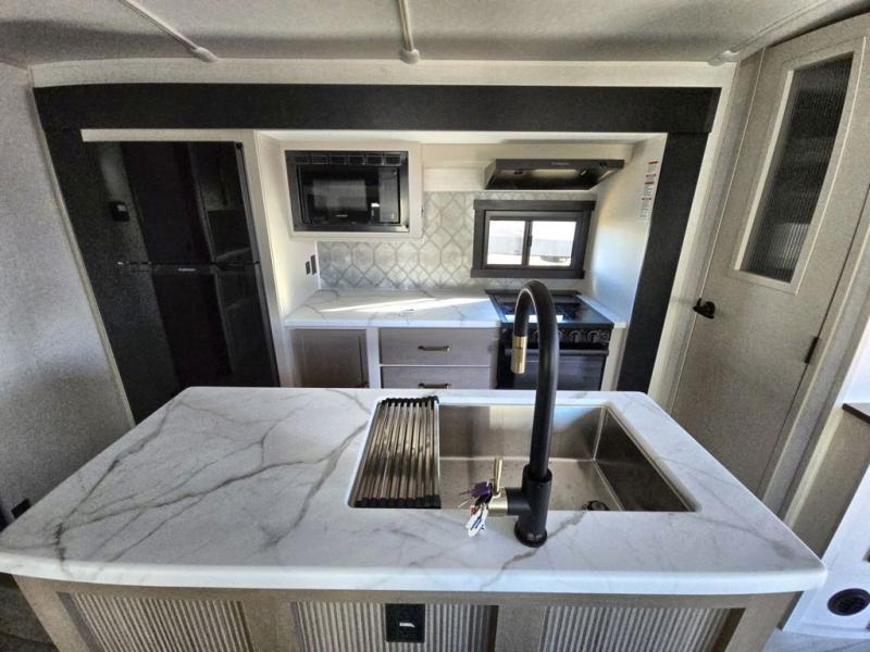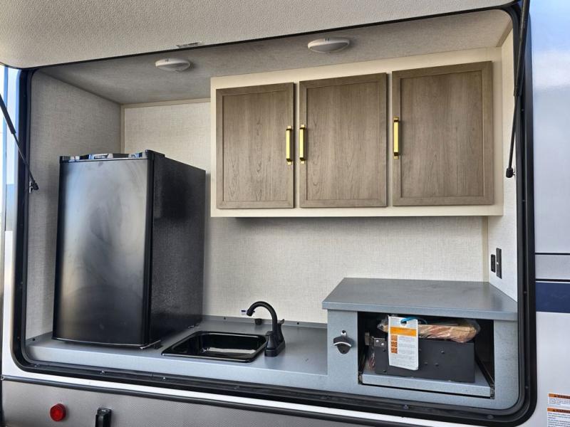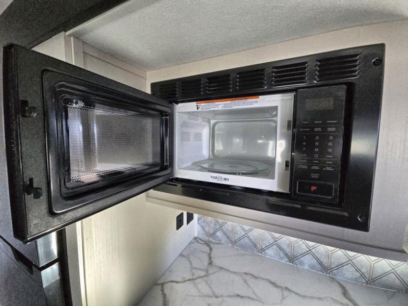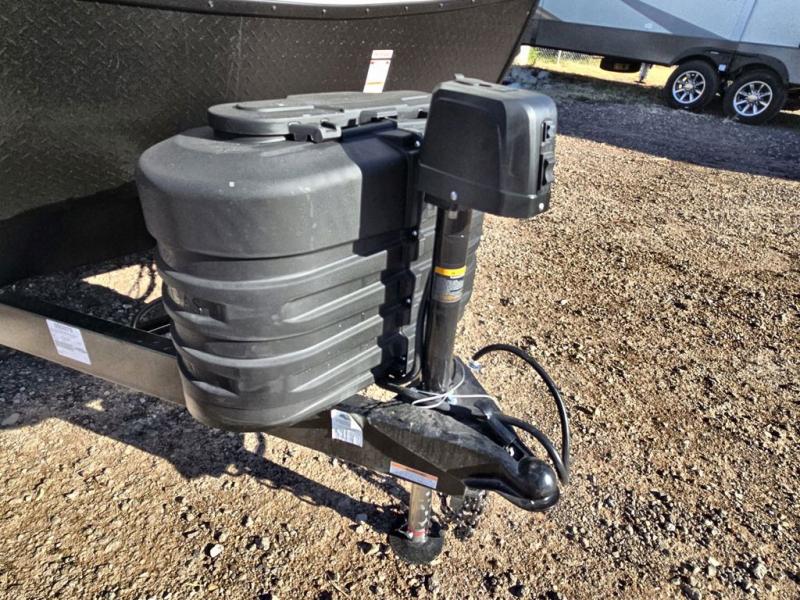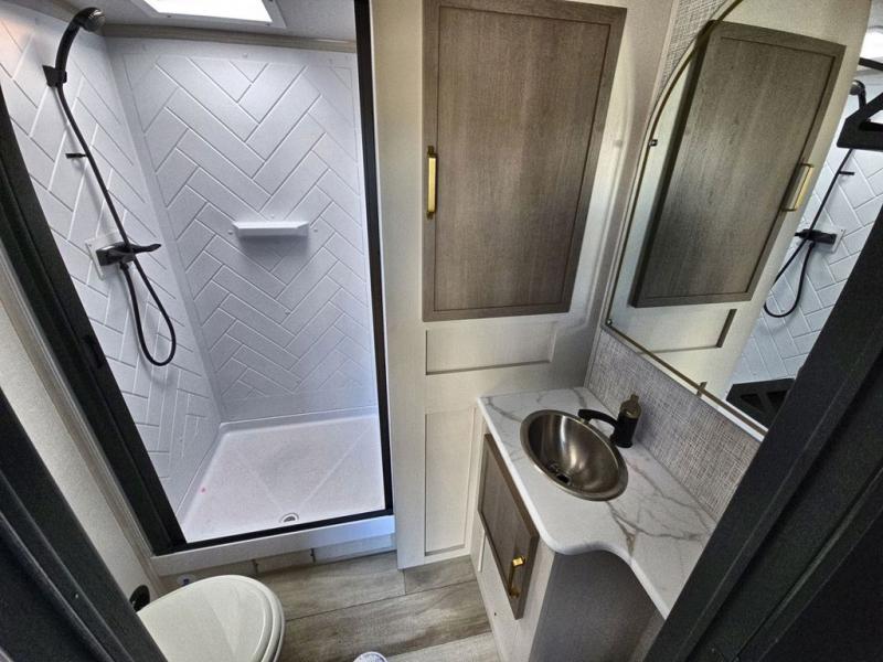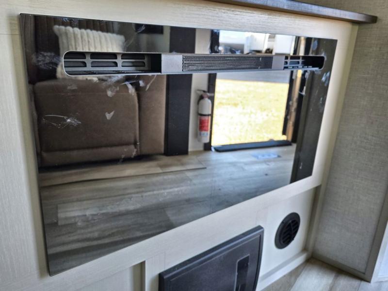Your kids or friends are going to love camping in this travel trailer! It features a rear private bunkhouse with a bunk above a Versa queen convertible bed/sofa plus an additional bunk above an entertainment center with storage below. Just outside the bunkhouse is the kitchen with a 10 cu. ft. 12V black refrigerator, a microwave, a kitchen island, and a chef-sized walk-in pantry big enough to store everyone's favorite snacks. The booth dinette and the theatre seating are right next to panoramic windows so you can enjoy looking out at your beautiful scenery. You will also love taking a hot, steamy shower in the 30" x 36" shower with skylights and get a good night's rest on the queen bed with Versa Tilt in the front private bedroom!