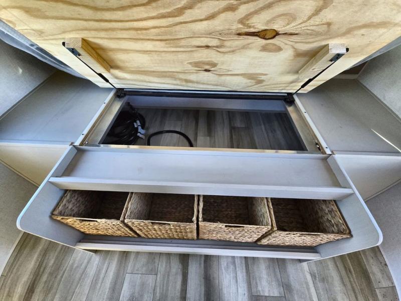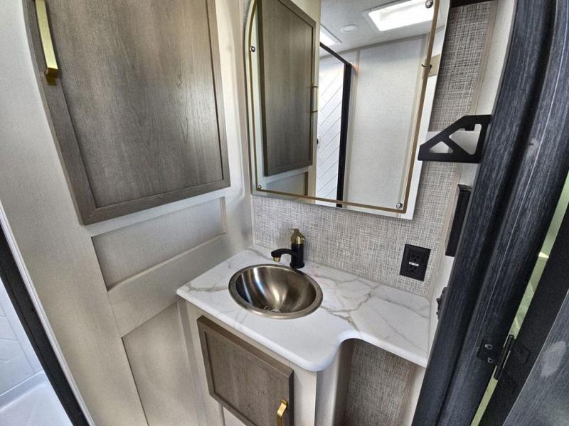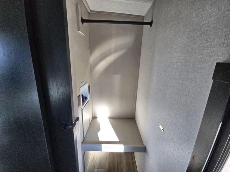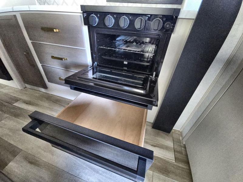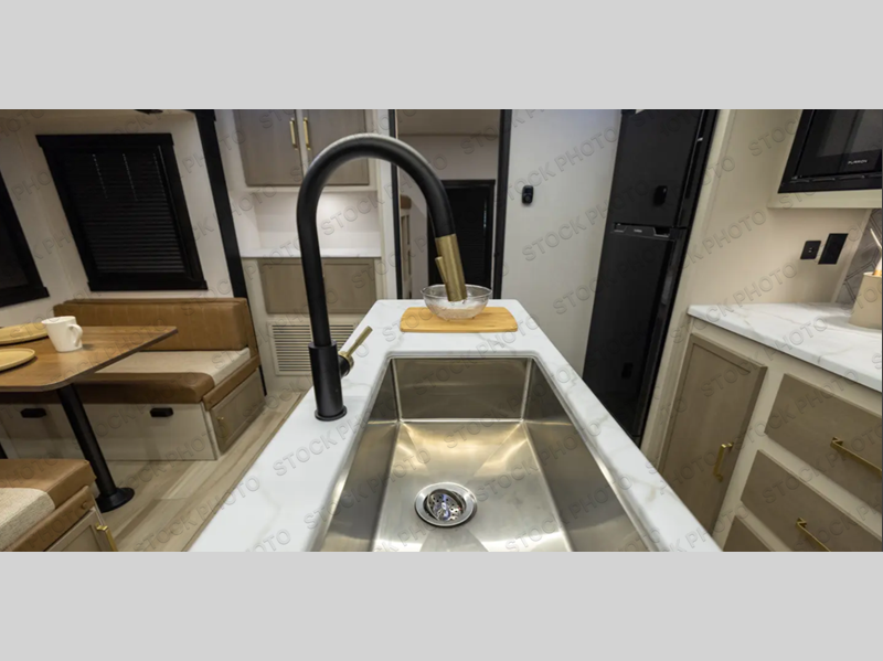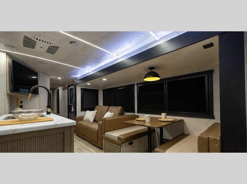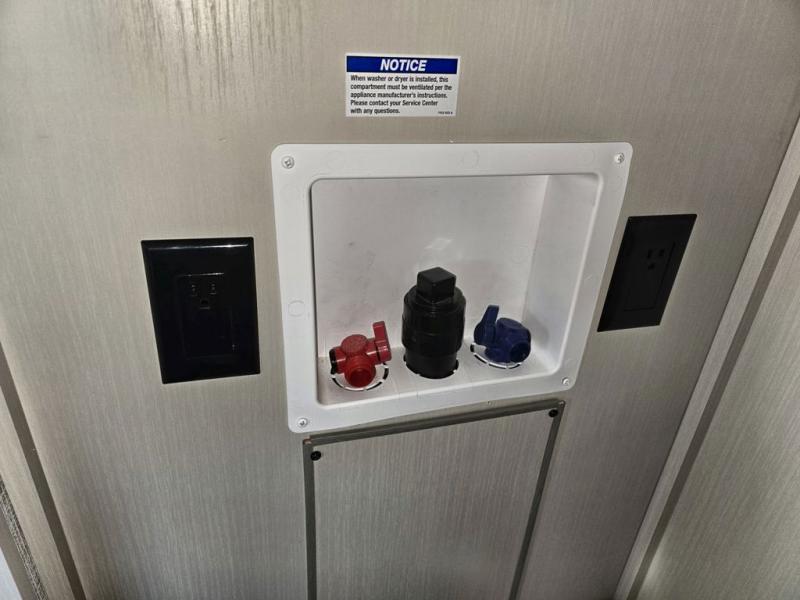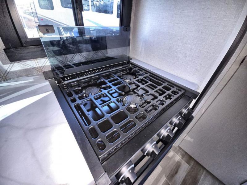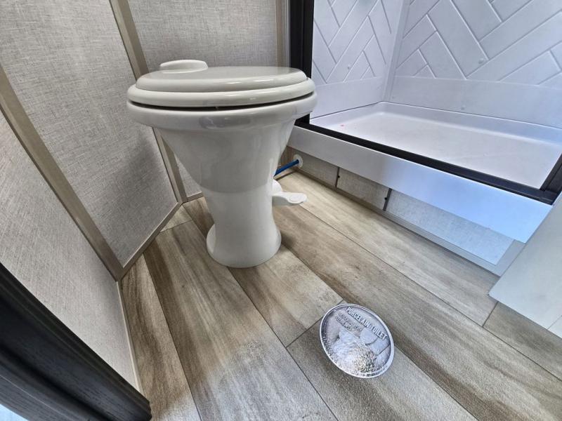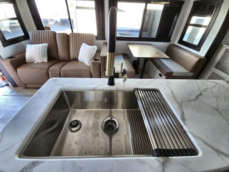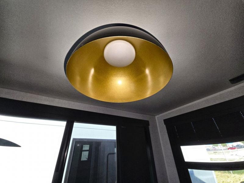 Your kids or friends are going to love camping in this travel trailer! It features a rear private bunkhouse with a bunk above a Versa queen convertible bed/sofa plus an additional bunk above an entertainment center with storage below. Just outside the bunkhouse is the kitchen with a 10 cu. ft. 12V black refrigerator, a microwave, a kitchen island, and a chef-sized walk-in pantry big enough to store everyone's favorite snacks. The booth dinette and the theatre seating are right next to panoramic windows so you can enjoy looking out at your beautiful scenery. You will also love taking a hot, steamy shower in the 30" x 36" shower with skylights and get a good night's rest on the queen bed with Versa Tilt in the front private bedroom!