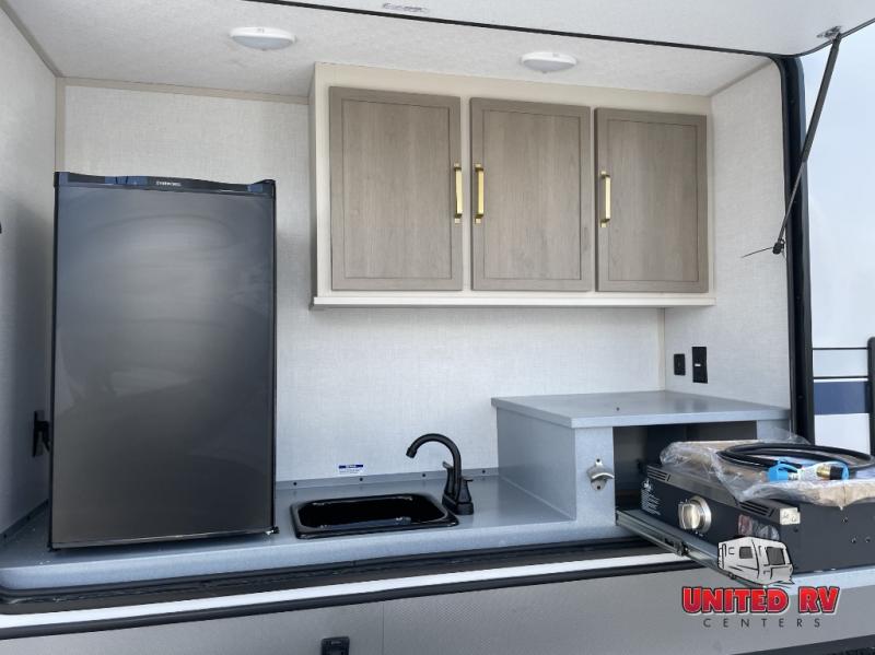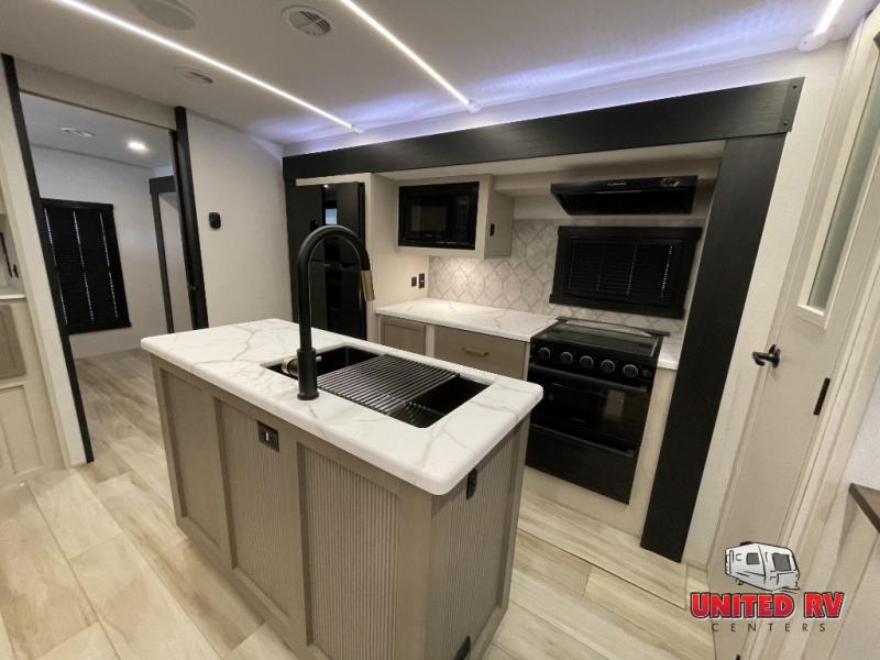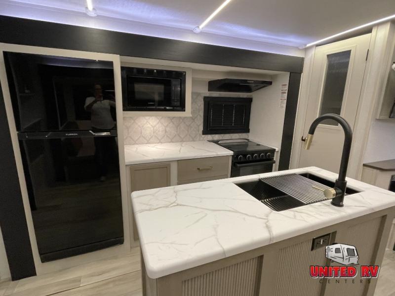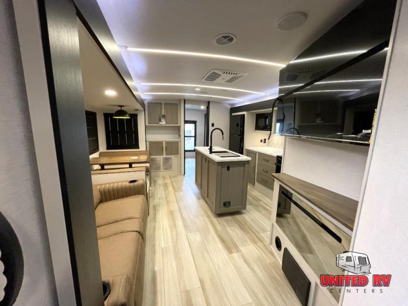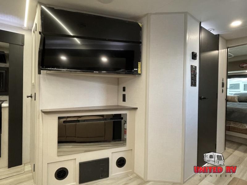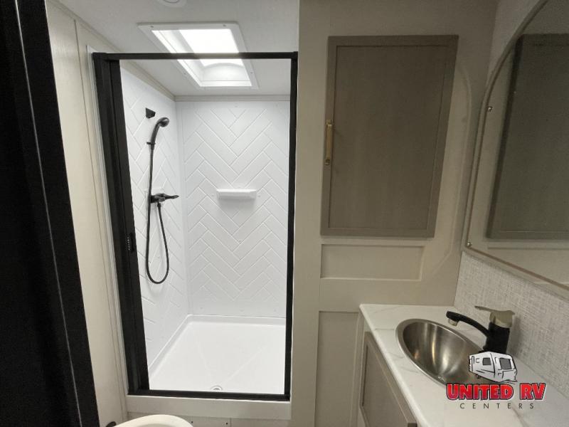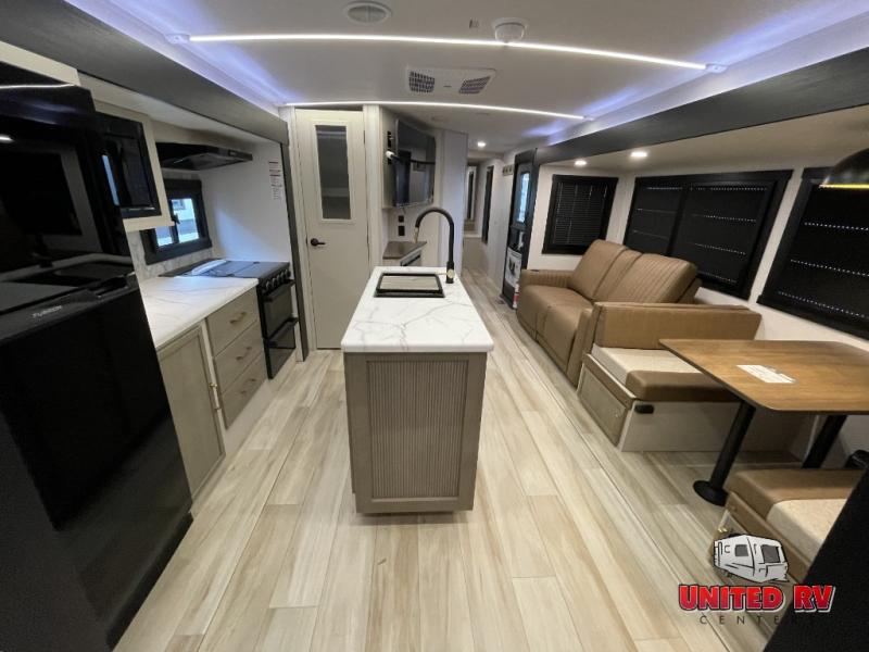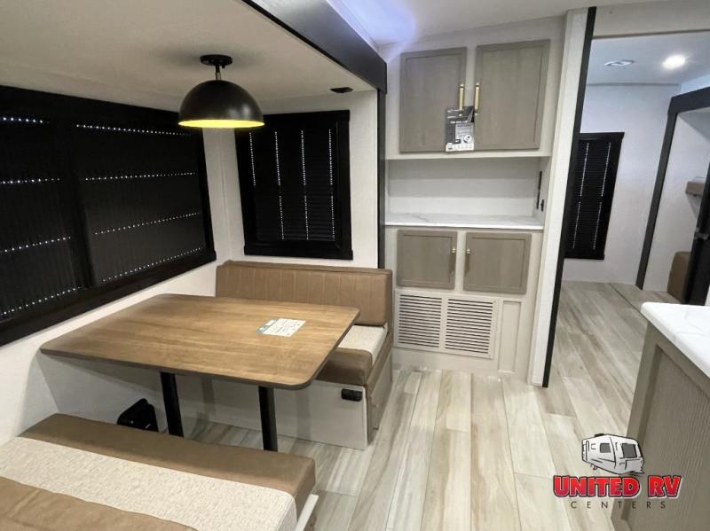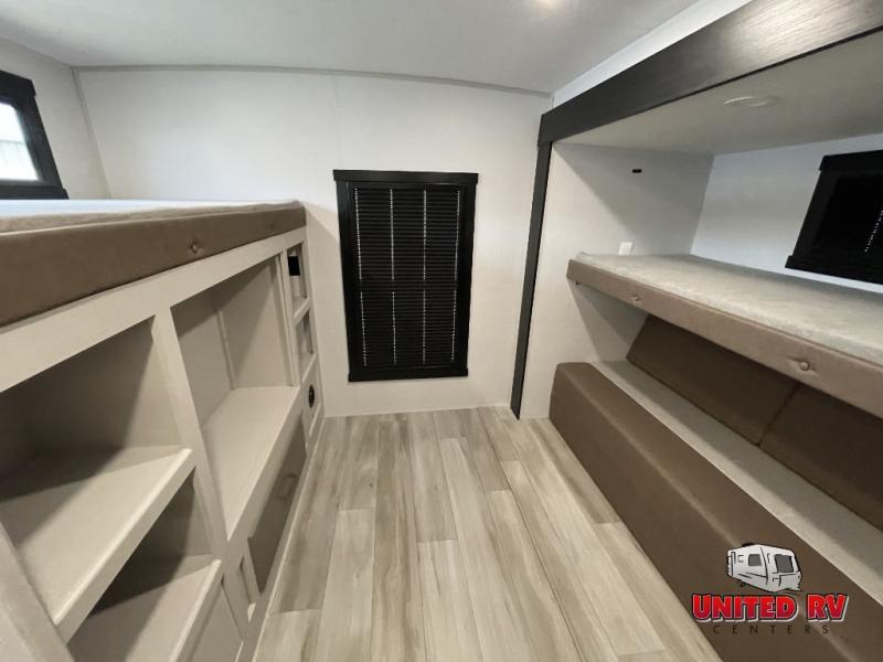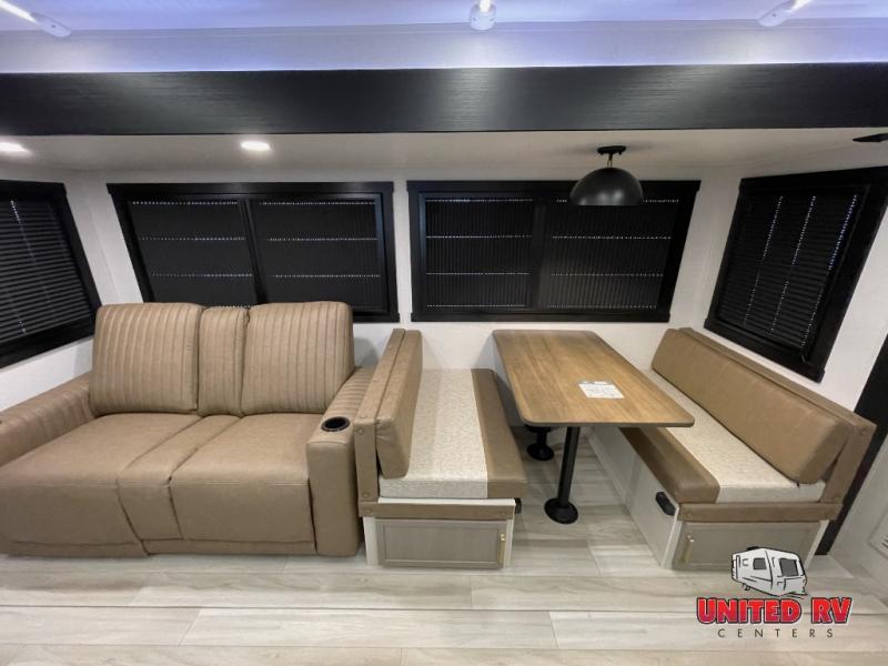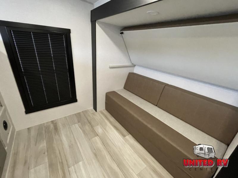Your kids or friends are going to love camping in this travel trailer! It features a rear private bunkhouse with a bunk above a Versa queen convertible bed/sofa plus an additional bunk above an entertainment center with storage below. Just outside the bunkhouse is the kitchen with a 10 cu. ft. 12V black refrigerator, a microwave, a kitchen island, and a chef-sized walk-in pantry big enough to store everyone's favorite snacks. The booth dinette and the theatre seating are right next to panoramic windows so you can enjoy looking out at your beautiful scenery. You will also love taking a hot, steamy shower in the 30" x 36" shower with skylights and get a good night's rest on the queen bed with Versa Tilt in the front private bedroom!