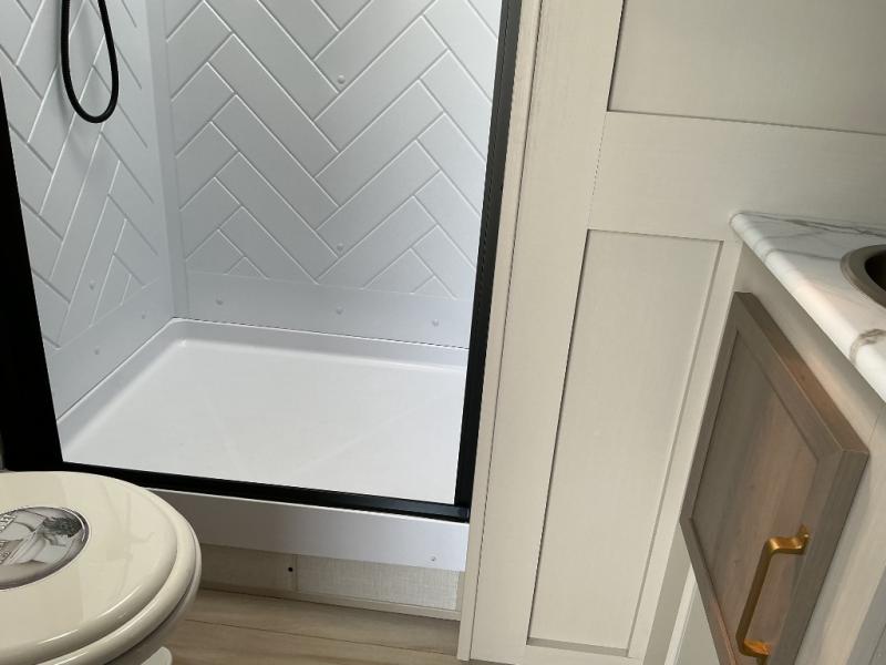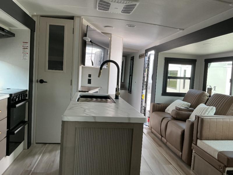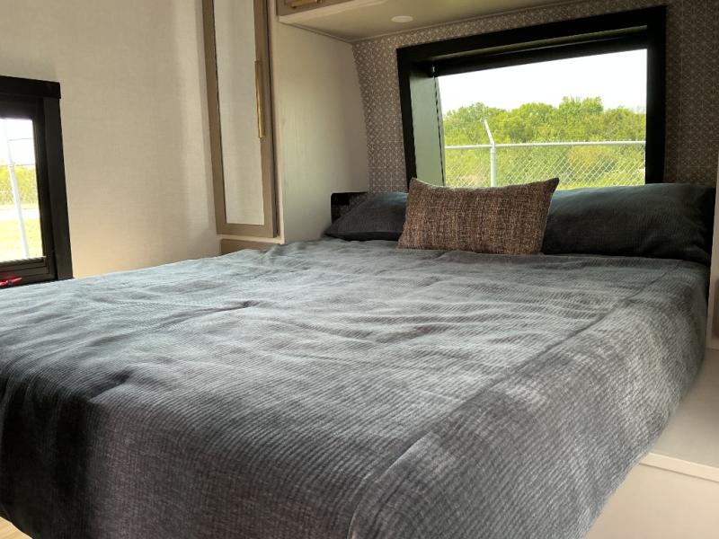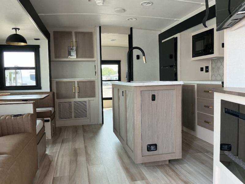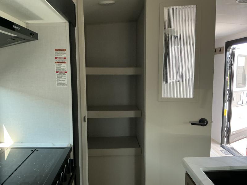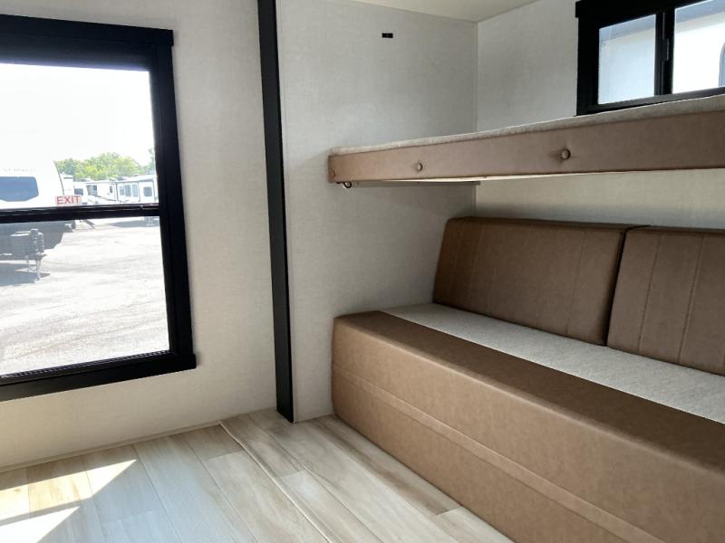 Your kids or friends are going to love camping in this travel trailer! It features a rear private bunkhouse with a bunk above a Versa queen convertible bed/sofa plus an additional bunk above an entertainment center with storage below. Just outside the bunkhouse is the kitchen with a 10 cu. ft. 12V black refrigerator, a microwave, a kitchen island, and a chef-sized walk-in pantry big enough to store everyone's favorite snacks. The booth dinette and the theatre seating are right next to panoramic windows so you can enjoy looking out at your beautiful scenery. You will also love taking a hot, steamy shower in the 30" x 36" shower with skylights and get a good night's rest on the queen bed with Versa Tilt in the front private bedroom!