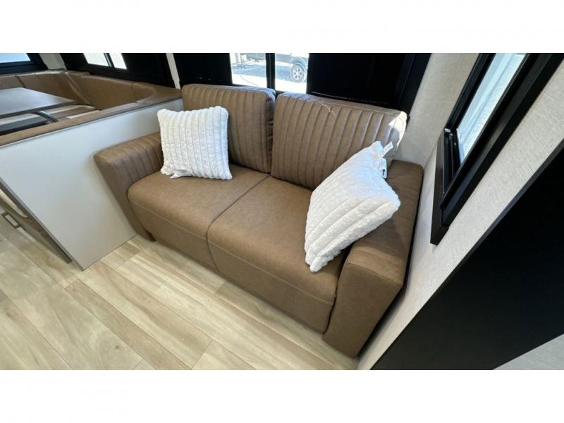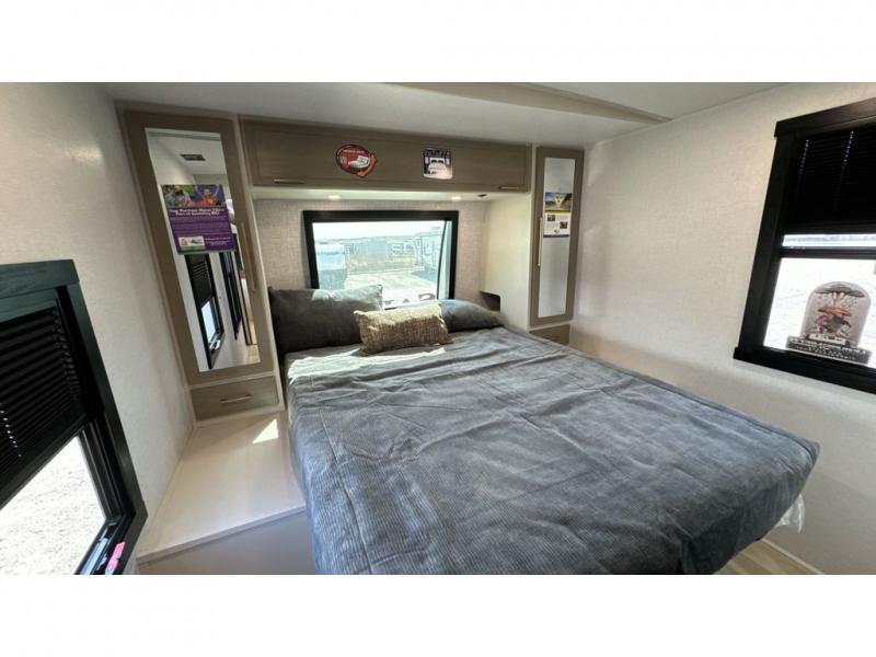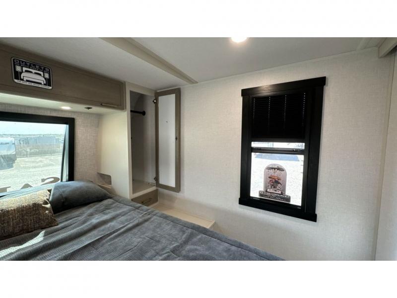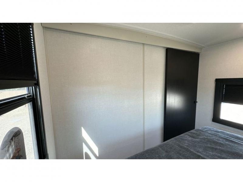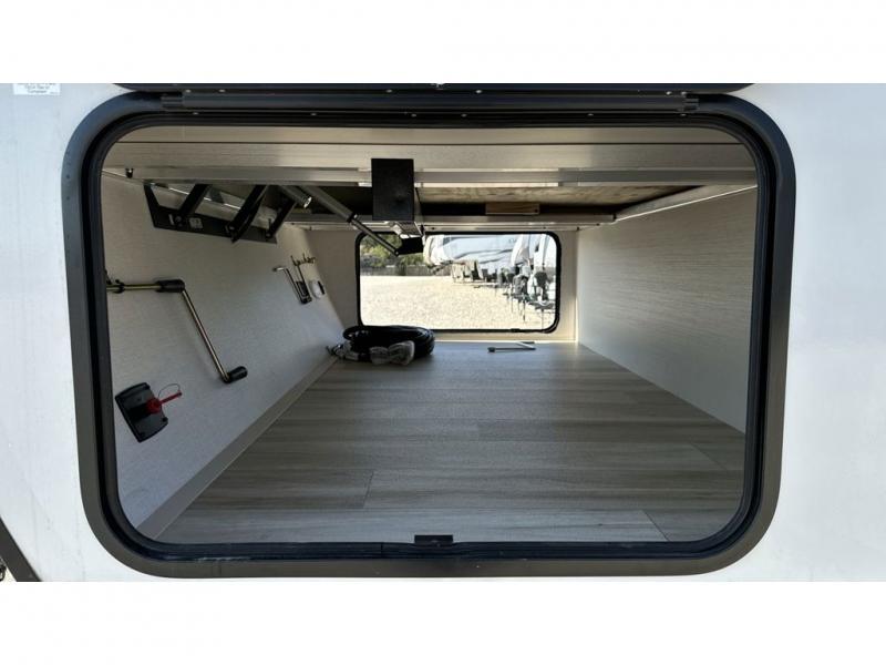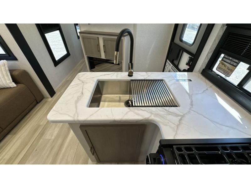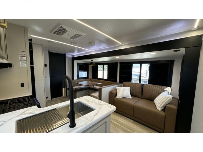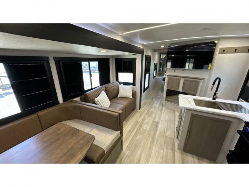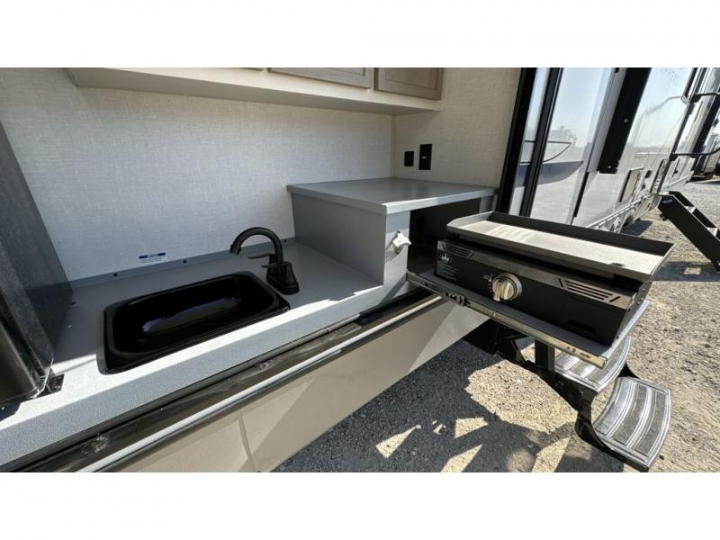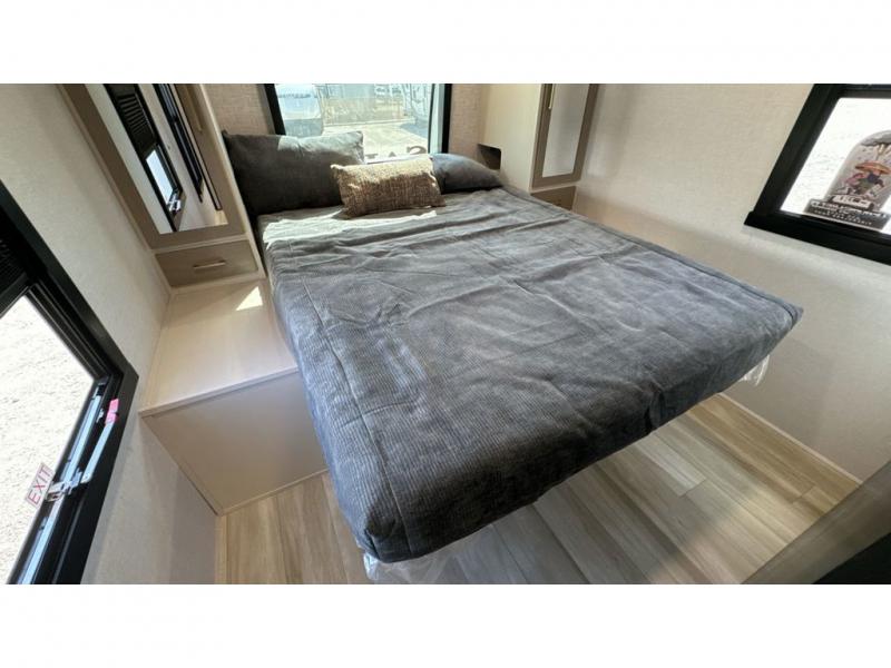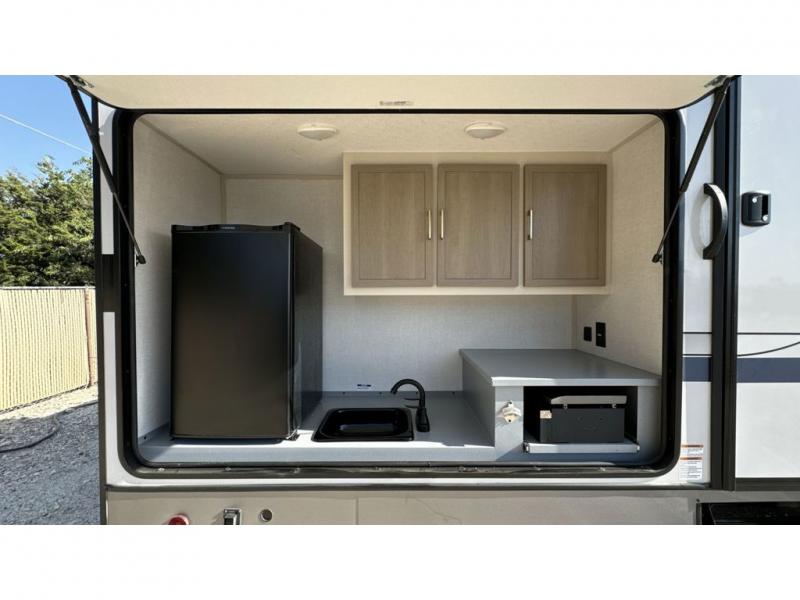 You won't believe all of the luxury features this travel trailer, including double entry doors, a U-shaped dinette, and panoramic windows in the slide out! The chef of your group will love cooking indoors with full amenities, and outdoors with the outside kitchen/bar so they can breathe in some fresh air while they sip on their favorite drink. The kids or your friends will love having their own private bunkhouse with a bunk above an entertainment center with storage below, and another bunk above a Versa queen convertible bed/sofa. And you will love resting on the queen bed with Versa Tilt in the front private bedroom. There is also a Texas-sized pass-through storage area big enough for your camping gear too!