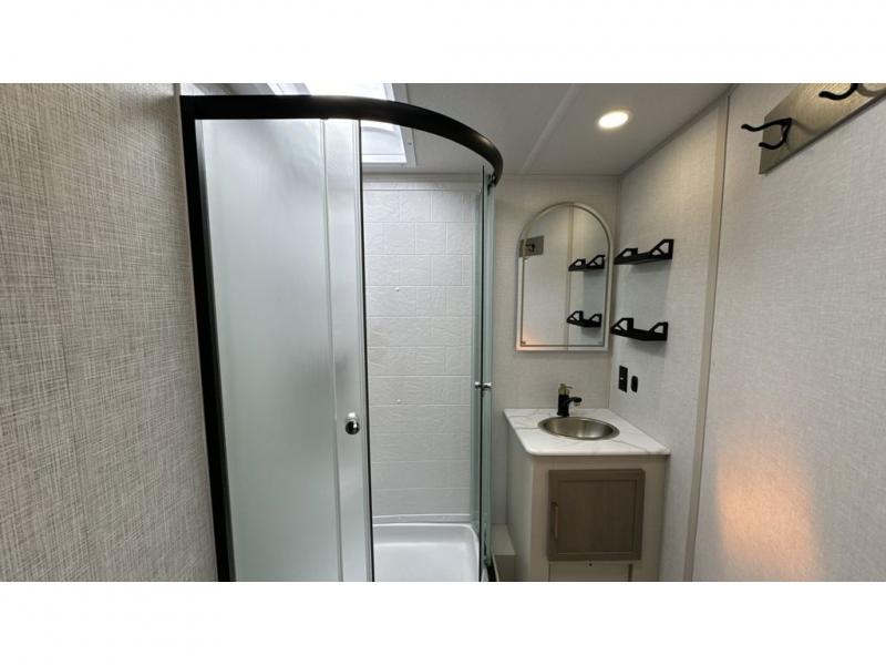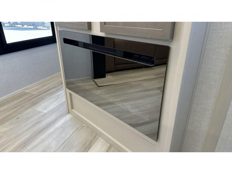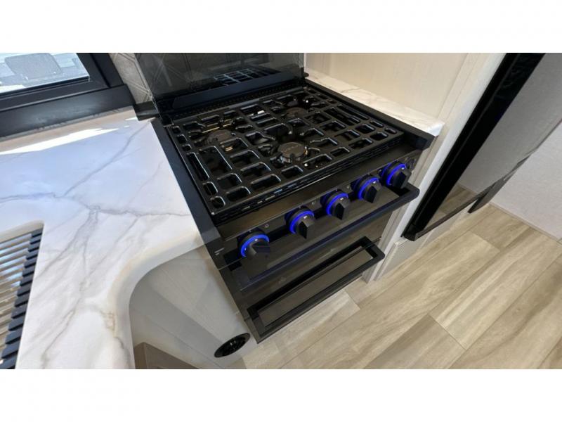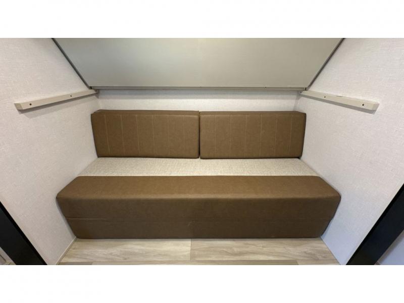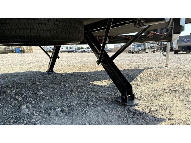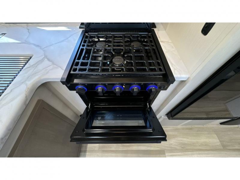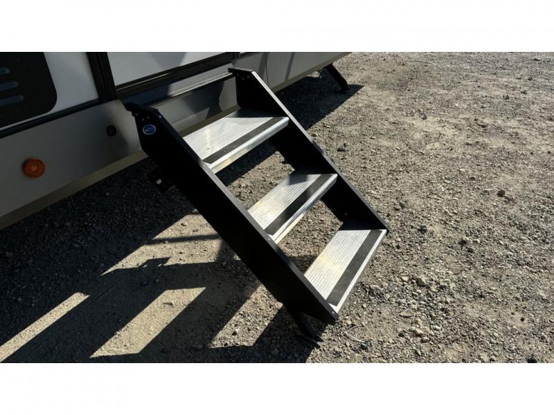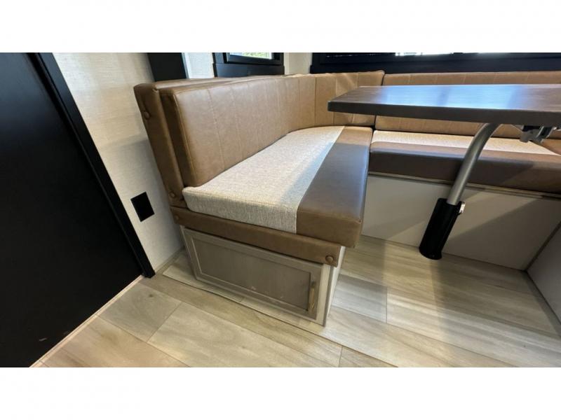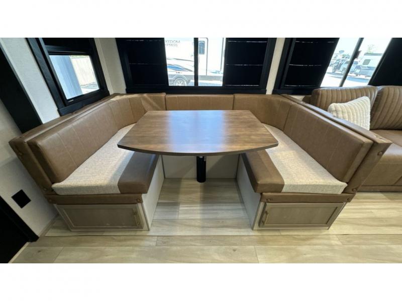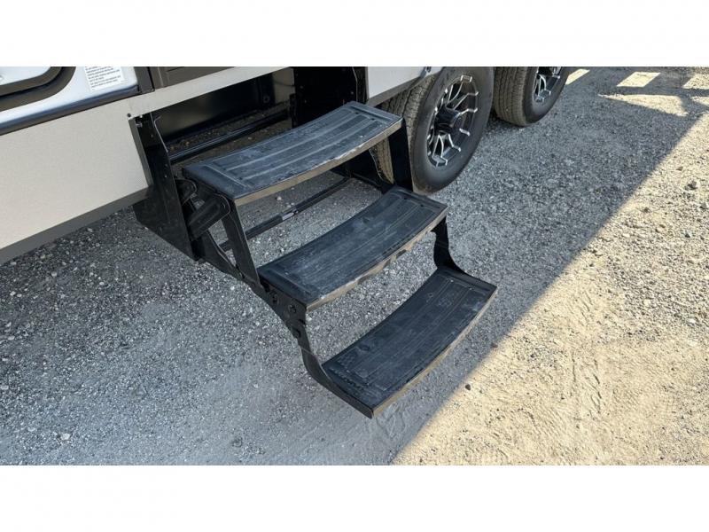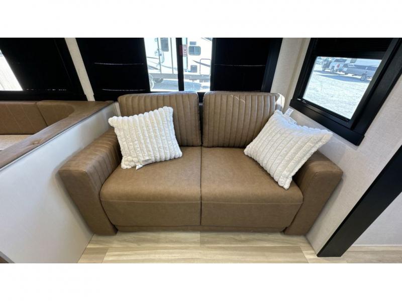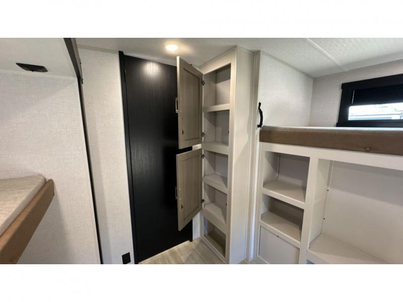 You won't believe all of the luxury features this travel trailer, including double entry doors, a U-shaped dinette, and panoramic windows in the slide out! The chef of your group will love cooking indoors with full amenities, and outdoors with the outside kitchen/bar so they can breathe in some fresh air while they sip on their favorite drink. The kids or your friends will love having their own private bunkhouse with a bunk above an entertainment center with storage below, and another bunk above a Versa queen convertible bed/sofa. And you will love resting on the queen bed with Versa Tilt in the front private bedroom. There is also a Texas-sized pass-through storage area big enough for your camping gear too!