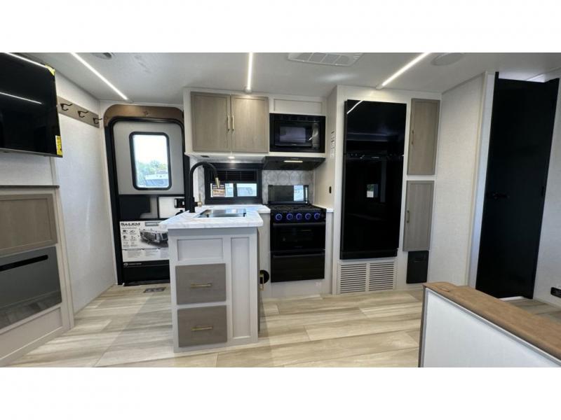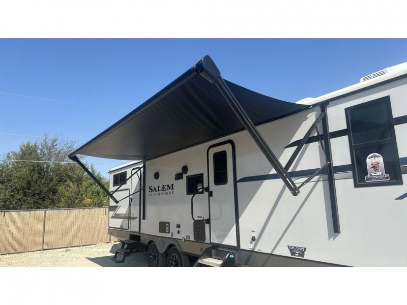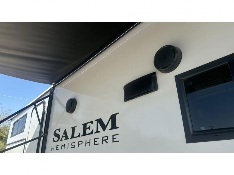 The Salem Hemisphere fifth wheels and travel trailers by Forest River are packed with features, while still being value-minded! Each model is constructed with laminated "Aluma Frame" sidewalls and floor with block foam insulation plus full length barreled ceilings for added head space. There are LED awning, marker and tail lights outside, along with an extra large pass-thru storage with slam latch baggage doors, plus solar prep and Lippert On-The-Go ladder prep. The 60K on-demand tankless water heater will provide endless hot showers, and the JBL sound system includes a head unit plus interior and exterior speakers to keep the party going. There are also many interior comforts found throughout that will make you feel right at home!
