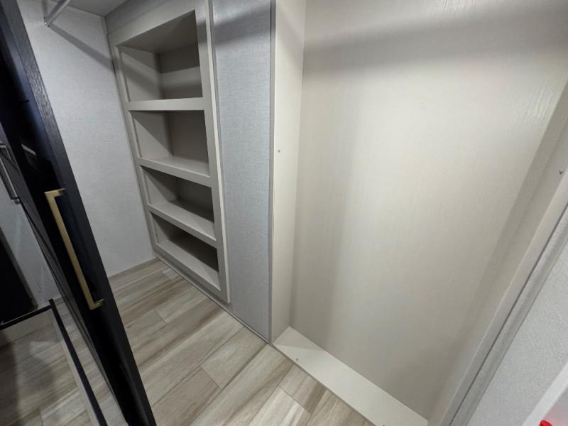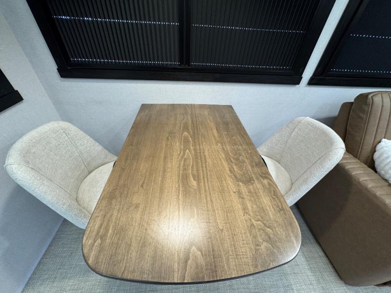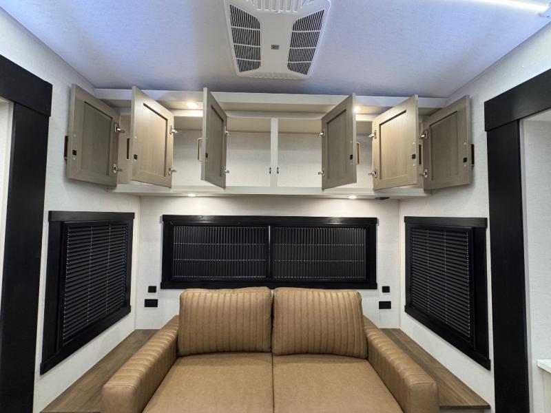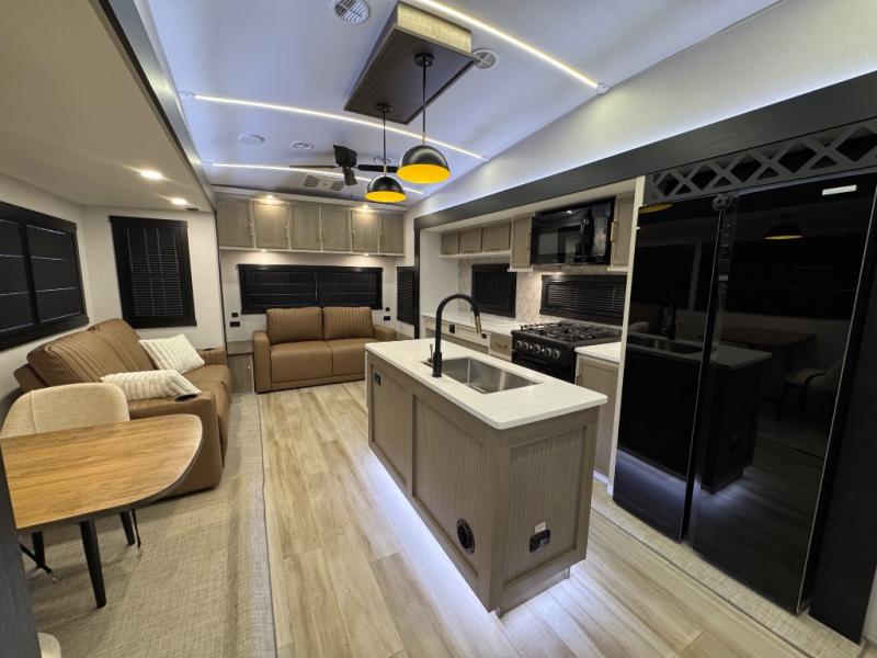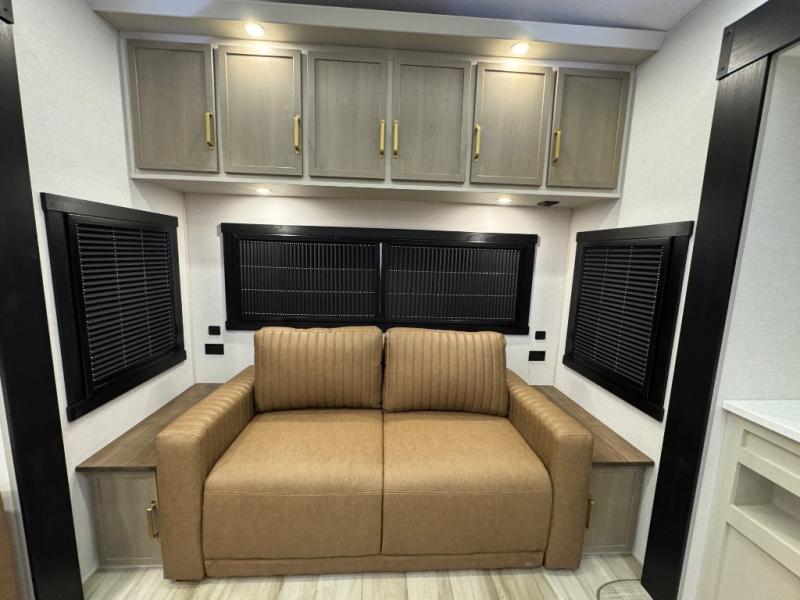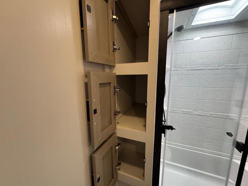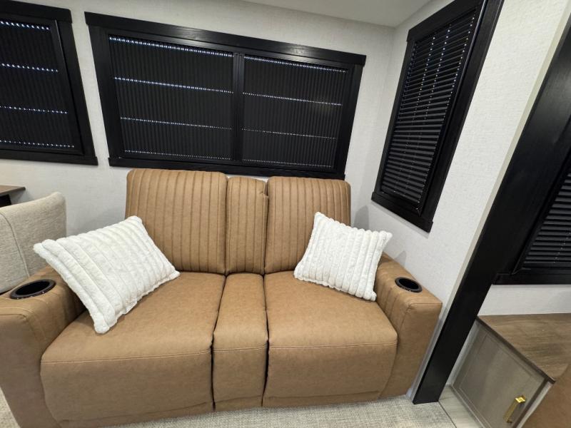 Each camping trip in this fifth wheel will be spent in comfort thanks to the spacious living areas and added amenities. Once you arrive at your favorite campground, you can set up the two awnings, grab your camp chairs from the XL Texas-size pass-through, and relax with a cold drink. If you'd rather kick your feet up inside, the theater seating across from the pop-up TV and fireplace will also bring lots of comfort! A rear tri-fold sofa will allow you to invite two overnight guests along, and the table and chairs provide a place to dine at each morning. You'll feel right at home with a spacious bathroom that includes a residential-style walk-in shower with a skylight, and a front private bedroom. There is a custom king bed with Versa-Tilt here, along with a dresser with a bench beside it, and a walk-in closet with shelves and washer/dryer prep if you plan to go full-time!
