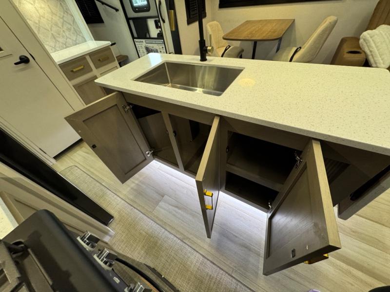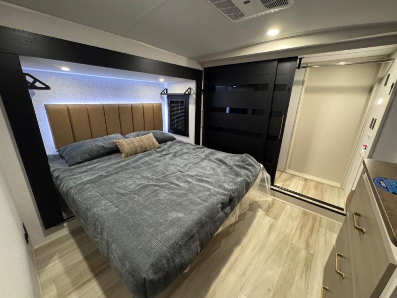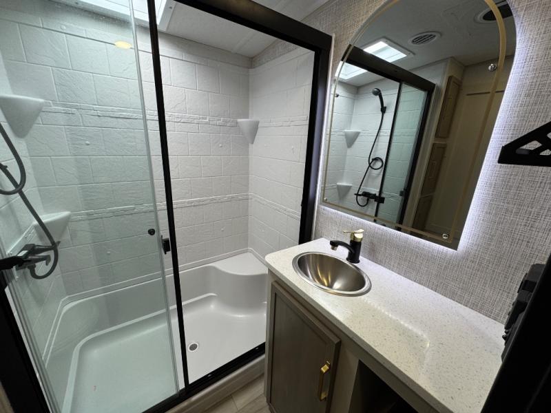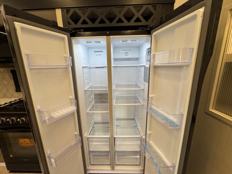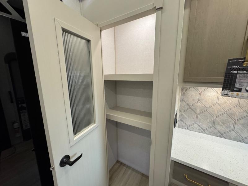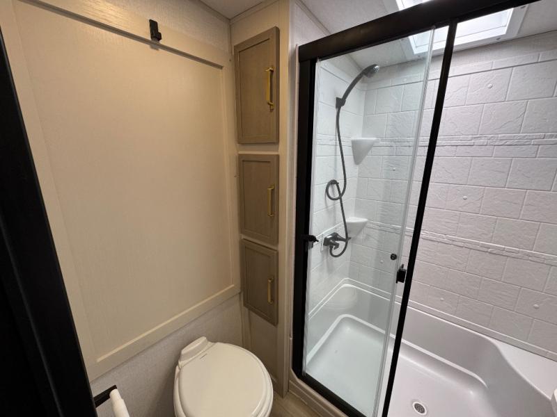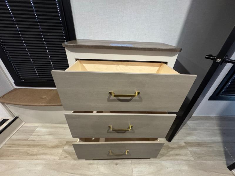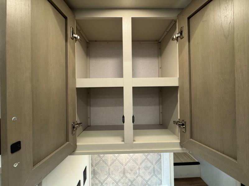 Each camping trip in this fifth wheel will be spent in comfort thanks to the spacious living areas and added amenities. Once you arrive at your favorite campground, you can set up the two awnings, grab your camp chairs from the XL Texas-size pass-through, and relax with a cold drink. If you'd rather kick your feet up inside, the theater seating across from the pop-up TV and fireplace will also bring lots of comfort! A rear tri-fold sofa will allow you to invite two overnight guests along, and the table and chairs provide a place to dine at each morning. You'll feel right at home with a spacious bathroom that includes a residential-style walk-in shower with a skylight, and a front private bedroom. There is a custom king bed with Versa-Tilt here, along with a dresser with a bench beside it, and a walk-in closet with shelves and washer/dryer prep if you plan to go full-time!
