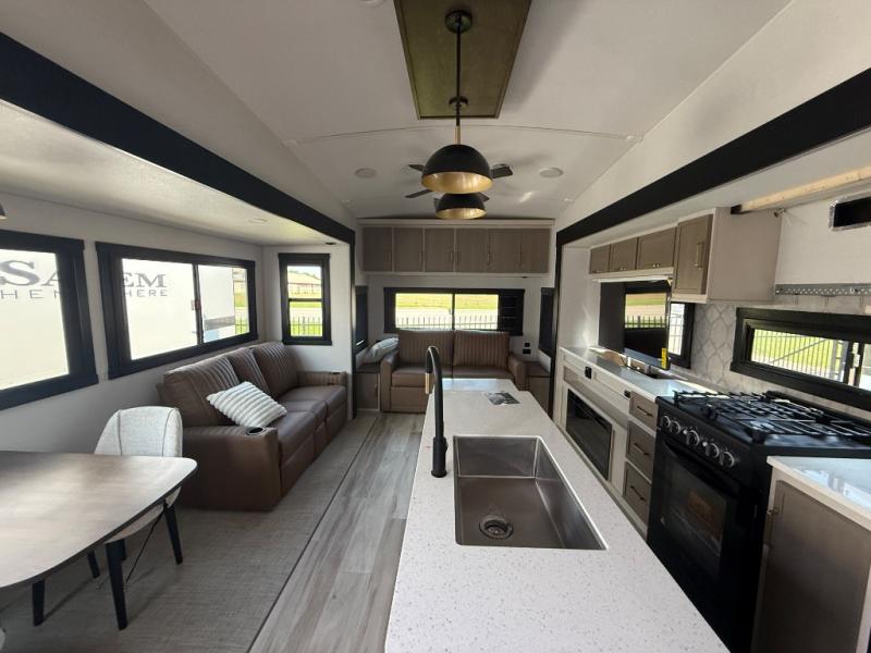 The Salem Hemisphere fifth wheels and travel trailers by Forest River are packed with features, while still being value-minded! Each model is constructed with laminated "Aluma Frame" sidewalls and floor with block foam insulation plus full length barreled ceilings for added head space. There are LED awning, marker and tail lights outside, along with an extra large pass-thru storage with slam latch baggage doors, plus solar prep and Lippert On-The-Go ladder prep. The 60K on-demand tankless water heater will provide endless hot showers, and the JBL sound system includes a head unit plus interior and exterior speakers to keep the party going. There are also many interior comforts found throughout that will make you feel right at home!