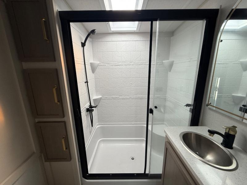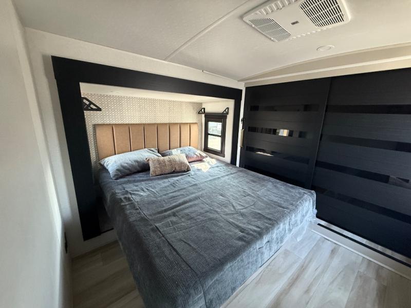 Each camping trip in this fifth wheel will be spent in comfort thanks to the spacious living areas and added amenities. Once you arrive at your favorite campground, you can set up the two awnings, grab your camp chairs from the XL Texas-size pass-through, and relax with a cold drink. If you'd rather kick your feet up inside, the theater seating across from the pop-up TV and fireplace will also bring lots of comfort! A rear tri-fold sofa will allow you to invite two overnight guests along, and the table and chairs provide a place to dine at each morning. You'll feel right at home with a spacious bathroom that includes a residential-style walk-in shower with a skylight, and a front private bedroom. There is a custom king bed with Versa-Tilt here, along with a dresser with a bench beside it, and a walk-in closet with shelves and washer/dryer prep if you plan to go full-time!