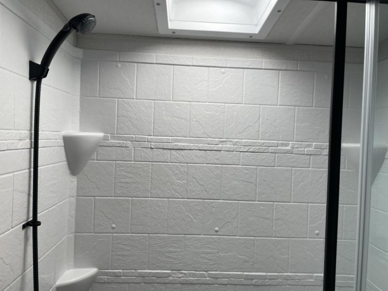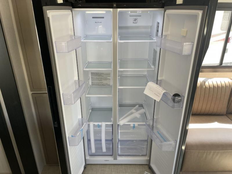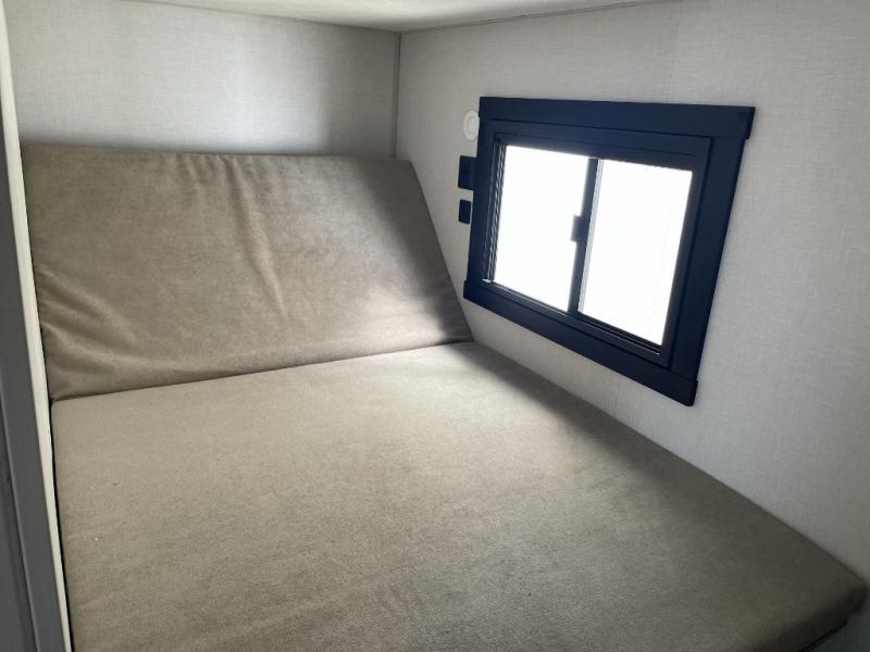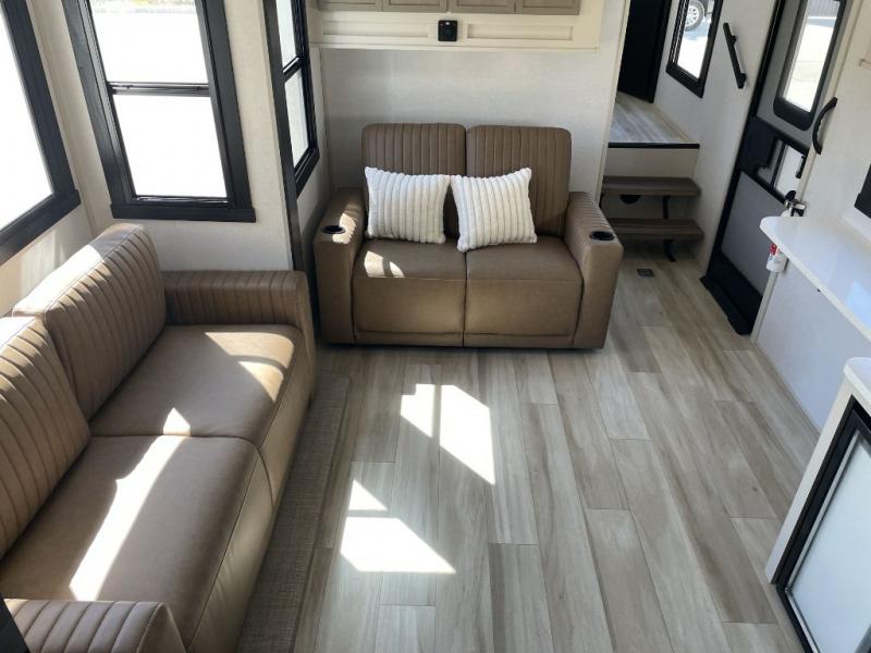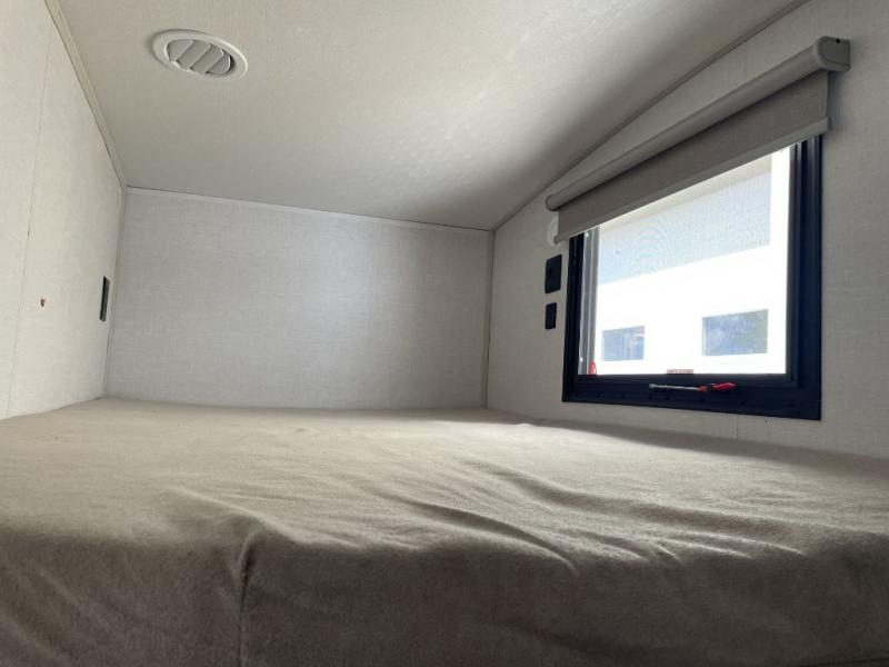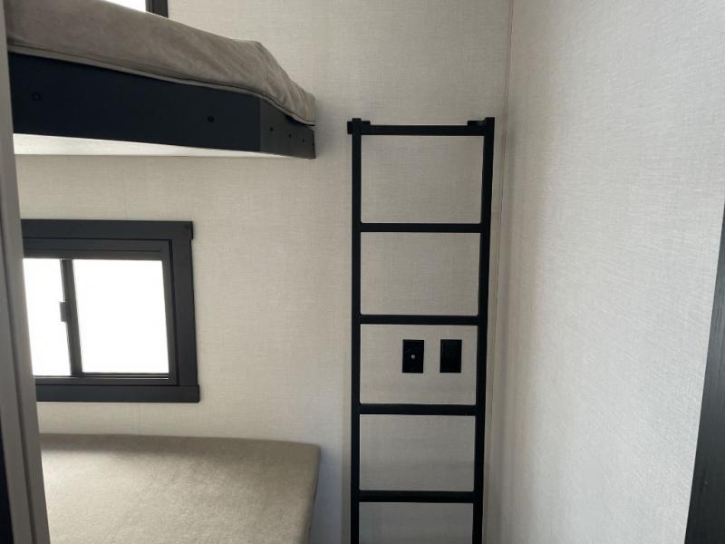 This versatile bunkhouse model is perfect for your crew of eight! Whether you're relaxing on the tri-fold sofa or theater seating, visiting under the two power awnings, or taking a rest in the front private bedroom, you're sure to meet comfort at every turn. A beverage center with a wine/beverage refrigerator will let you entertain guests, and if they plan to stay over, the rear bunkhouse will be perfect. Here, you'll find double-size bunks and Versa Tilt on the bottom bunk for added convenience. There is generous counter space in the full kitchen, and the fixed bar top with two stools provides a place for the little ones to enjoy their breakfast at. A spacious full bath includes a walk-in residential-style shower with a skylight, and there is a porcelain toilet just like at home. You'll love retreating to your own space each night in the front bedroom that includes a custom king bed slide out, a closet with shelves plus washer and dryer prep, and a dresser so everything has its own place!