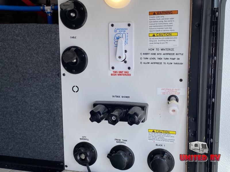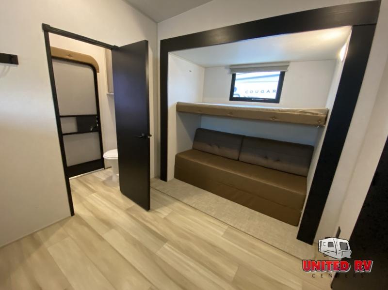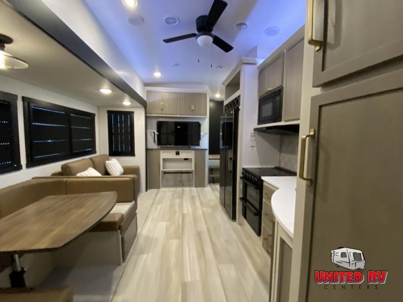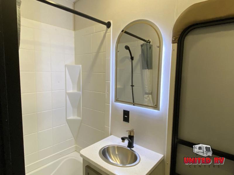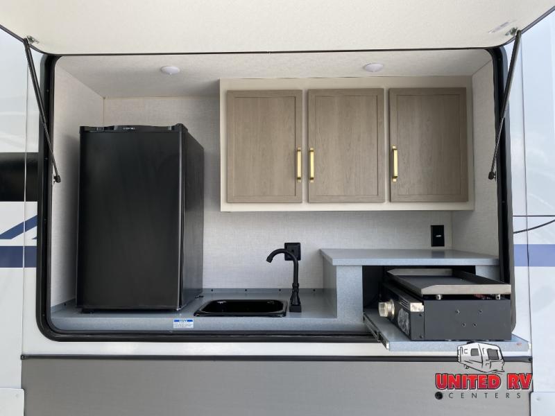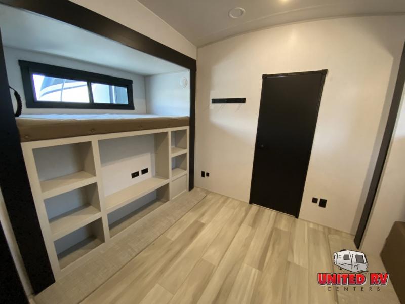 With two full bathrooms, everyone will stay clean in this fifth wheel! The double entry doors makes for a smooth flow of traffic and the unique rear entrance leads directly into the rear full bathroom. The private bunkhouse features not only one bunk above a Versa queen convertible bed/sofa, but also a second bunk above with storage. The U-shaped dinette is the perfect place for you to enjoy your meals at, play some card games and even transform into an extra sleeping space. The exterior has plenty of features you will love too like the outside kitchen/bar so you can have a good time cooking outdoors and a coax/TV hookup that you can add your own outside TV, plus an extra large pass-through storage area for your outdoor gear. When you're ready for bed, the custom king bed with Versa Tilt will be waiting for you in the front private bedroom!