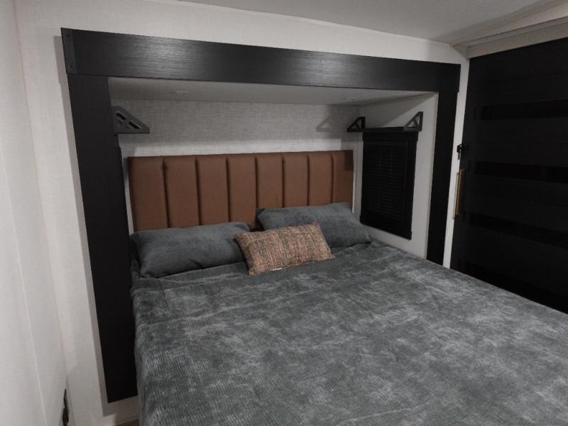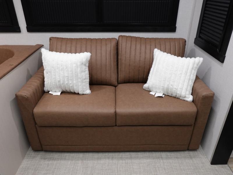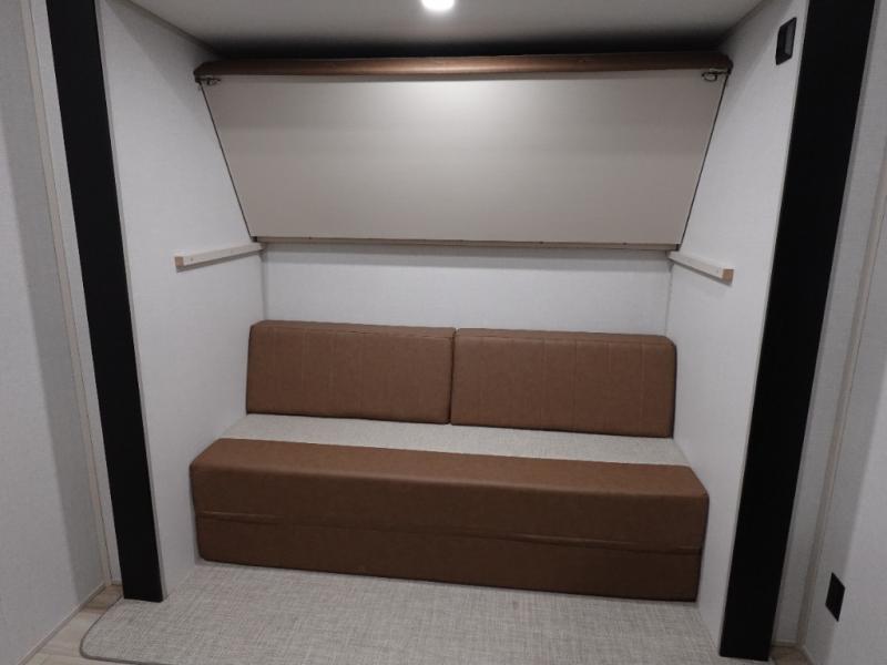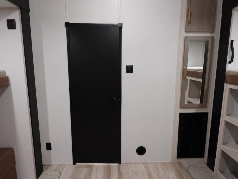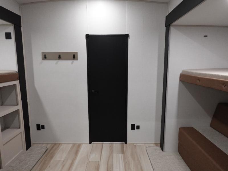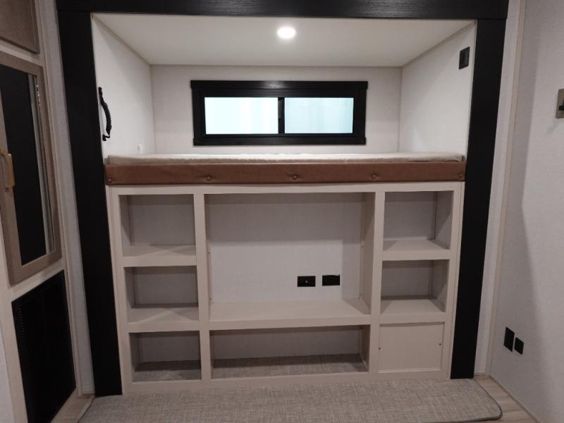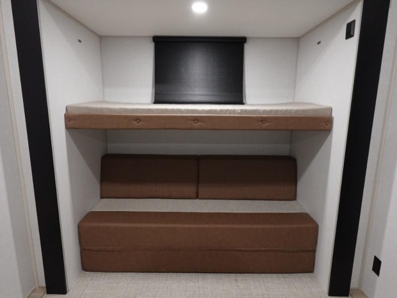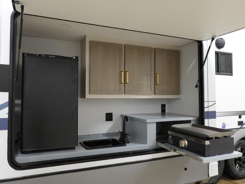 With two full bathrooms, everyone will stay clean in this fifth wheel! The double entry doors makes for a smooth flow of traffic and the unique rear entrance leads directly into the rear full bathroom. The private bunkhouse features not only one bunk above a Versa queen convertible bed/sofa, but also a second bunk above with storage. The U-shaped dinette is the perfect place for you to enjoy your meals at, play some card games and even transform into an extra sleeping space. The exterior has plenty of features you will love too like the outside kitchen/bar so you can have a good time cooking outdoors and a coax/TV hookup that you can add your own outside TV, plus an extra large pass-through storage area for your outdoor gear. When you're ready for bed, the custom king bed will be waiting for you in the front private bedroom!