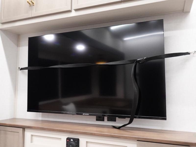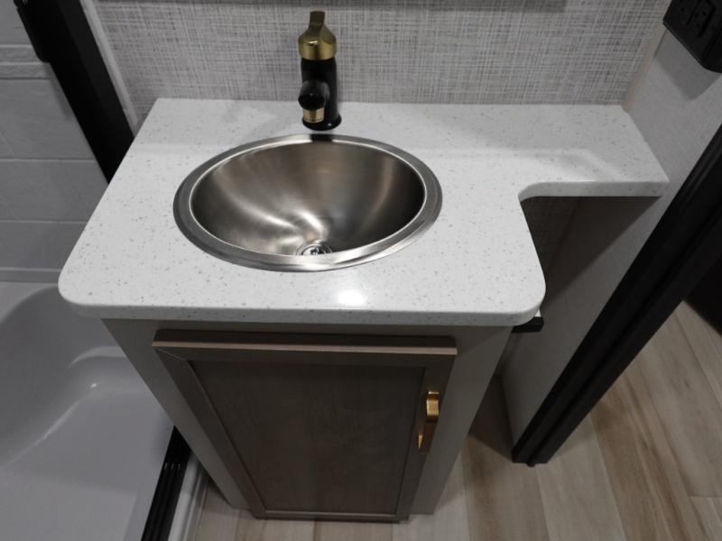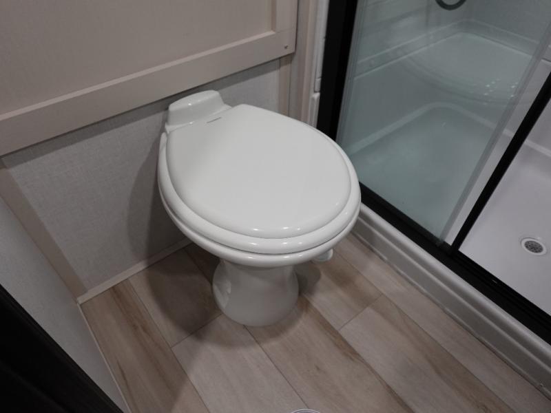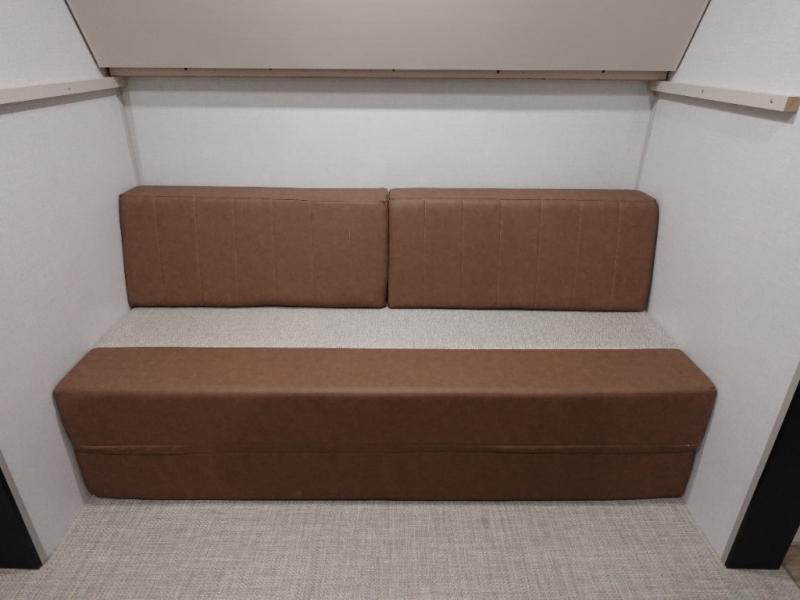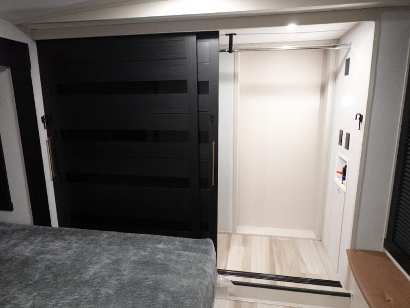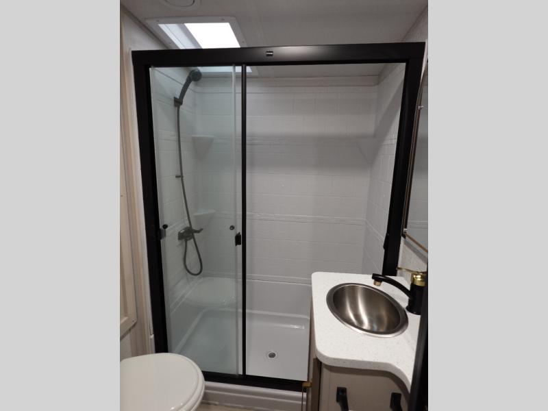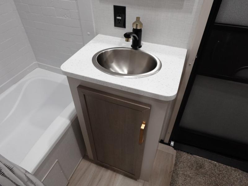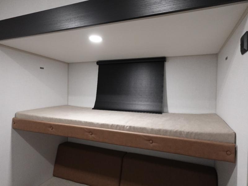 With two full bathrooms, everyone will stay clean in this fifth wheel! The double entry doors makes for a smooth flow of traffic and the unique rear entrance leads directly into the rear full bathroom. The private bunkhouse features not only one bunk above a Versa queen convertible bed/sofa, but also a second bunk above with storage. The U-shaped dinette is the perfect place for you to enjoy your meals at, play some card games and even transform into an extra sleeping space. The exterior has plenty of features you will love too like the outside kitchen/bar so you can have a good time cooking outdoors and a coax/TV hookup that you can add your own outside TV, plus an extra large pass-through storage area for your outdoor gear. When you're ready for bed, the custom king bed will be waiting for you in the front private bedroom!