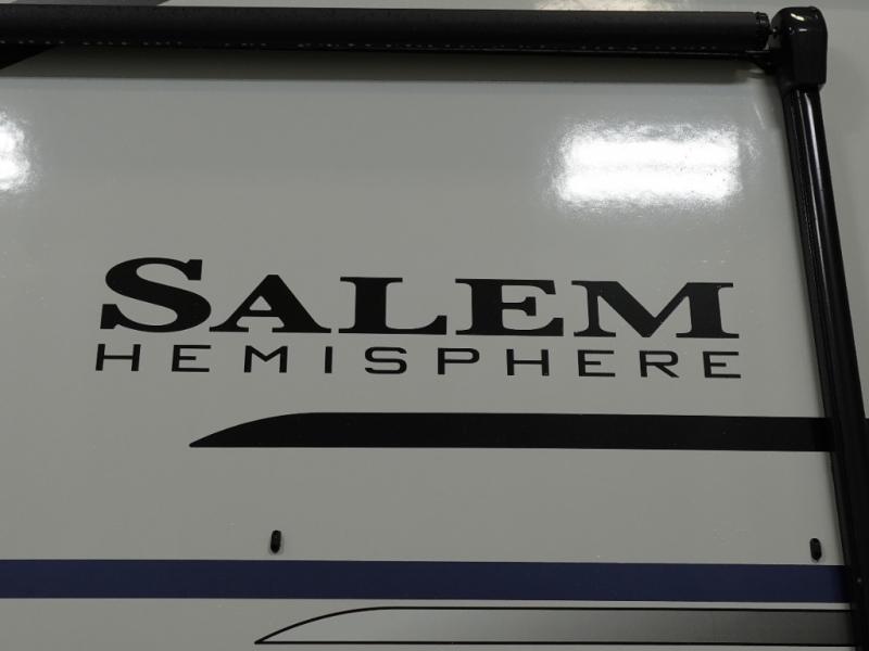 The Salem Hemisphere fifth wheels and travel trailers by Forest River are packed with features, while still being value-minded! Each model is constructed with laminated "Aluma Frame" sidewalls and floor with block foam insulation plus full length barreled ceilings for added head space. There are LED awning, marker and tail lights outside, along with an extra large pass-thru storage with slam latch baggage doors, plus solar prep and Lippert On-The-Go ladder prep. The 60K on-demand tankless water heater will provide endless hot showers, and the JBL sound system includes a head unit plus interior and exterior speakers to keep the party going. There are also many interior comforts found throughout that will make you feel right at home!
