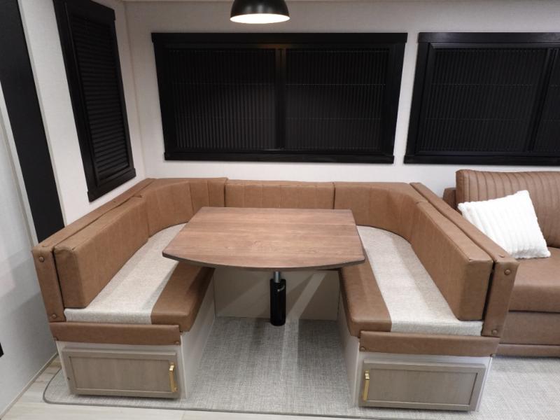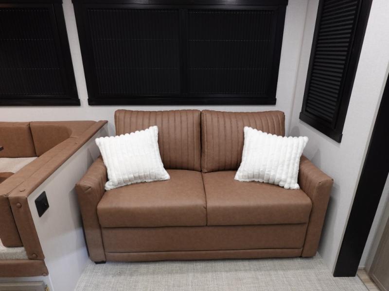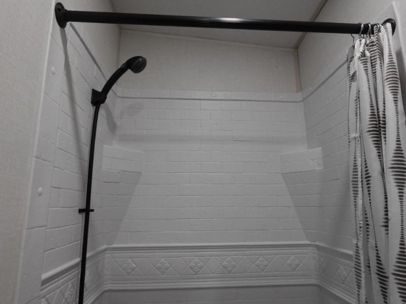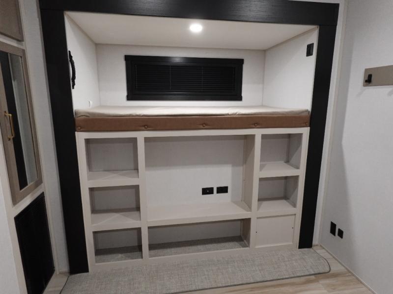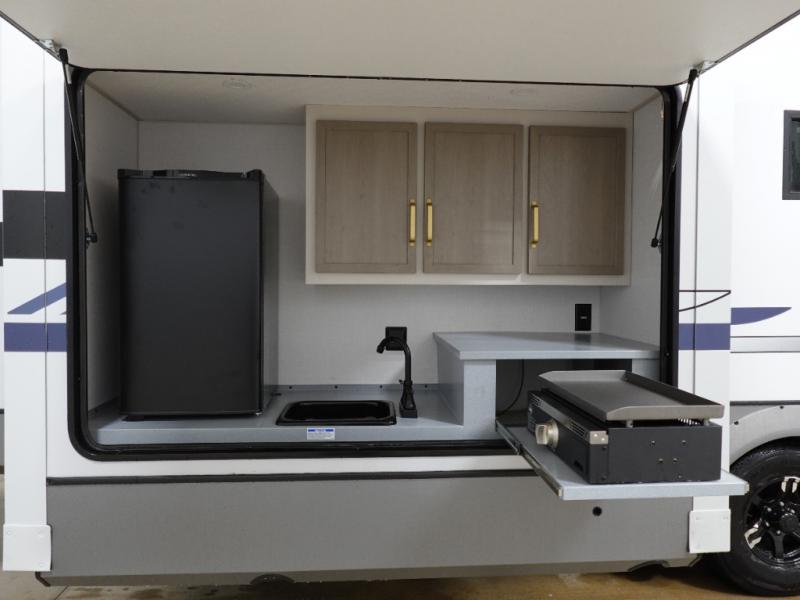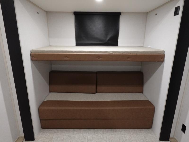 With two full bathrooms, everyone will stay clean in this fifth wheel! The double entry doors makes for a smooth flow of traffic and the unique rear entrance leads directly into the rear full bathroom. The private bunkhouse features not only one bunk above a Versa queen convertible bed/sofa, but also a second bunk above with storage. The U-shaped dinette is the perfect place for you to enjoy your meals at, play some card games and even transform into an extra sleeping space. The exterior has plenty of features you will love too like the outside kitchen/bar so you can have a good time cooking outdoors and a coax/TV hookup that you can add your own outside TV, plus an extra large pass-through storage area for your outdoor gear. When you're ready for bed, the custom king bed will be waiting for you in the front private bedroom!