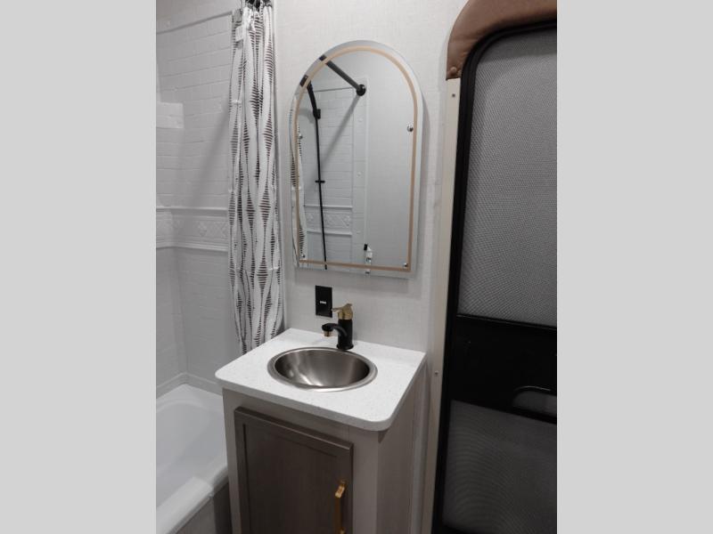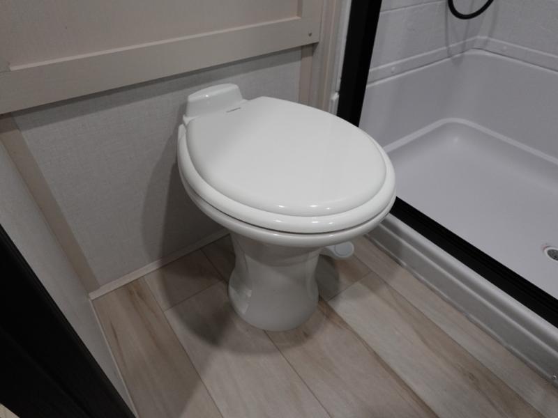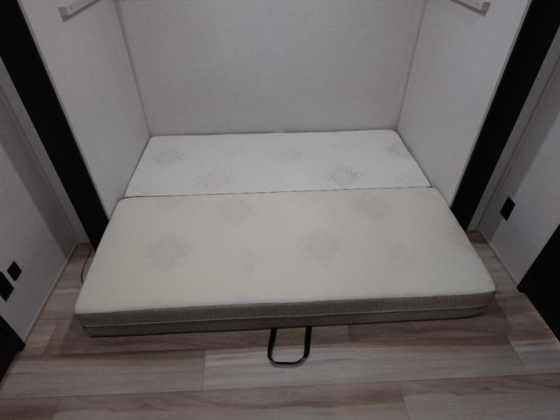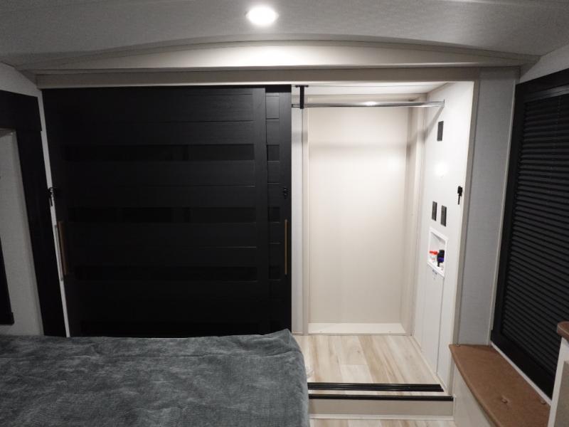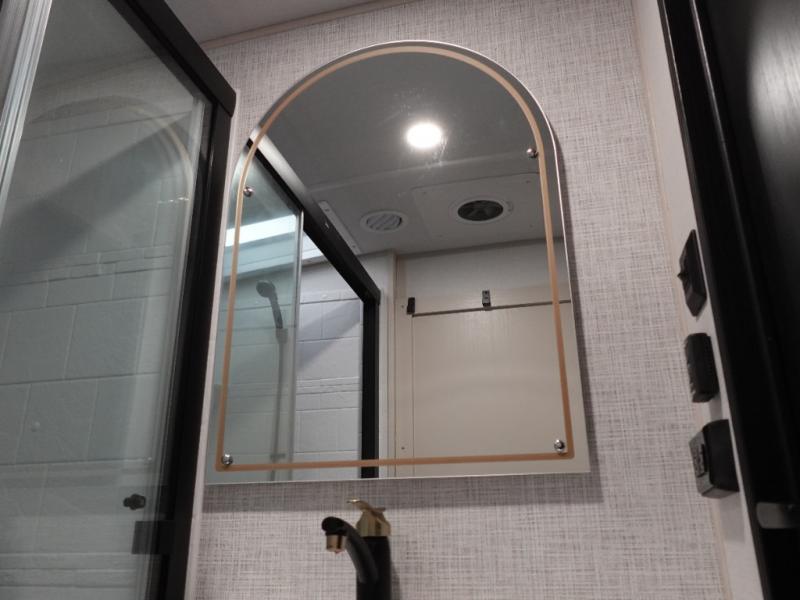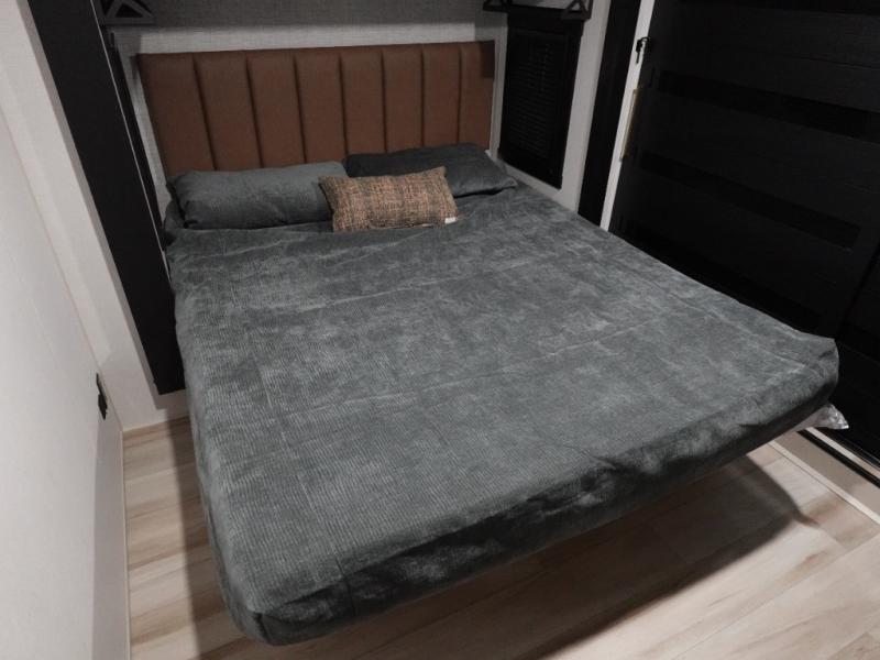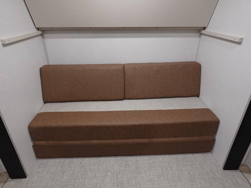 With two full bathrooms, everyone will stay clean in this fifth wheel! The double entry doors makes for a smooth flow of traffic and the unique rear entrance leads directly into the rear full bathroom. The private bunkhouse features not only one bunk above a Versa queen convertible bed/sofa, but also a second bunk above with storage. The U-shaped dinette is the perfect place for you to enjoy your meals at, play some card games and even transform into an extra sleeping space. The exterior has plenty of features you will love too like the outside kitchen/bar so you can have a good time cooking outdoors and a coax/TV hookup that you can add your own outside TV, plus an extra large pass-through storage area for your outdoor gear. When you're ready for bed, the custom king bed will be waiting for you in the front private bedroom!