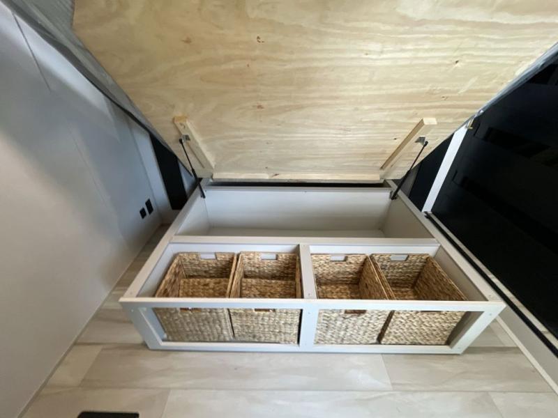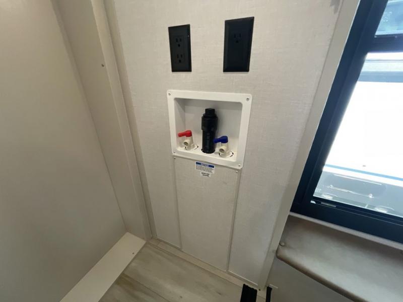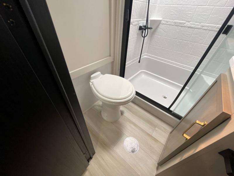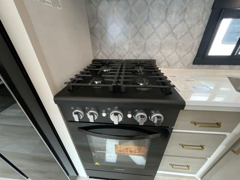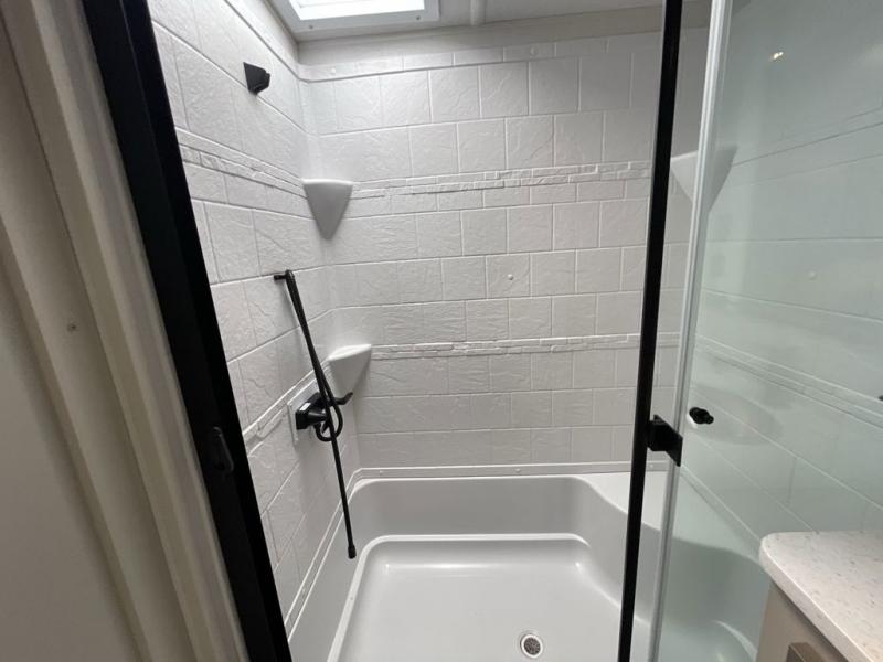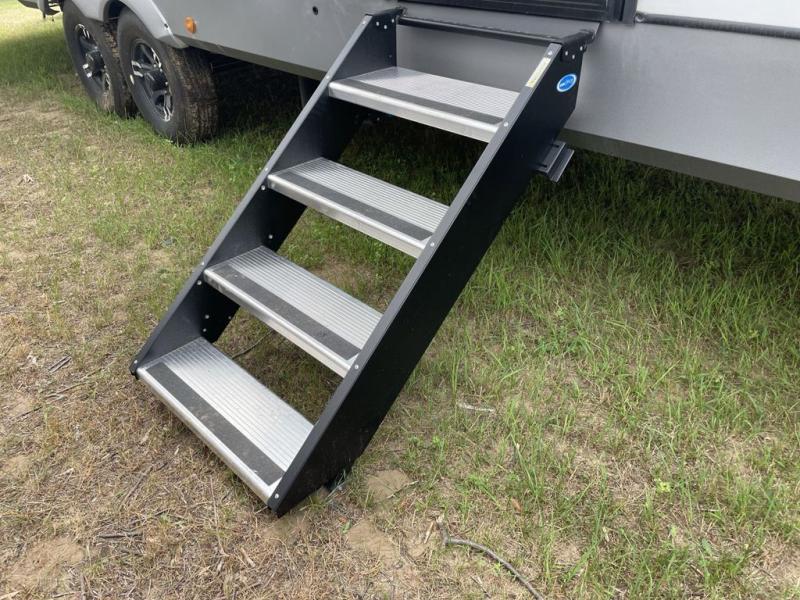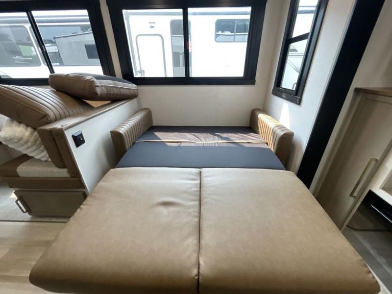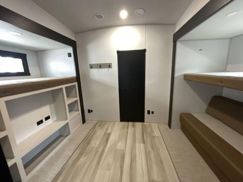 With two full bathrooms, everyone will stay clean in this fifth wheel! The double entry doors makes for a smooth flow of traffic and the unique rear entrance leads directly into the rear full bathroom. The private bunkhouse features not only one bunk above a Versa queen convertible bed/sofa, but also a second bunk above with storage. The U-shaped dinette is the perfect place for you to enjoy your meals at, play some card games and even transform into an extra sleeping space. The exterior has plenty of features you will love too like the outside kitchen/bar so you can have a good time cooking outdoors and a coax/TV hookup that you can add your own outside TV, plus an extra large pass-through storage area for your outdoor gear. When you're ready for bed, the custom king bed will be waiting for you in the front private bedroom!