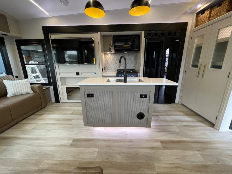 You won't know where to begin when you enter this fifth wheel! The rear living area has plenty of entertainment and seating choices between the tri-fold sofa and the theatre seating with cupholders, and the 50" LED TV will be perfect for movie nights. Meal prepping and clean up will be a breeze thanks to the kitchen island with a large sink, and the deluxe French door pantry that is big enough to store everyone's favorite snacks. Inside the middle bunkhouse, you will find a bunk with a Versa queen convertible bed/sofa below it and a loft above this room, plus there is a desk with a TV hookup and a dresser with a wardrobe. The outside also has lots of features you will love like the exterior storage with a refrigerator, the coax/TV hookup, two awnings and the Texas-sized pass-through storage area!