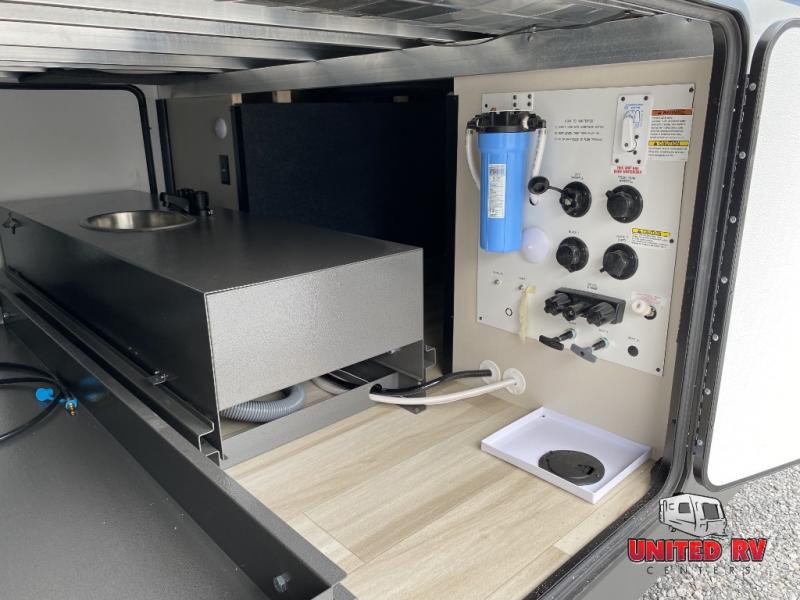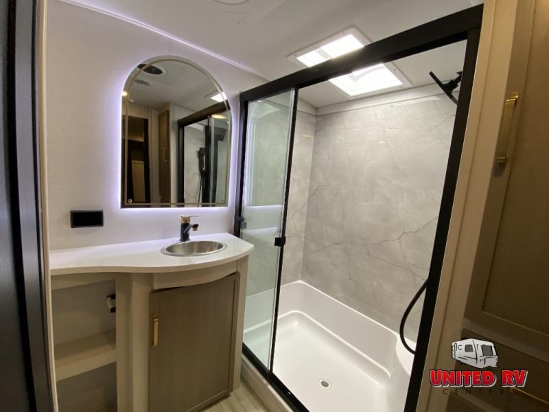 This Salem Hemisphere Elite fifth wheel is quite literally going to amaze you! The exterior has an extensive amount of storage space with its three pass-through storage compartments. The interior also has many storage locations, like the pantry for your dry and canned goods, 20-cubic foot refrigerator, additional storage over the half bath, linen closet, bedroom dresser, and bathroom wardrobe. In the master suite, you'll find extra space with an extra-wide bed slide, and the residential walk-in shower with skylight is going to make morning routines enjoyable. Each day you can sit down in one of the swivel bar stools at the breakfast bar and take in the beautiful views from the panoramic windows. You'll also love to spend your time at the front in the separate living room relaxing on one of the two tri-fold sofas or on the theater seating.