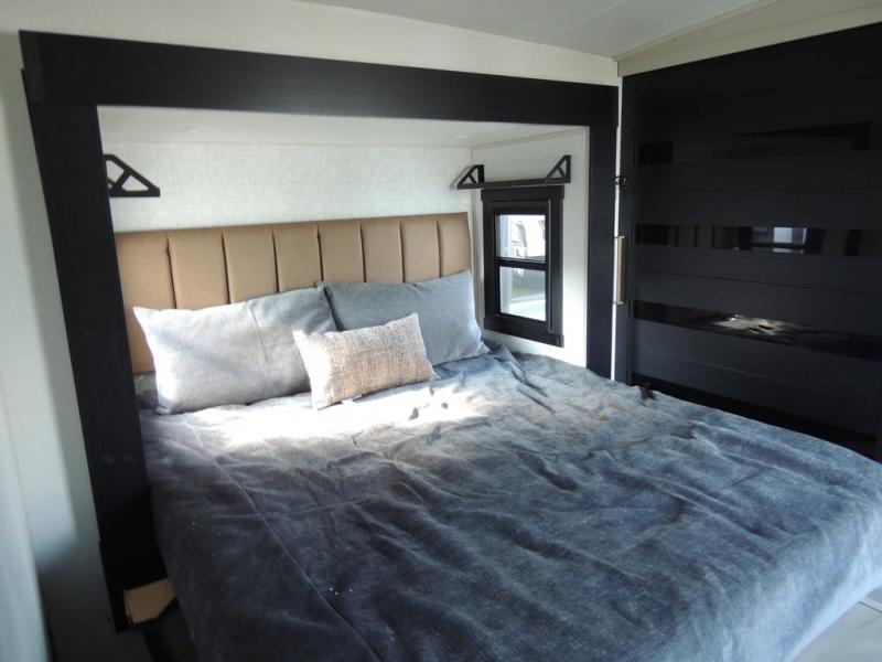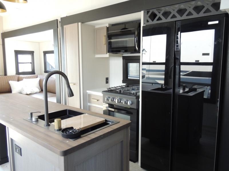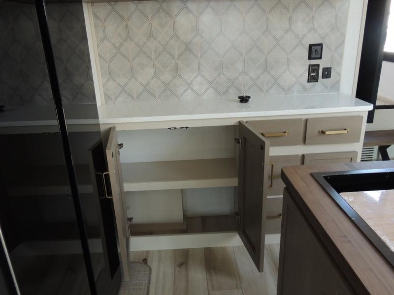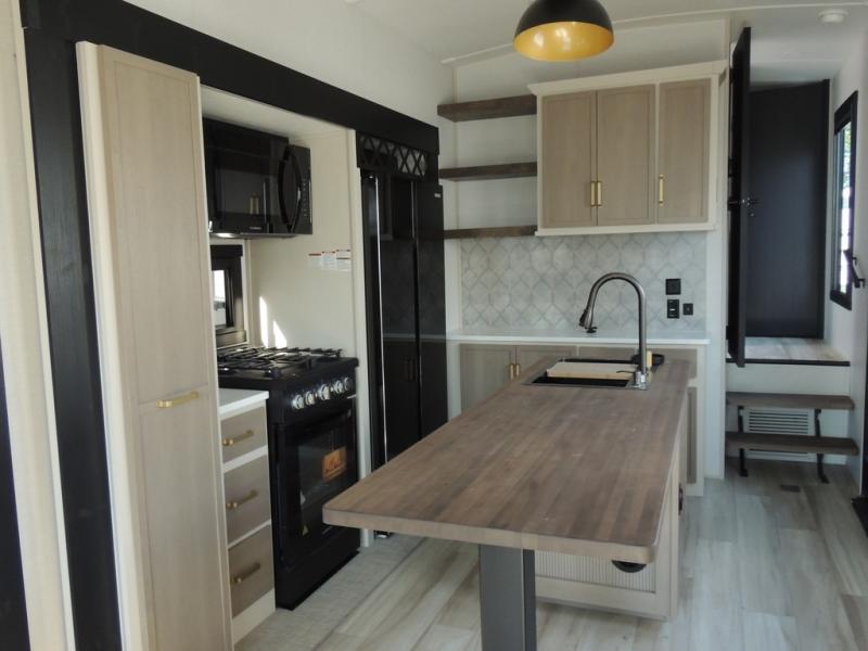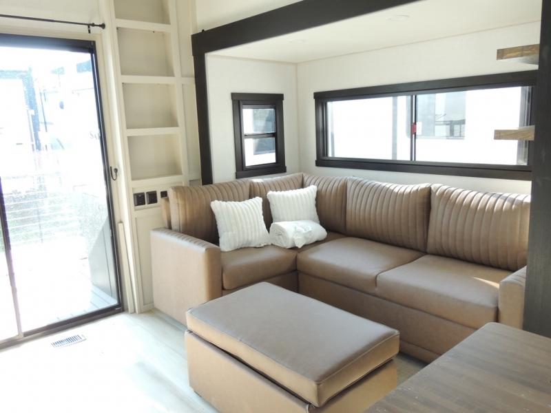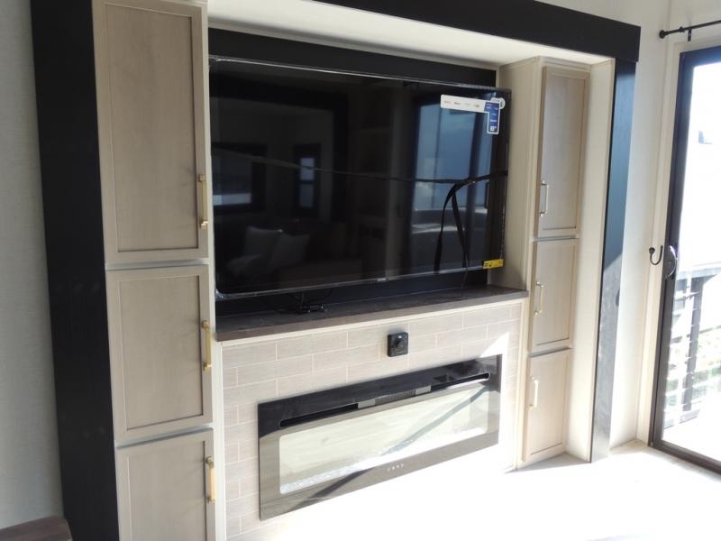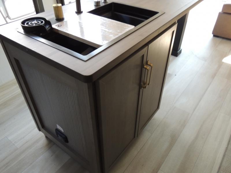 Camping trips and extended stays just got sweeter in this spacious fifth wheel! The rear veranda/porch with a kitchen lets you grill up some burgers as you visit in your camp chairs with friends. Once you head inside, you can make it a movie night since there is a sectional sofa with an ottoman across from the 65" TV and fireplace. A kitchen island with four chairs provides a place to dine together, and there is plenty of food storage between the pantry and 16 cu. ft. 12V refrigerator. You'll love having a custom king bed slide in the front bedroom, along with a dresser and a bench, a wardrobe, plus washer and dryer prep!