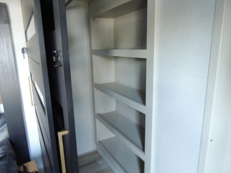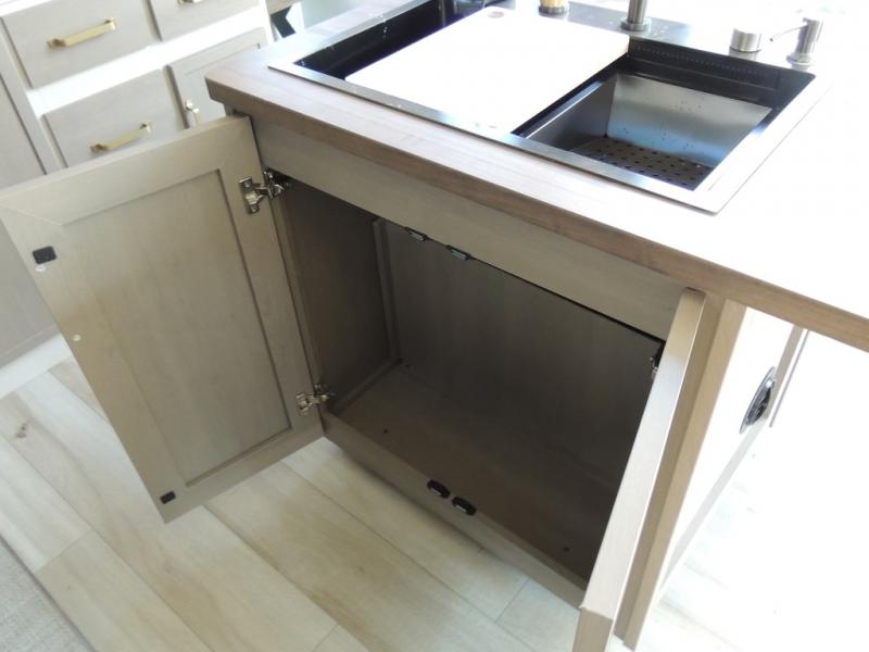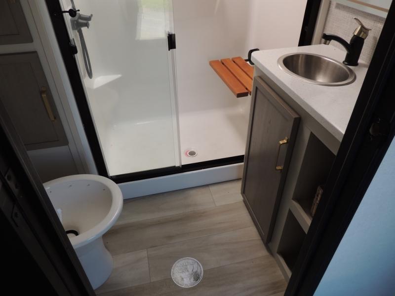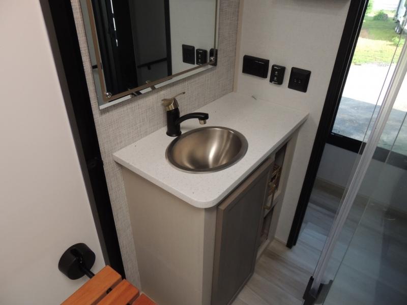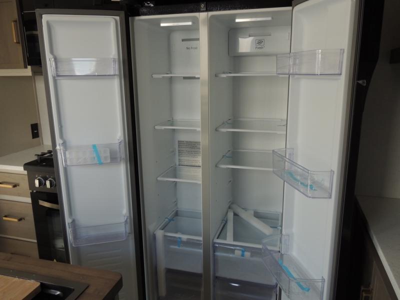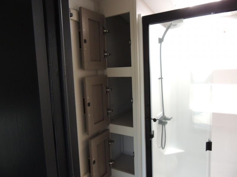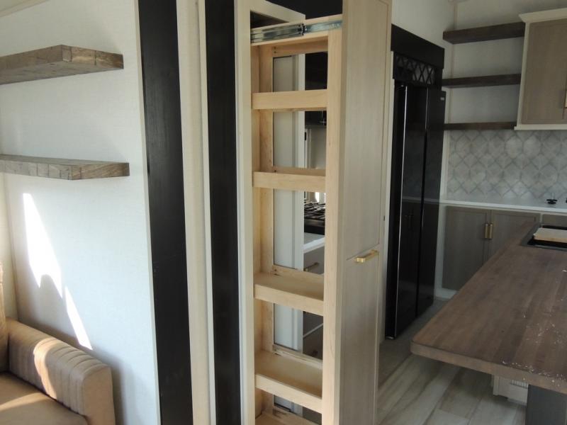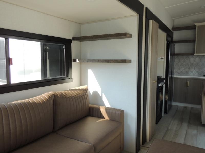 Camping trips and extended stays just got sweeter in this spacious fifth wheel! The rear veranda/porch with a kitchen lets you grill up some burgers as you visit in your camp chairs with friends. Once you head inside, you can make it a movie night since there is a sectional sofa with an ottoman across from the 65" TV and fireplace. A kitchen island with four chairs provides a place to dine together, and there is plenty of food storage between the pantry and 16 cu. ft. 12V refrigerator. You'll love having a custom king bed slide in the front bedroom, along with a dresser and a bench, a wardrobe, plus washer and dryer prep!