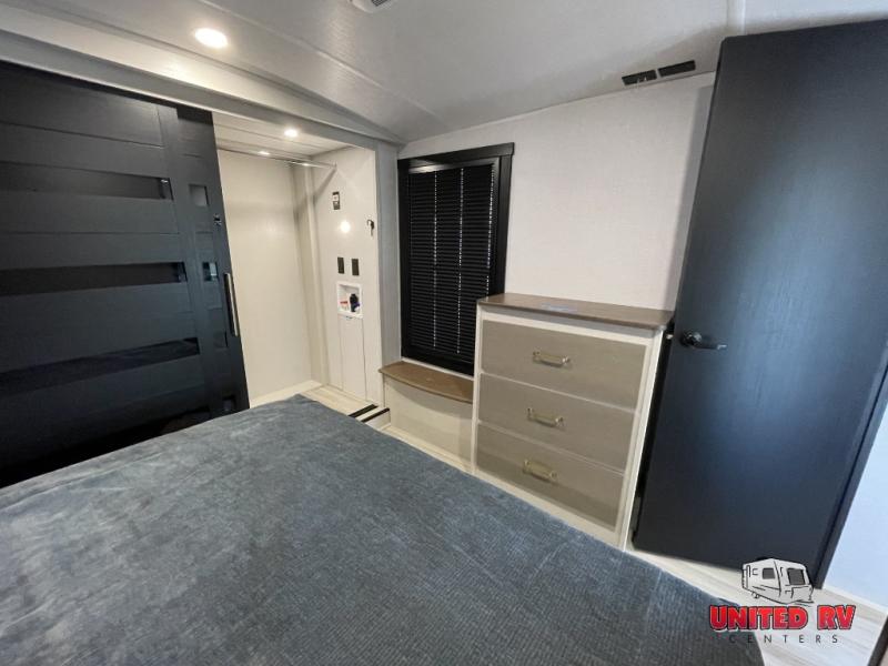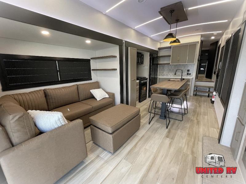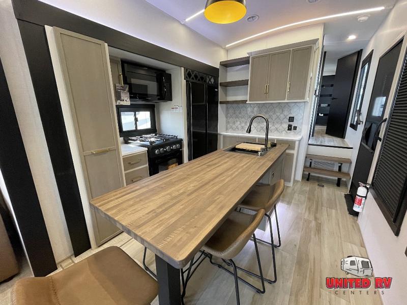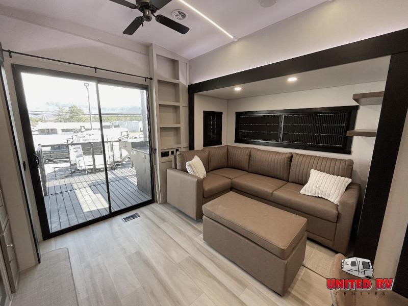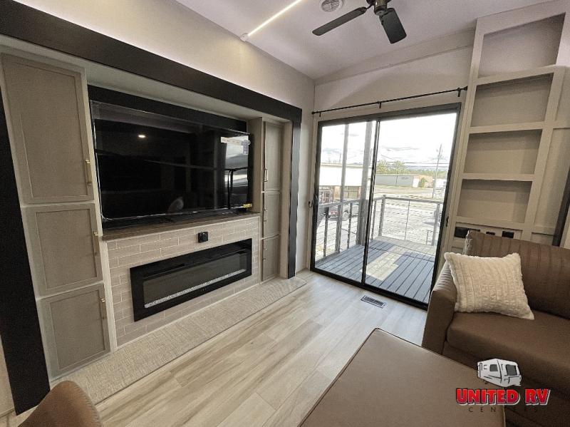Camping trips and extended stays just got sweeter in this spacious fifth wheel! The rear veranda/porch with a kitchen lets you grill up some burgers as you visit in your camp chairs with friends. Once you head inside, you can make it a movie night since there is a sectional sofa with an ottoman across from the 65" TV and fireplace. A kitchen island with four chairs provides a place to dine together, and there is plenty of food storage between the pantry and 16 cu. ft. 12V refrigerator. You'll love having a custom king bed slide in the front bedroom, along with a dresser and a bench, a wardrobe, plus washer and dryer prep!