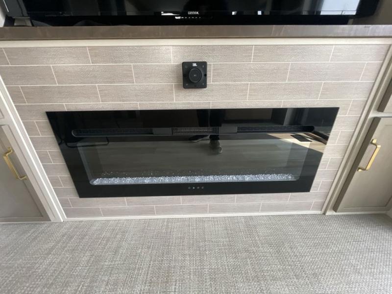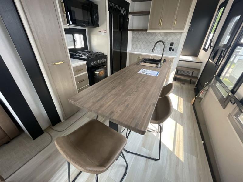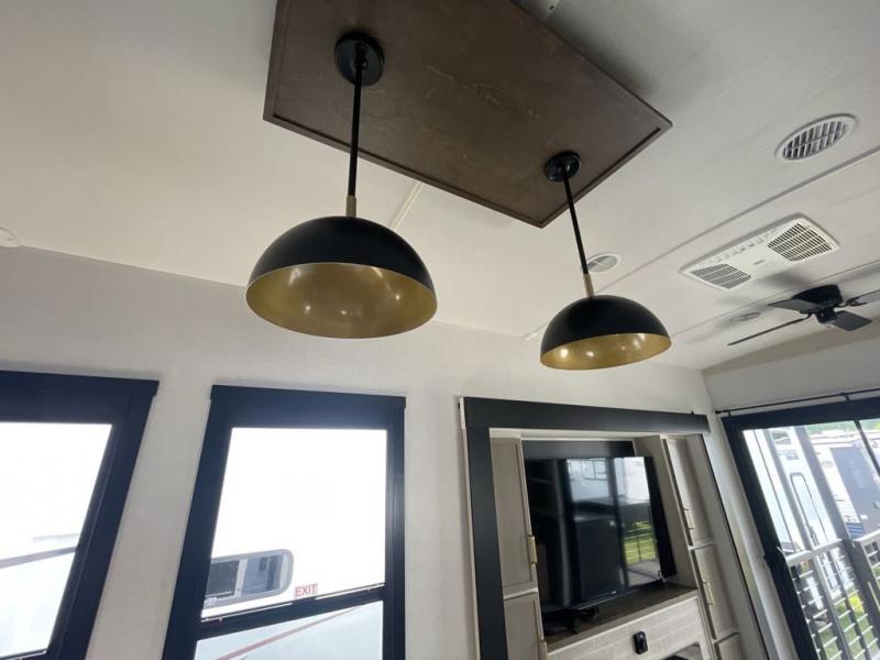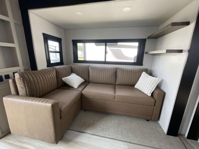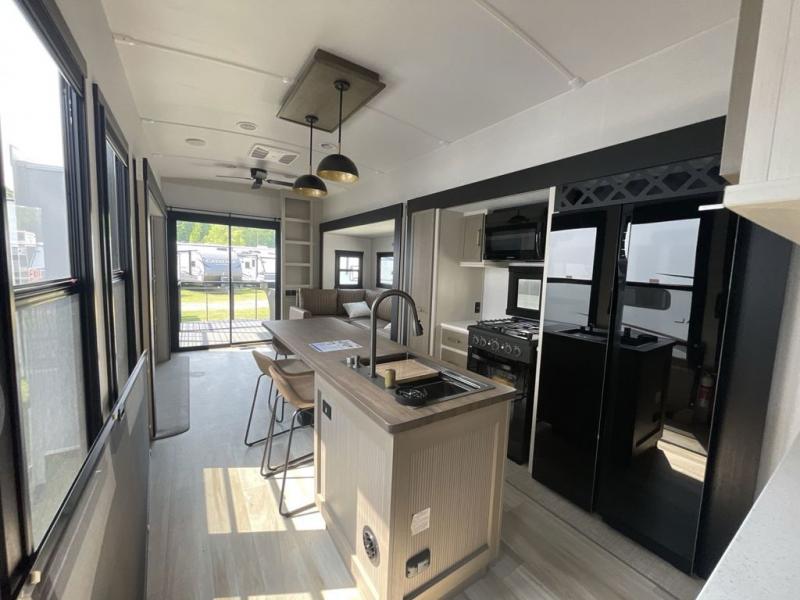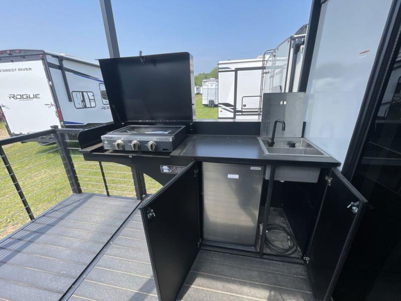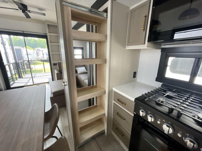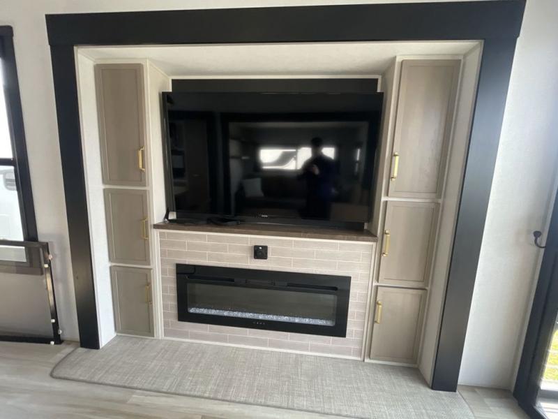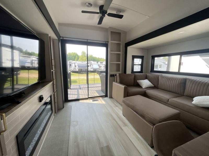 Camping trips and extended stays just got sweeter in this spacious fifth wheel! The rear veranda/porch with a kitchen lets you grill up some burgers as you visit in your camp chairs with friends. Once you head inside, you can make it a movie night since there is a sectional sofa with an ottoman across from the 65" TV and fireplace. A kitchen island with four chairs provides a place to dine together, and there is plenty of food storage between the pantry and 16 cu. ft. 12V refrigerator. You'll love having a custom king bed slide in the front bedroom, along with a dresser and a bench, a wardrobe, plus washer and dryer prep!