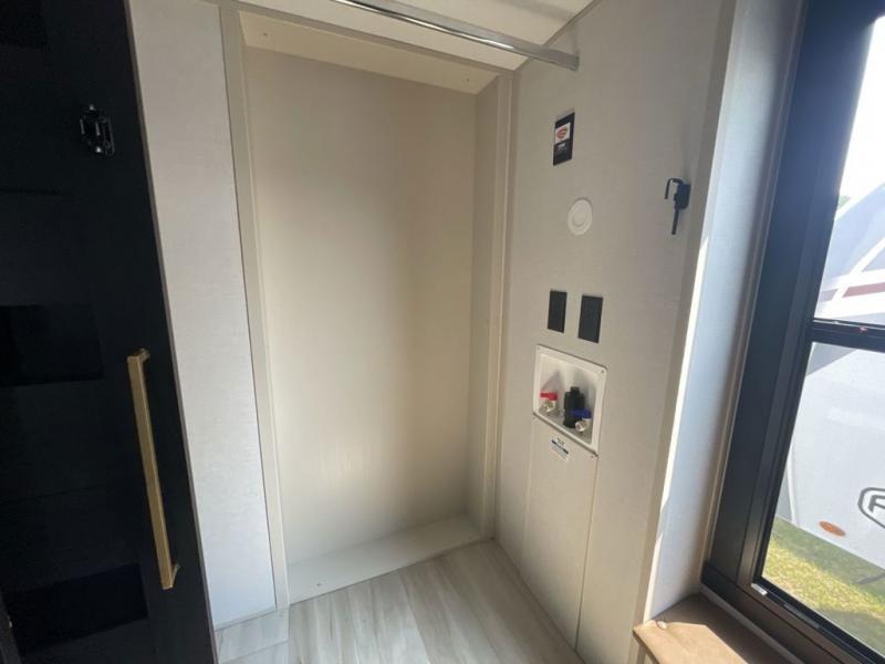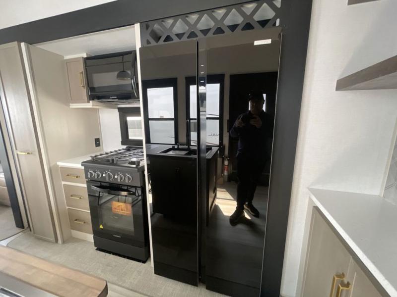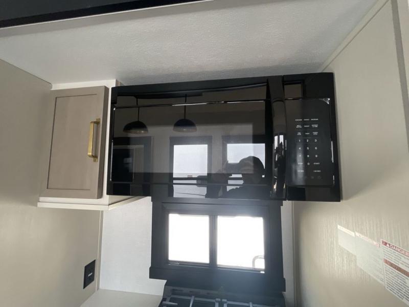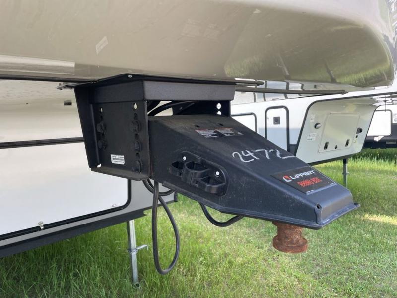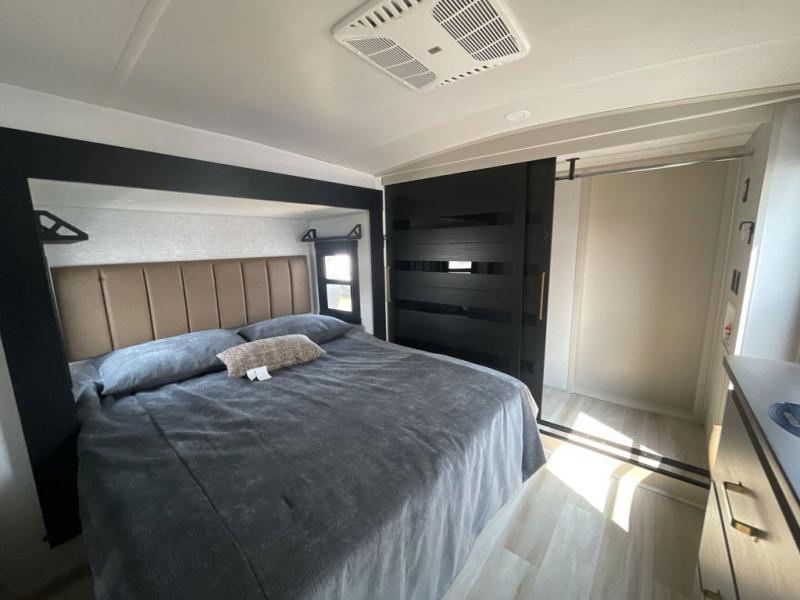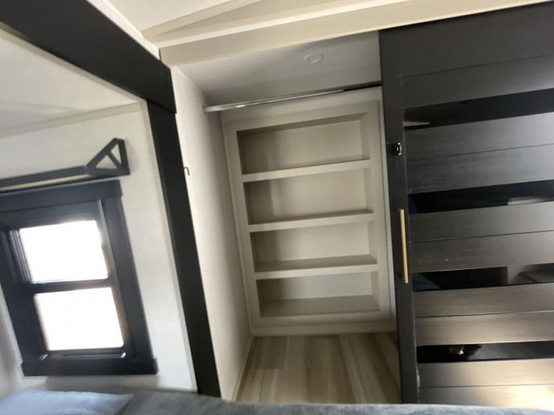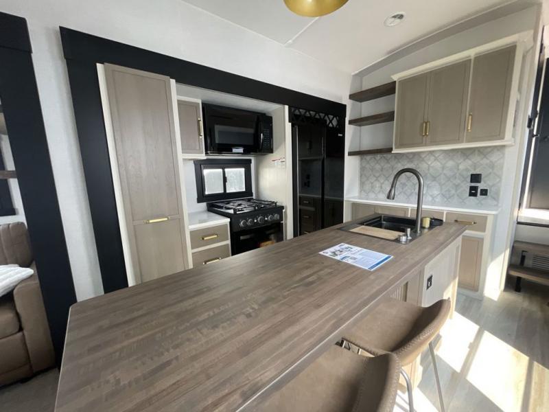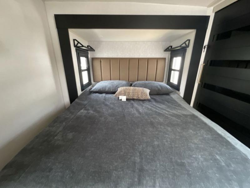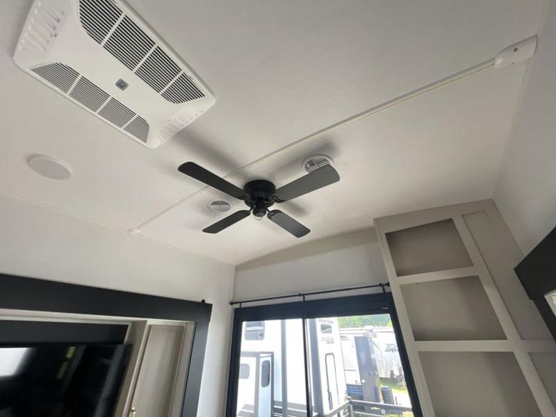 Camping trips and extended stays just got sweeter in this spacious fifth wheel! The rear veranda/porch with a kitchen lets you grill up some burgers as you visit in your camp chairs with friends. Once you head inside, you can make it a movie night since there is a sectional sofa with an ottoman across from the 65" TV and fireplace. A kitchen island with four chairs provides a place to dine together, and there is plenty of food storage between the pantry and 16 cu. ft. 12V refrigerator. You'll love having a custom king bed slide in the front bedroom, along with a dresser and a bench, a wardrobe, plus washer and dryer prep!
